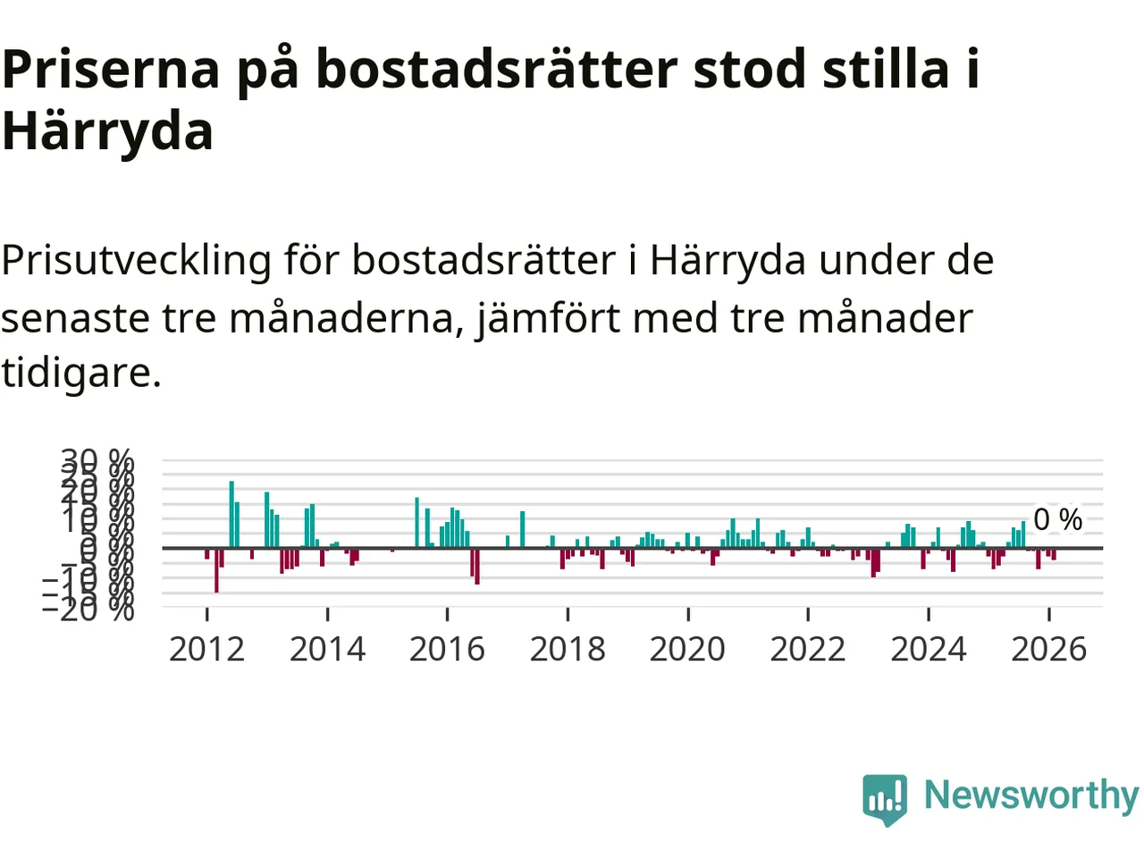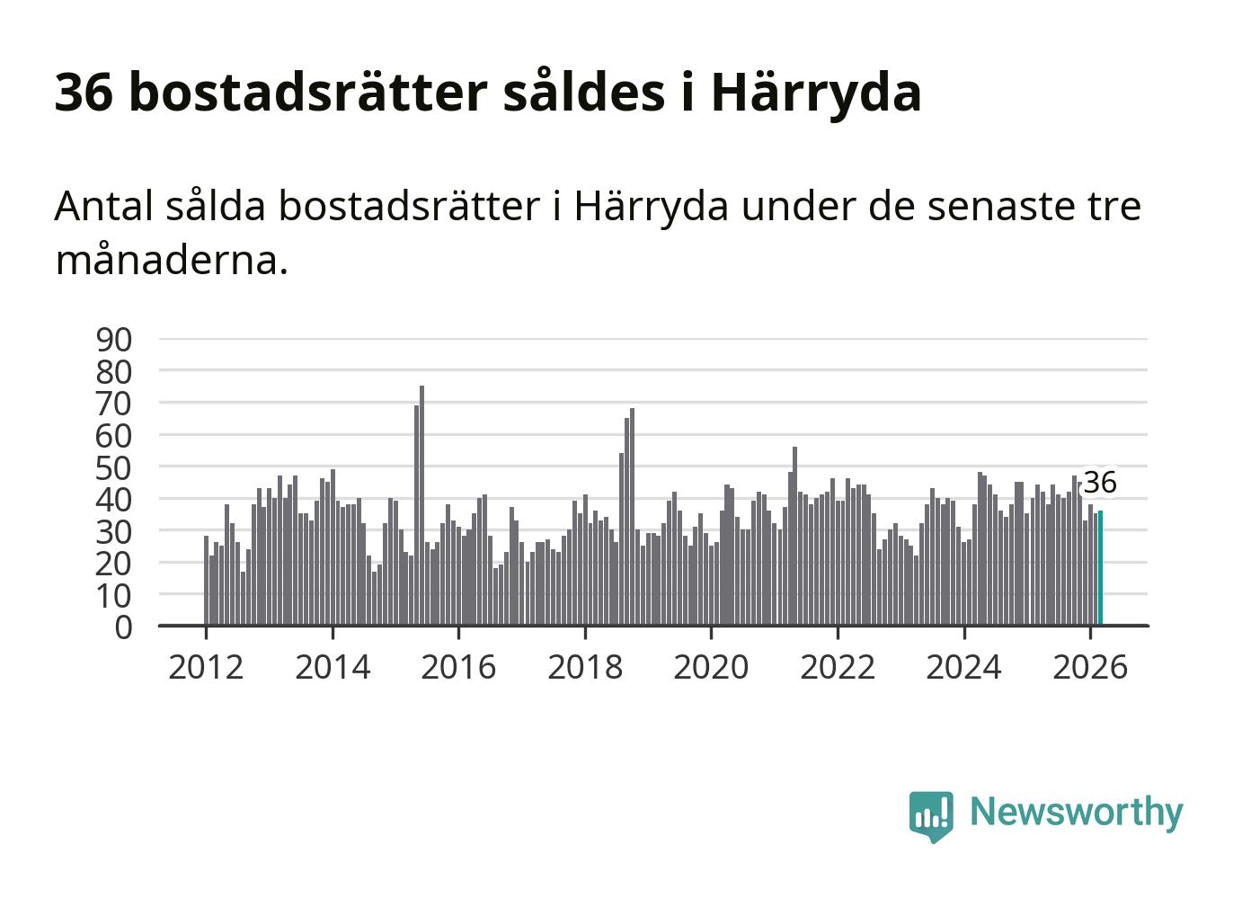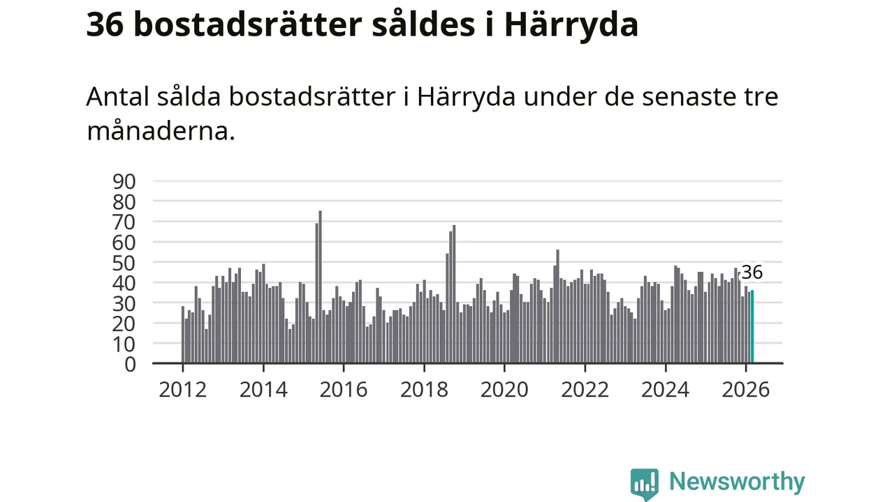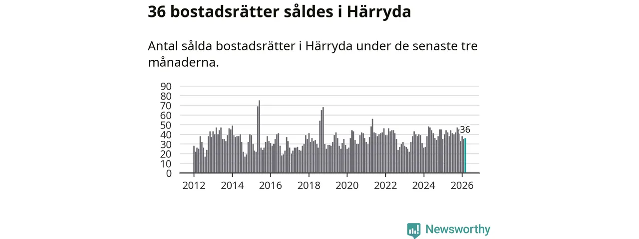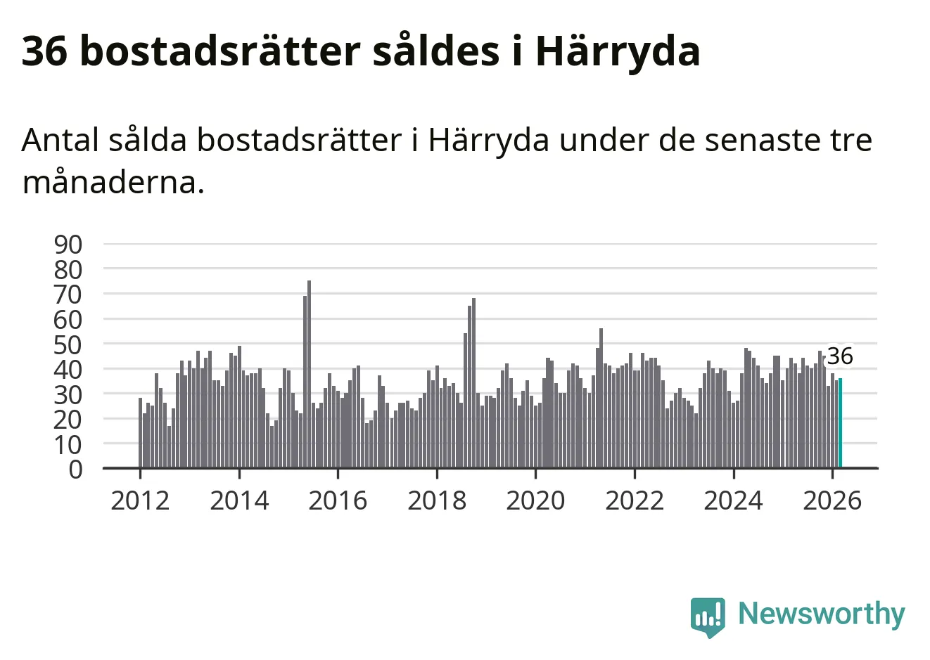 Sammanlagt såldes 36 bostadsrätter i Härryda kommun mellan januari och mars till ett genomsnittligt pris på 3,3 miljoner kronor. I fjol gjordes 44 affärer vid den här tiden på året.