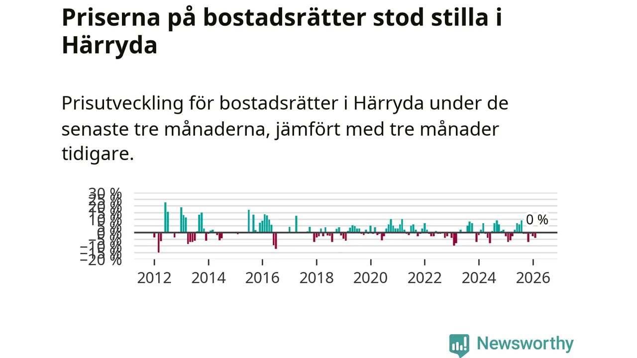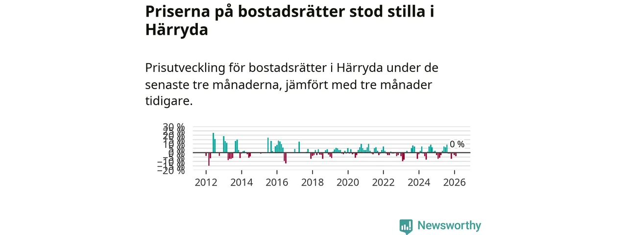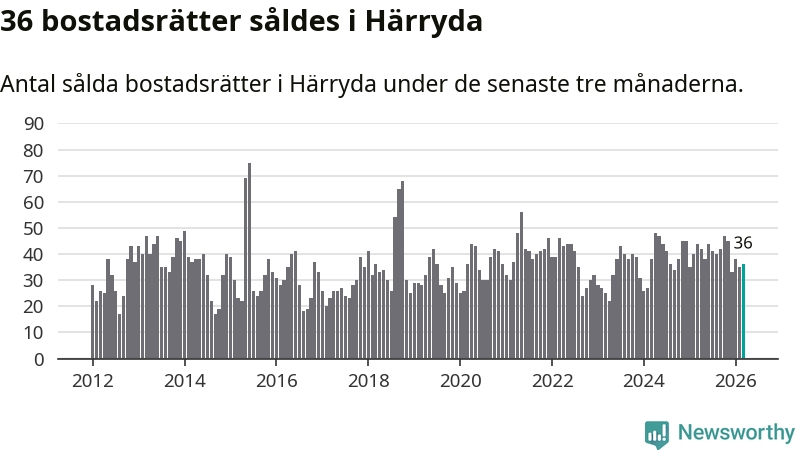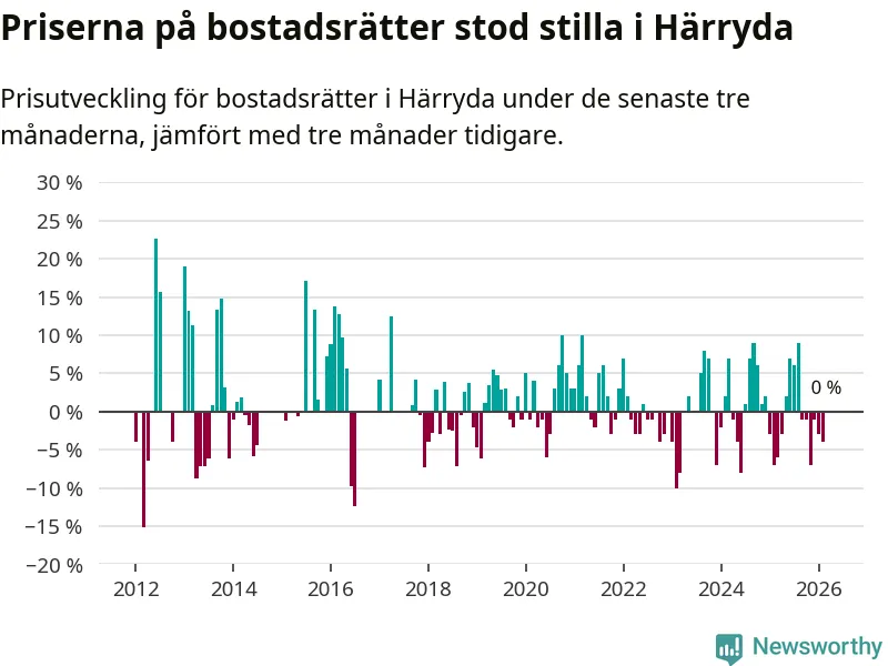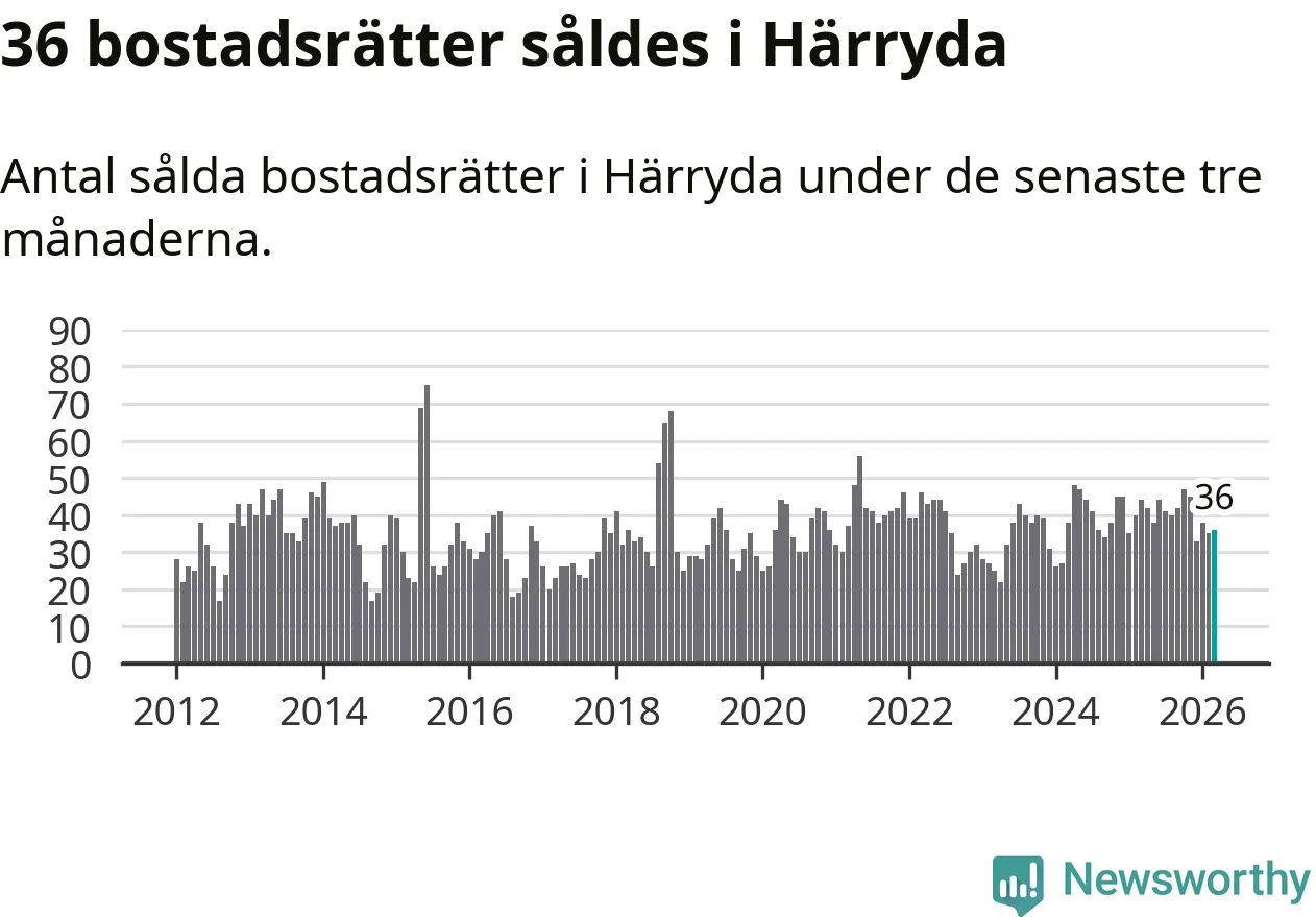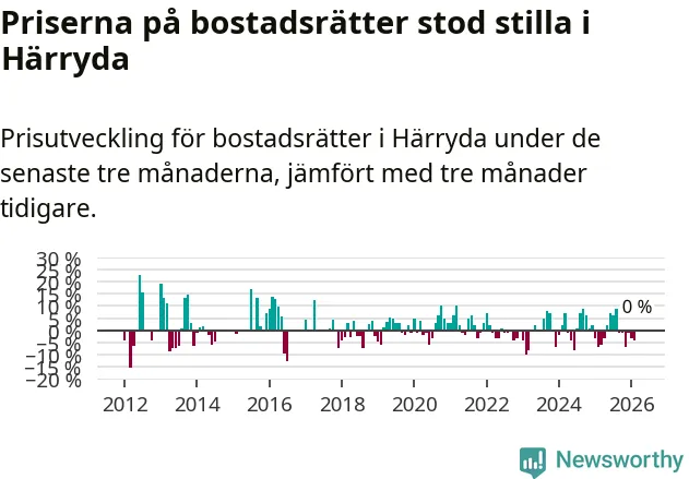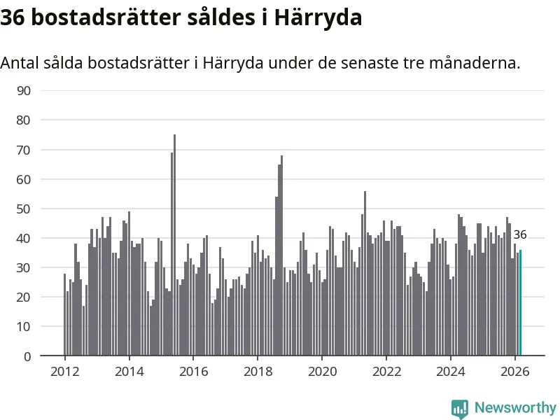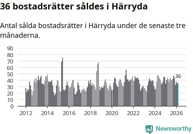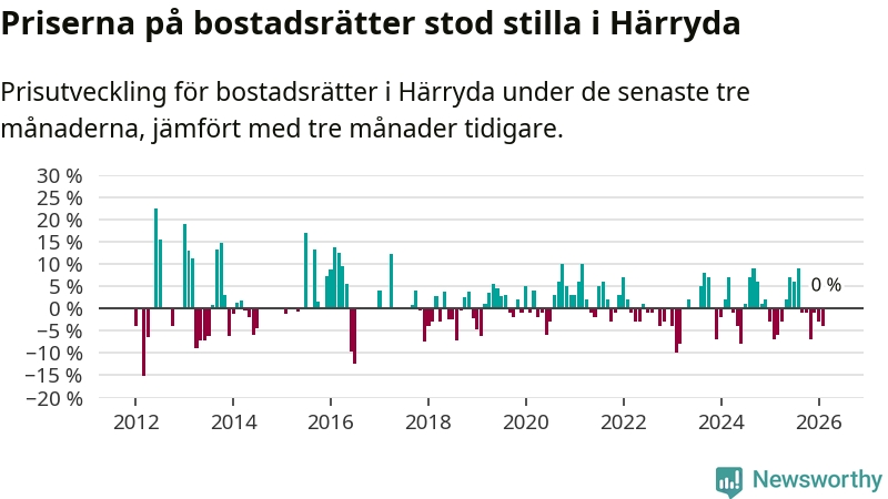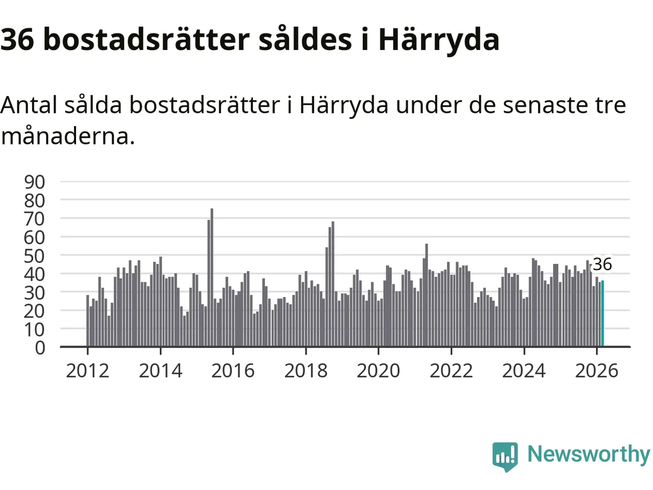 Sammanlagt såldes 36 bostadsrätter i Härryda kommun mellan januari och mars till ett genomsnittligt pris på 3,3 miljoner kronor. I fjol gjordes 44 affärer vid den här tiden på året.