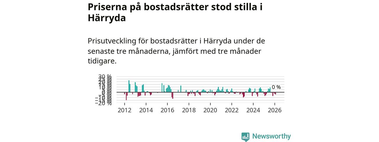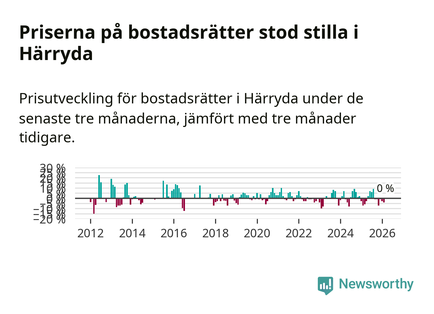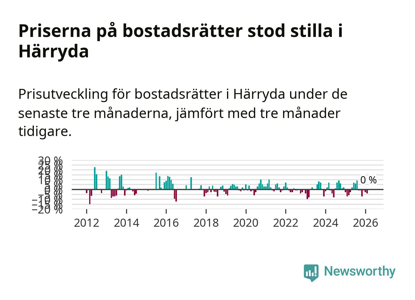 Priserna på bostadsrätter står i stort sett stilla i Härryda kommun. Medelpriset på de på försäljningarna under de senaste tre månaderna låg på samma nivå som för tre månader sedan.