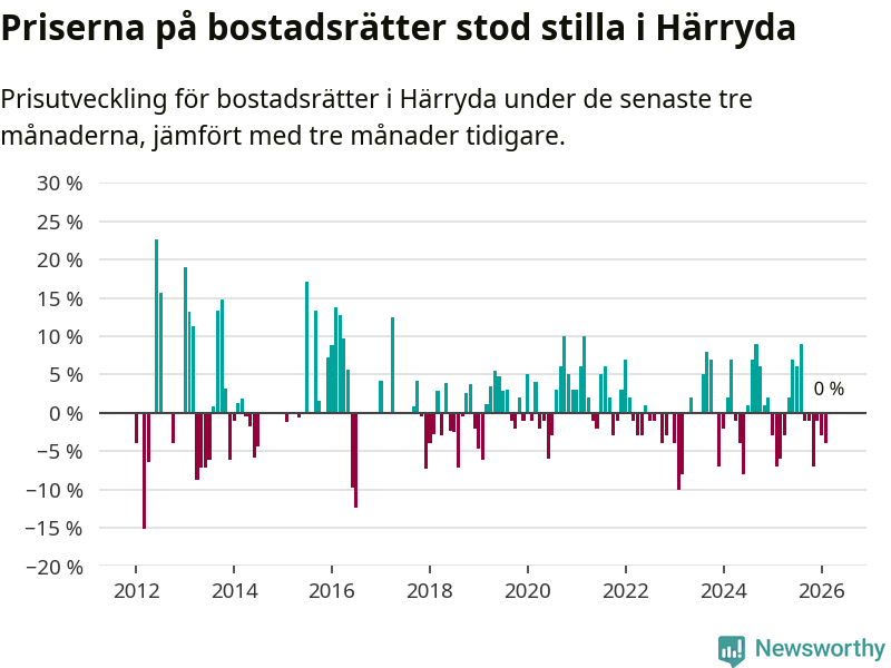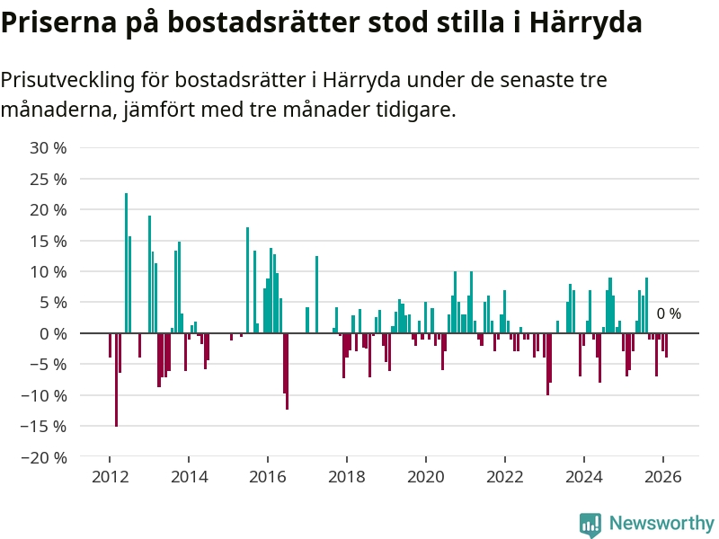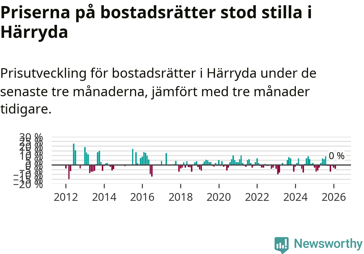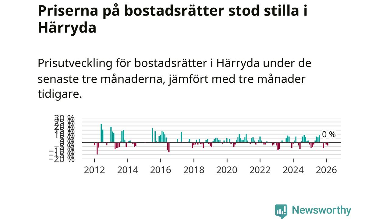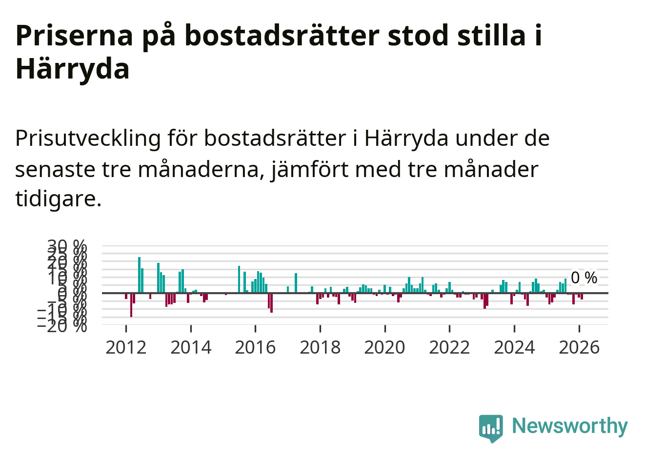 Priserna på bostadsrätter står i stort sett stilla i Härryda kommun. Medelpriset på de på försäljningarna under de senaste tre månaderna låg på samma nivå som för tre månader sedan.