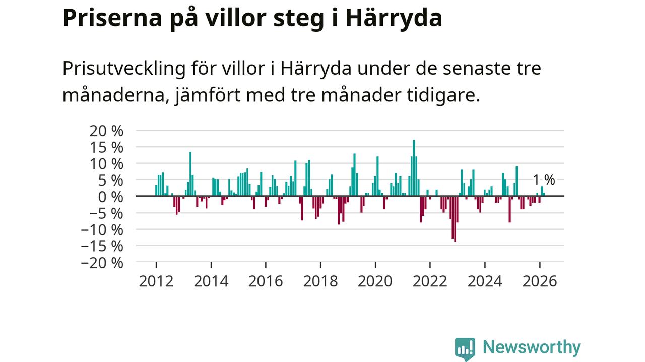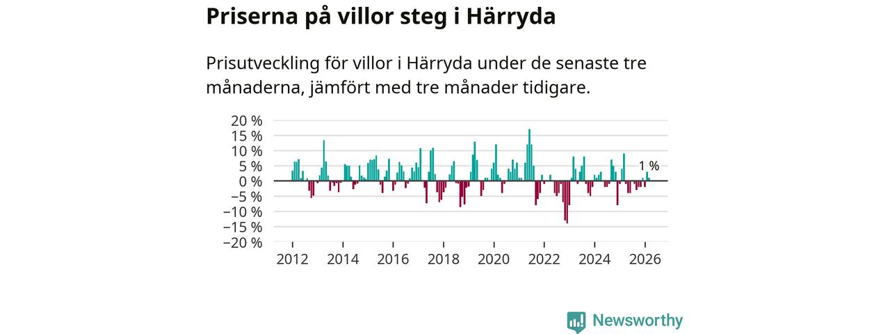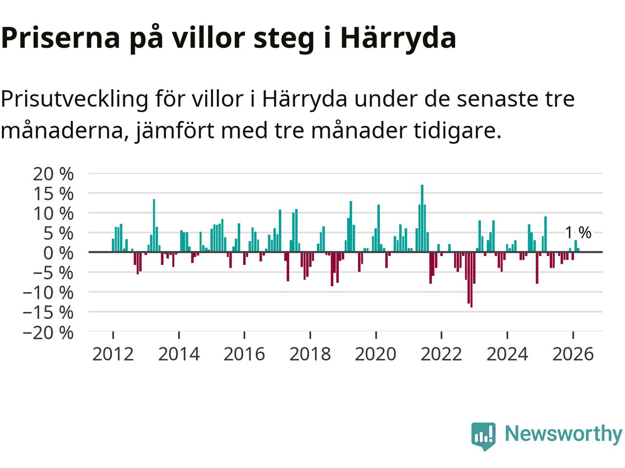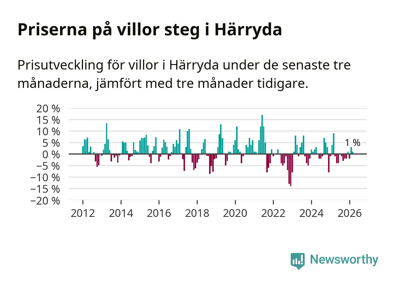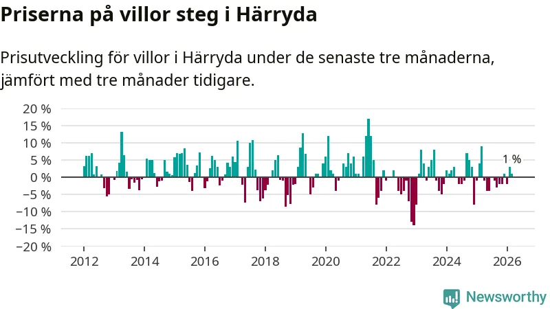 Villapriserna har gått upp i Härryda kommun. Medelpriset på försäljningarna under de senaste tre månaderna visar på en uppgång med 1 procent.