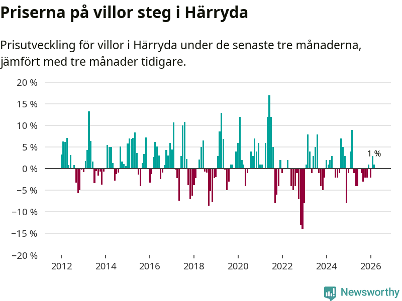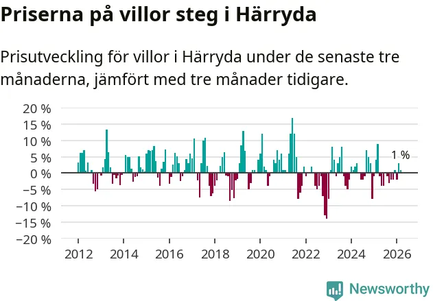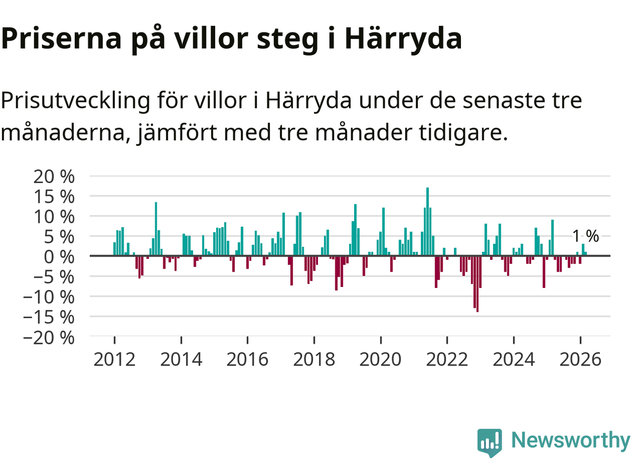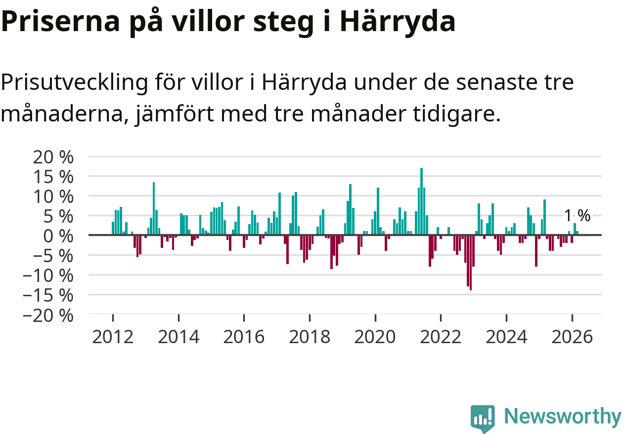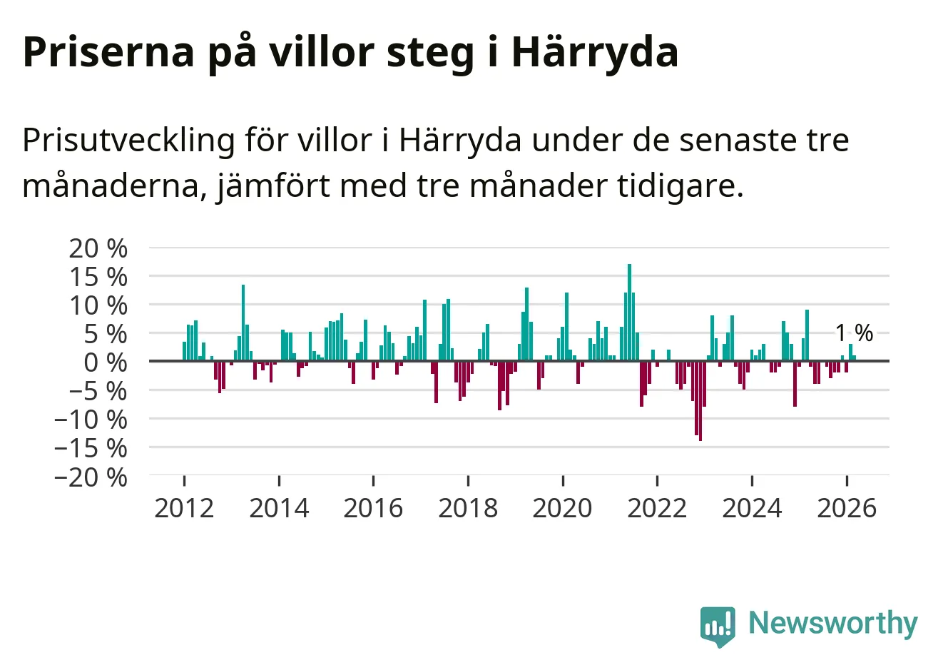 Villapriserna har gått upp i Härryda kommun. Medelpriset på försäljningarna under de senaste tre månaderna visar på en uppgång med 1 procent.