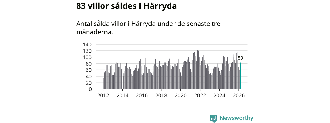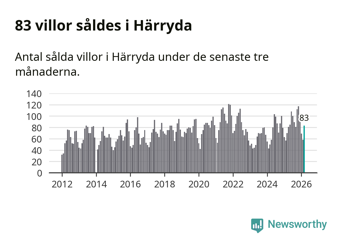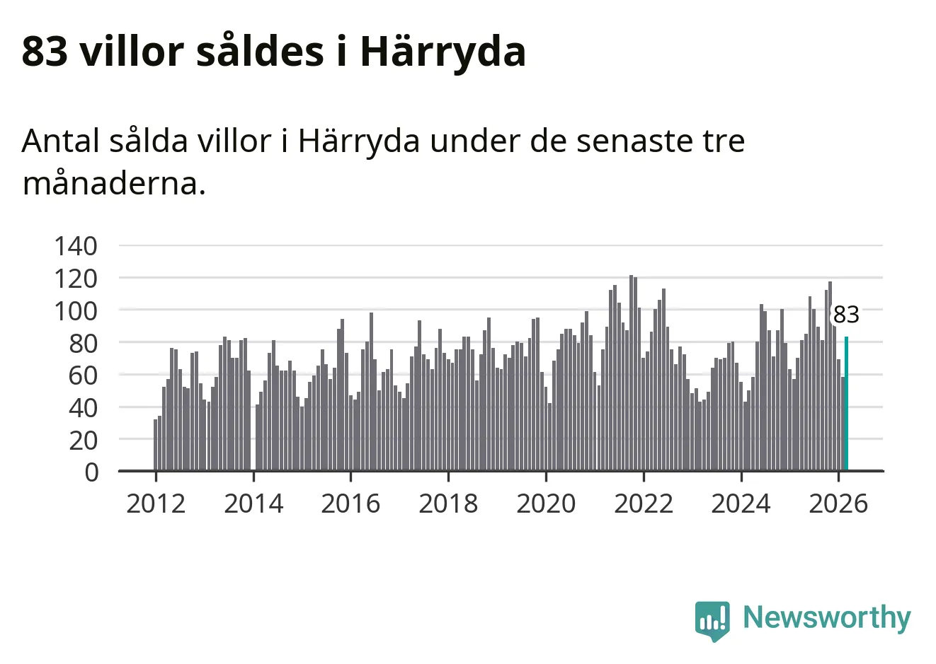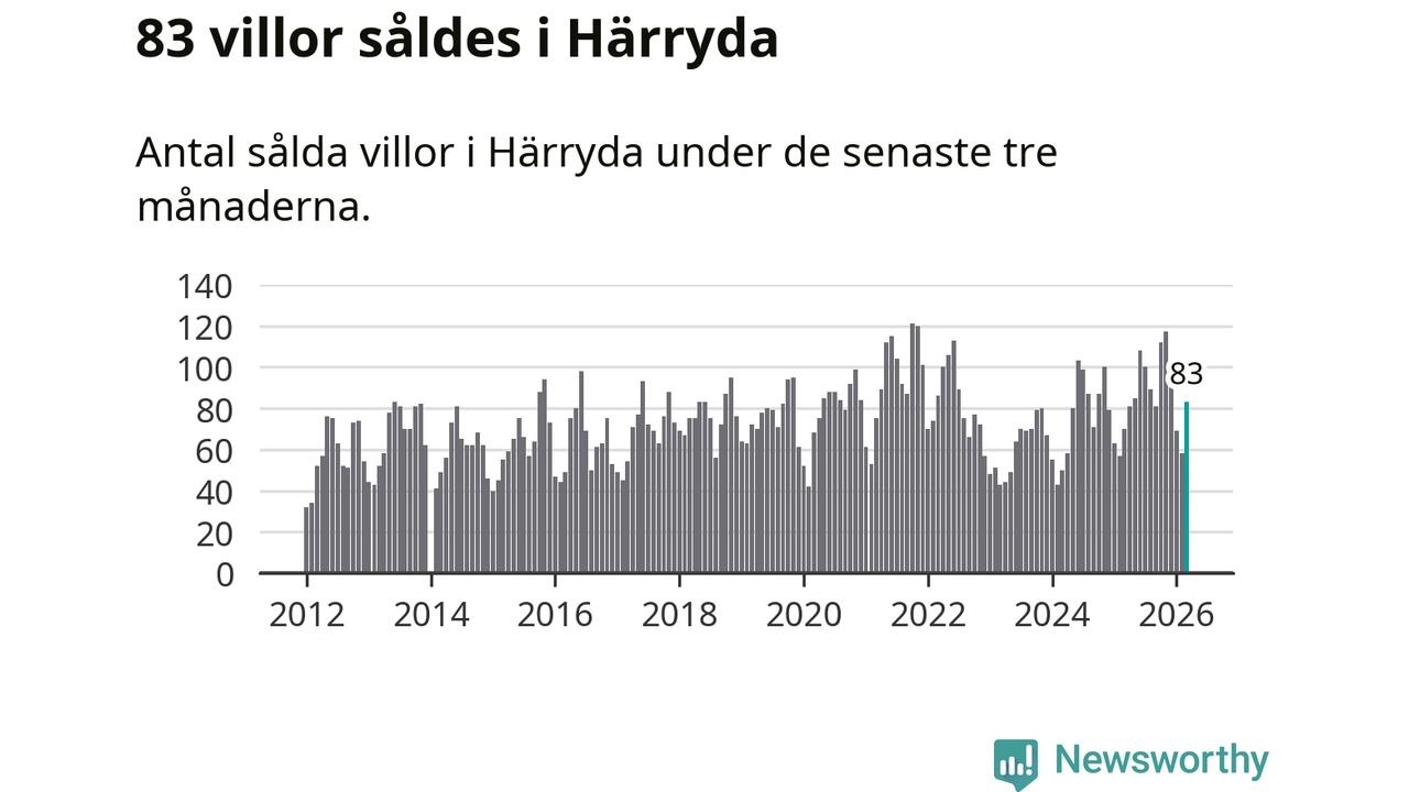Sammanlagt såldes 83 villor i Härryda kommun mellan januari och mars till ett genomsnittligt pris på 5,3 miljoner kronor. I fjol gjordes 70 affärer vid den här tiden på året.