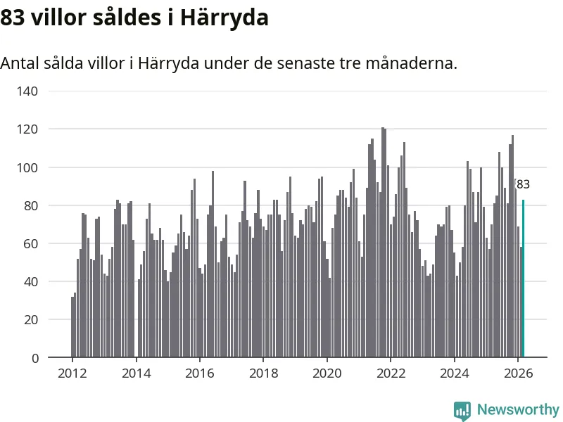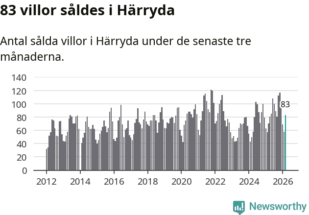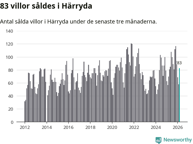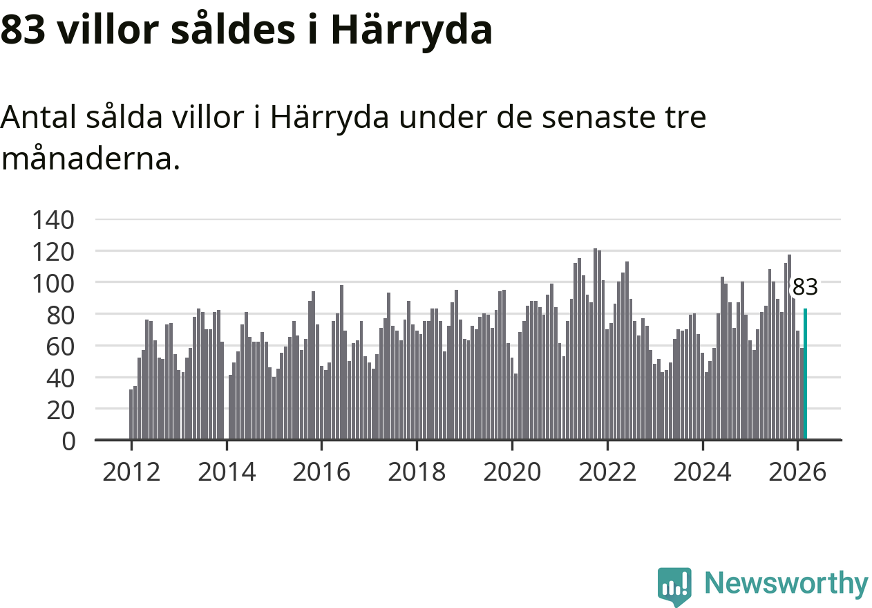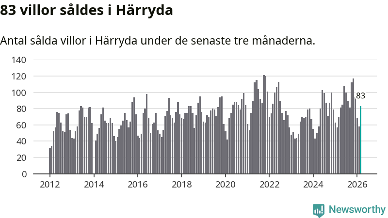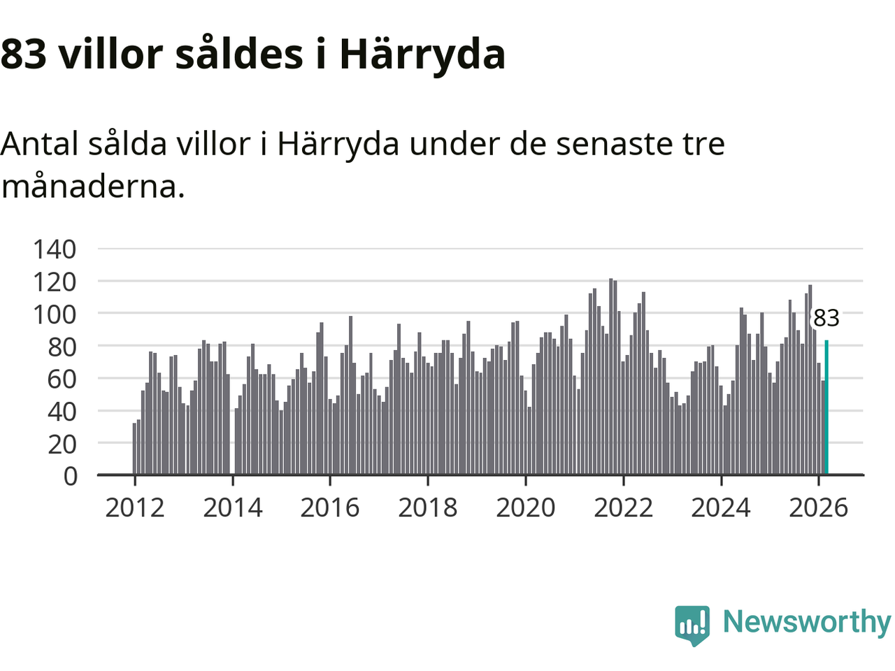 Sammanlagt såldes 83 villor i Härryda kommun mellan januari och mars till ett genomsnittligt pris på 5,3 miljoner kronor. I fjol gjordes 70 affärer vid den här tiden på året.