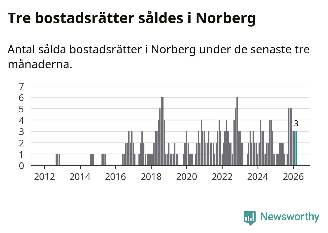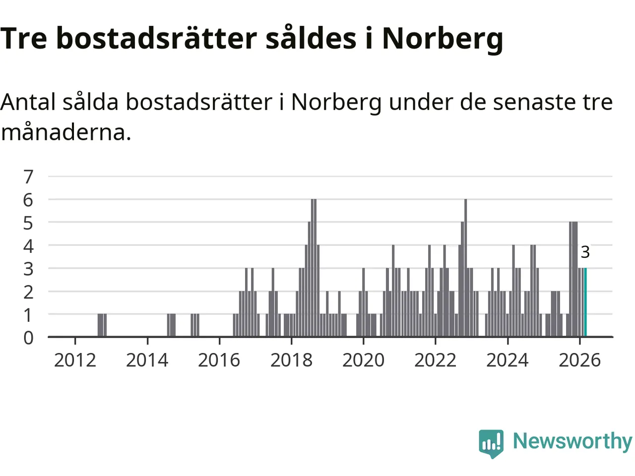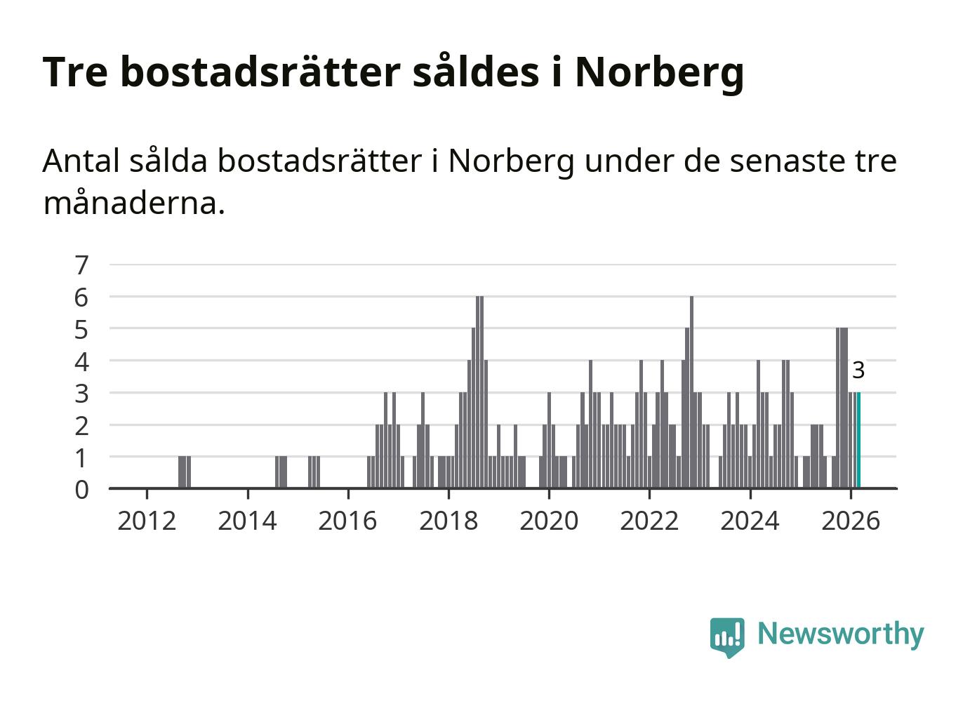 Mellan januari och mars gjordes sammanlagt tre affärer med bostadsrätter i Norbergs kommun. Det kan jämföras med ett vid motsvarande tid i fjol.