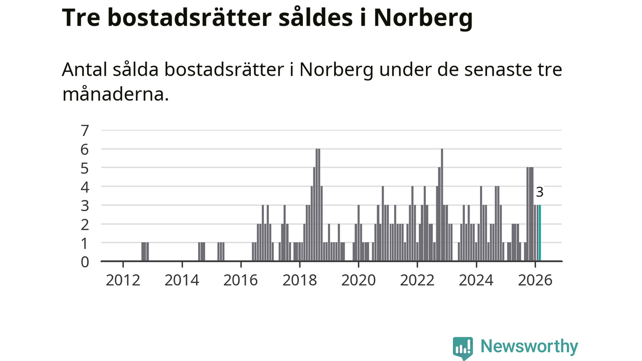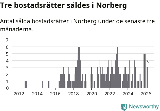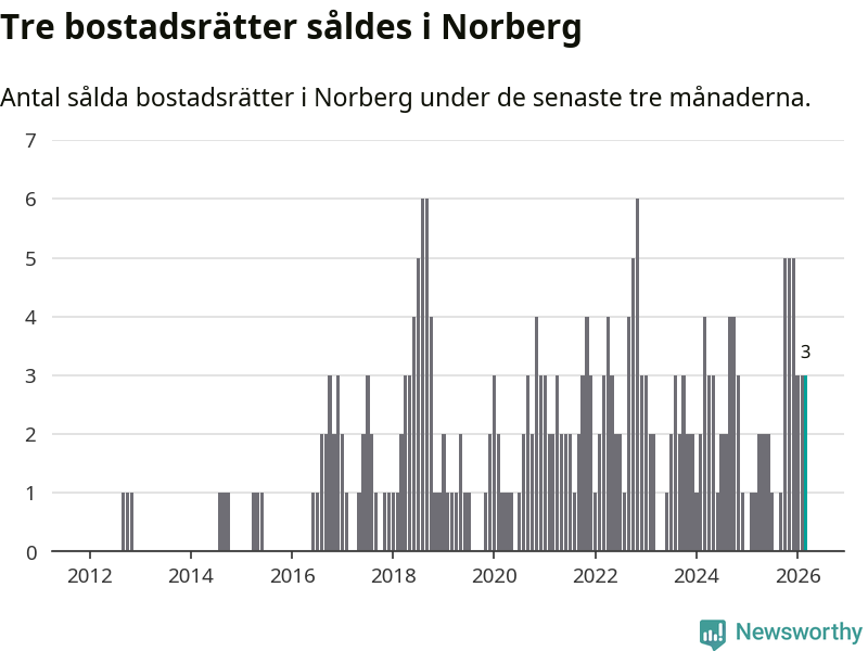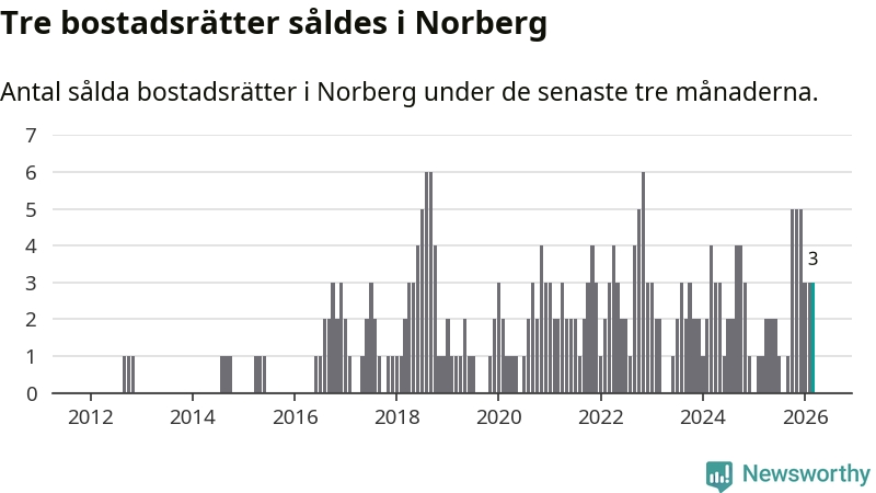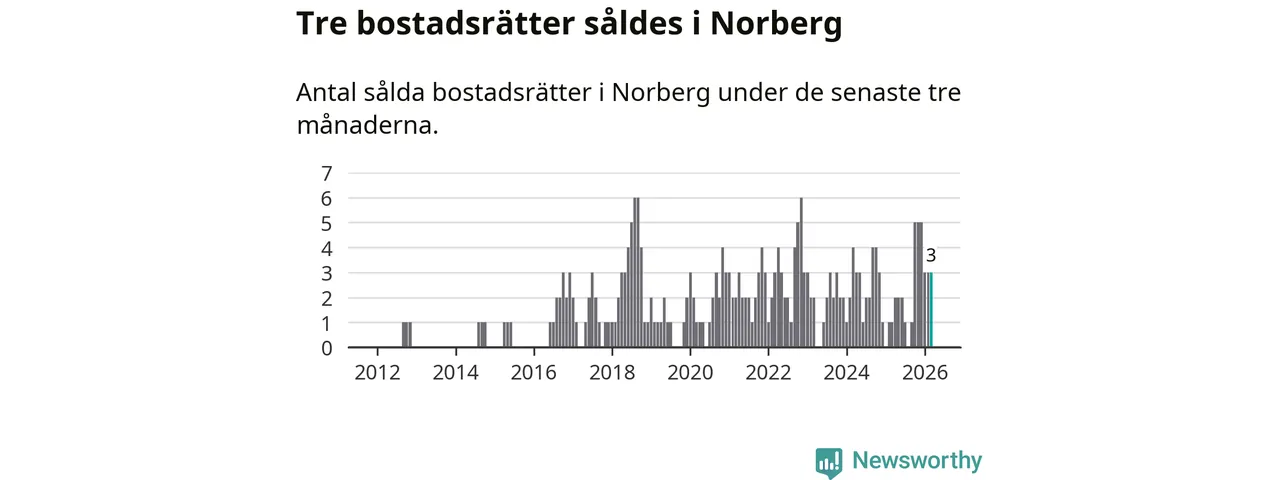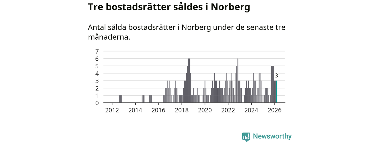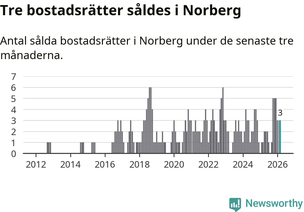 Mellan januari och mars gjordes sammanlagt tre affärer med bostadsrätter i Norbergs kommun. Det kan jämföras med ett vid motsvarande tid i fjol.