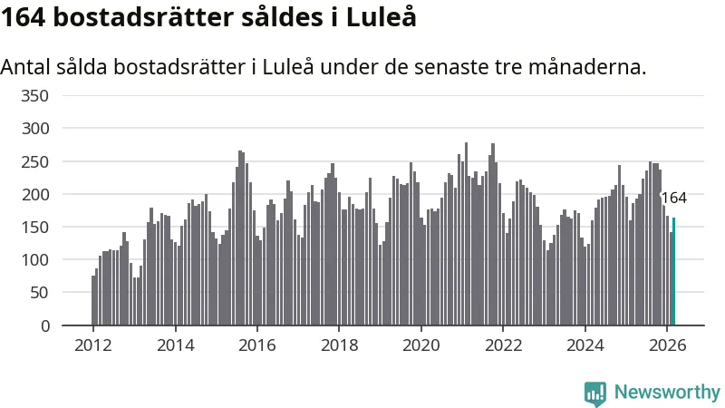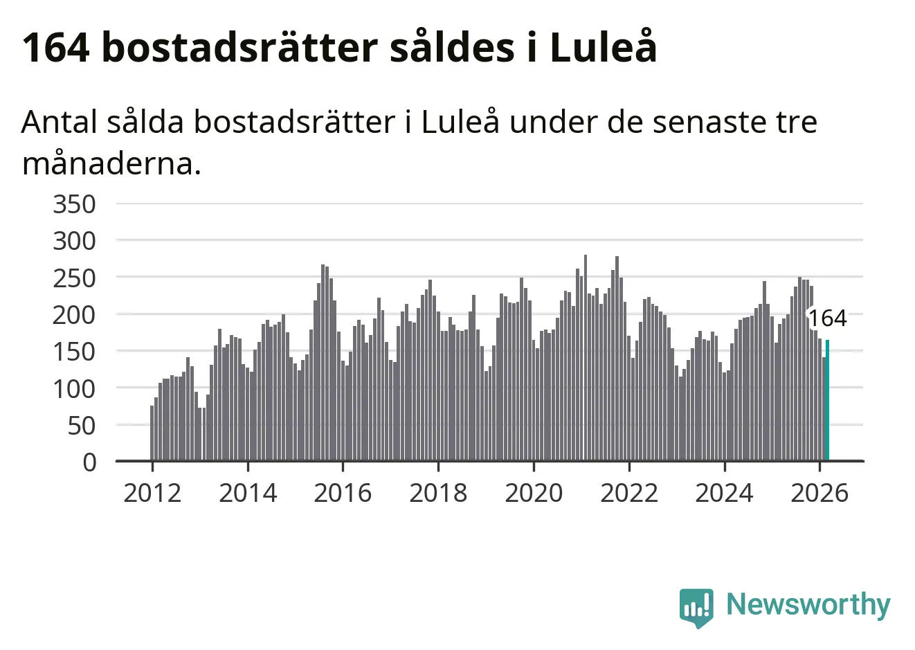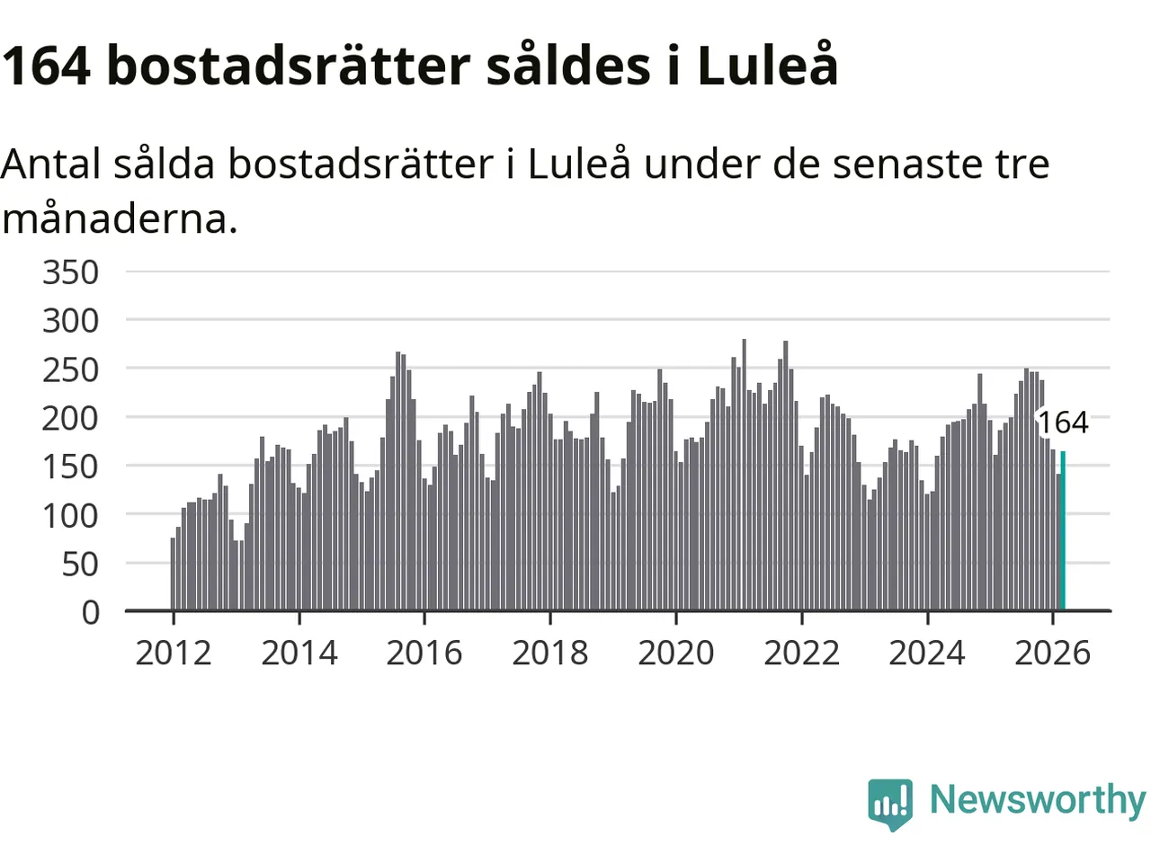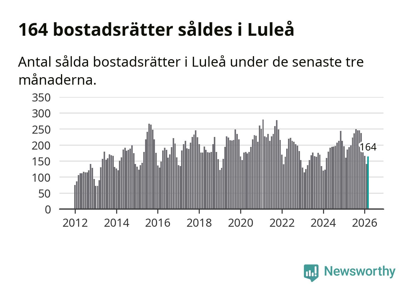 Sammanlagt såldes 164 bostadsrätter i Luleå kommun mellan januari och mars till ett genomsnittligt pris på 2,1 miljoner kronor. I fjol gjordes 186 affärer vid den här tiden på året.
