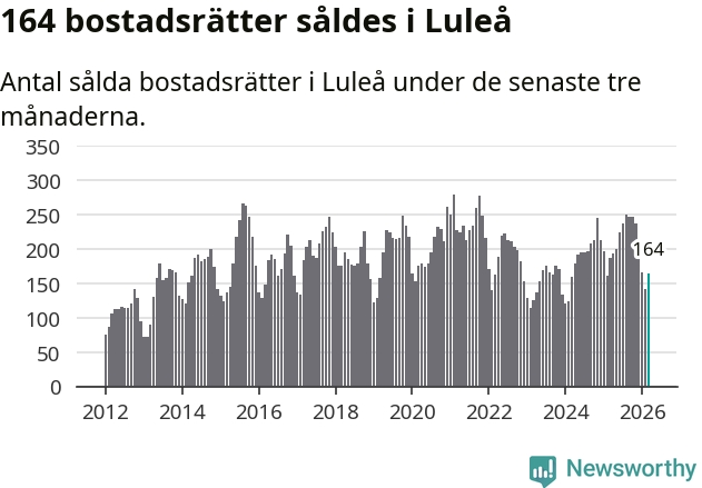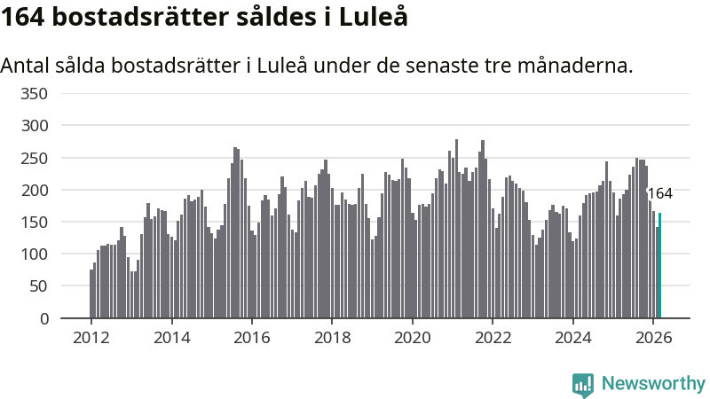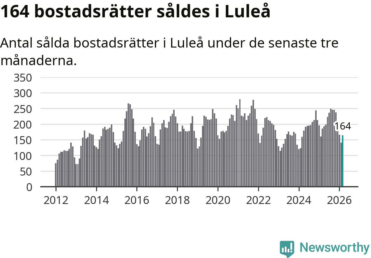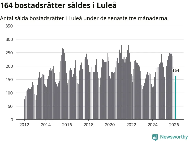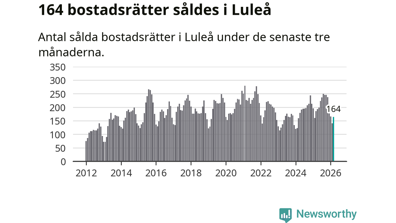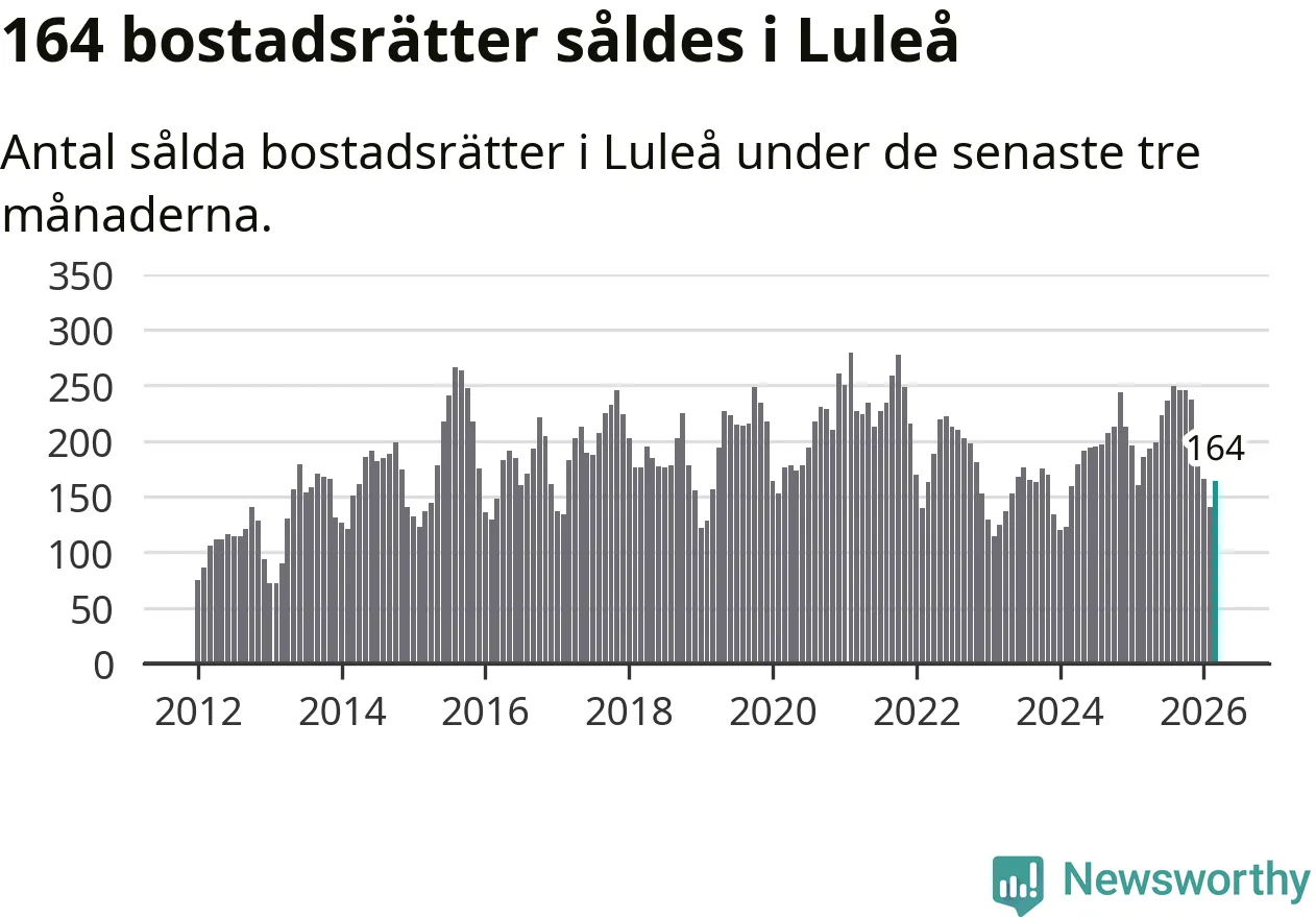 Sammanlagt såldes 164 bostadsrätter i Luleå kommun mellan januari och mars till ett genomsnittligt pris på 2,1 miljoner kronor. I fjol gjordes 186 affärer vid den här tiden på året.