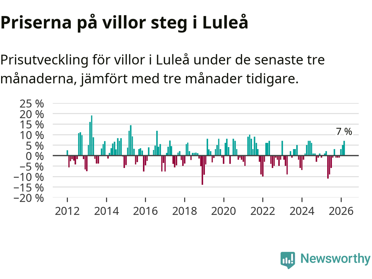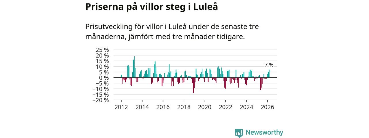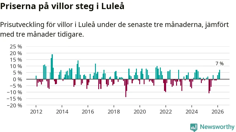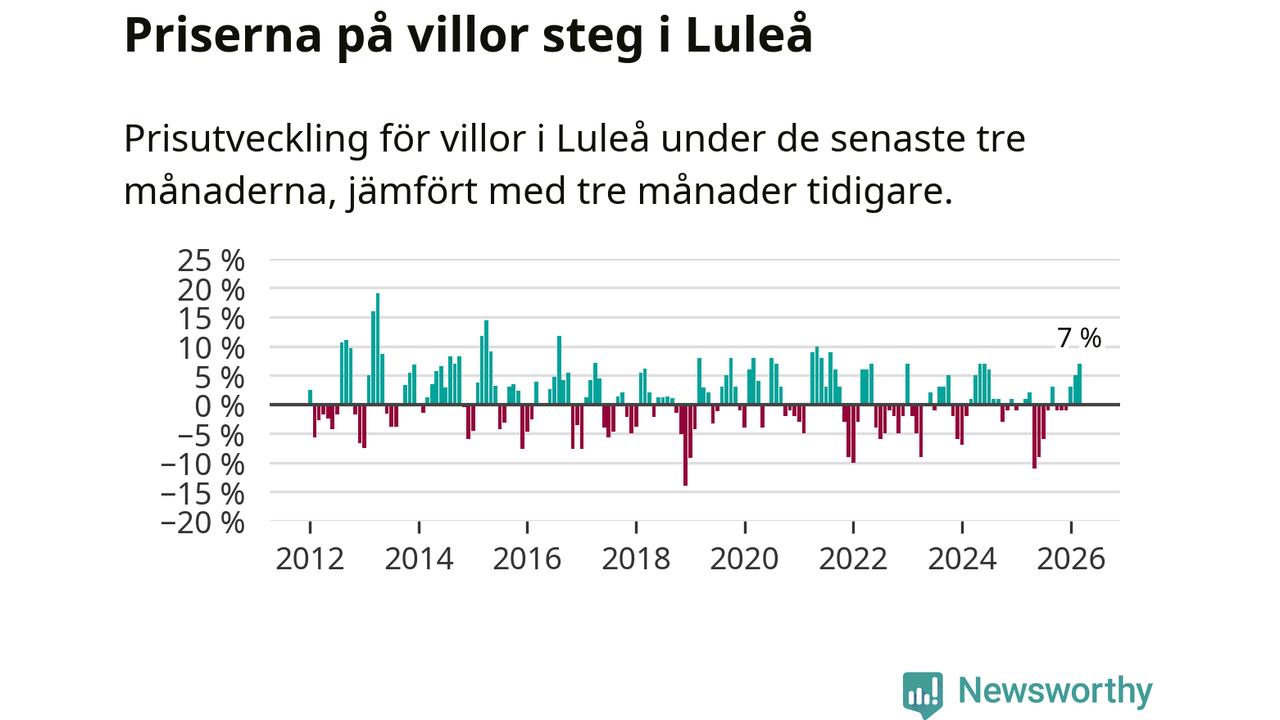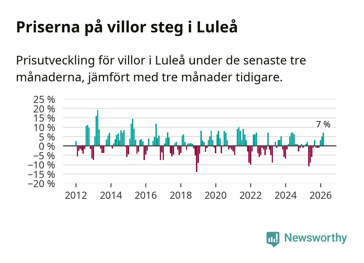 Villapriserna steg mellan januari och mars med 7 procent i Luleå kommun. Det är en betydande uppgång jämfört med det gångna året då priserna i snitt sjunkit med 1 procent.