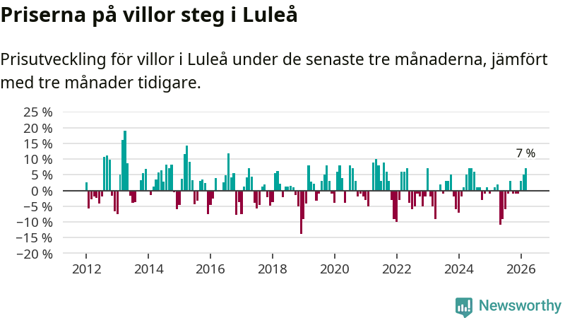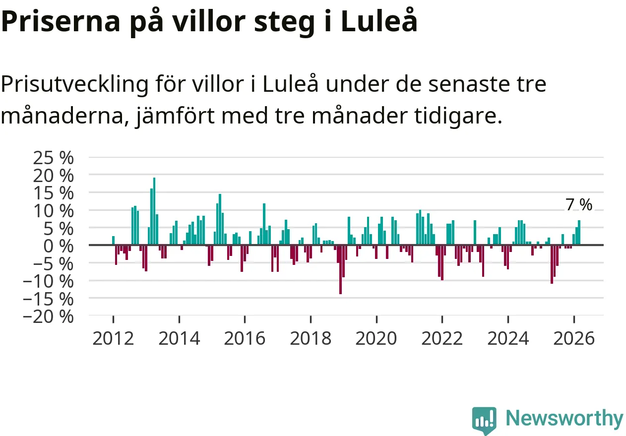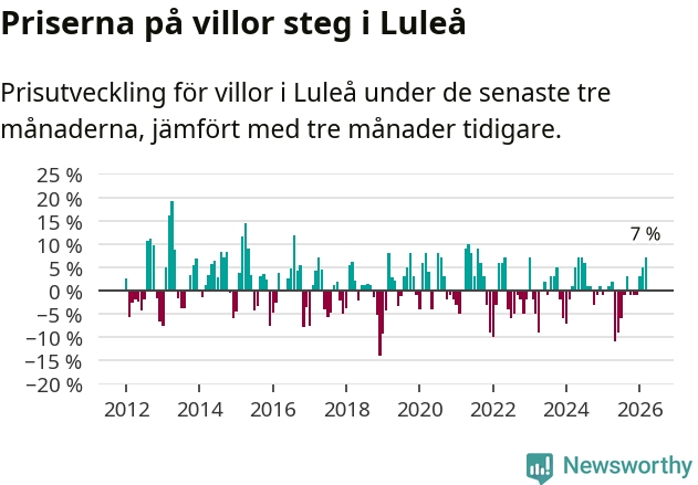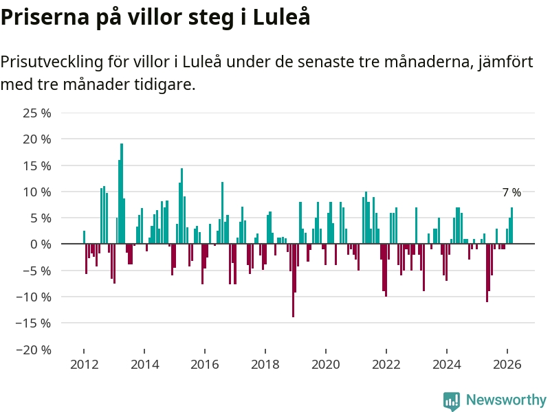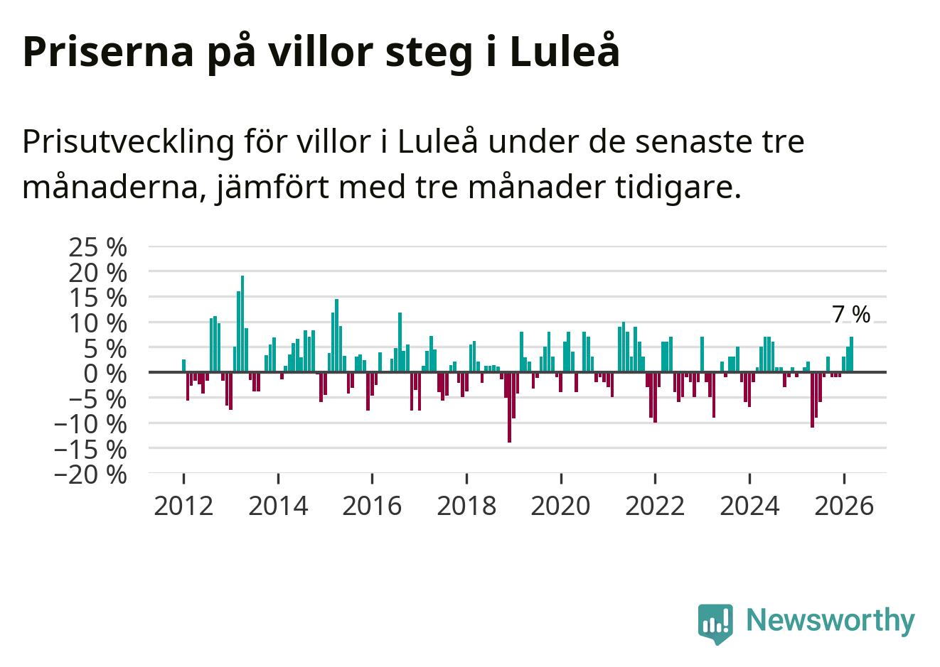 Villapriserna steg mellan januari och mars med 7 procent i Luleå kommun. Det är en betydande uppgång jämfört med det gångna året då priserna i snitt sjunkit med 1 procent.