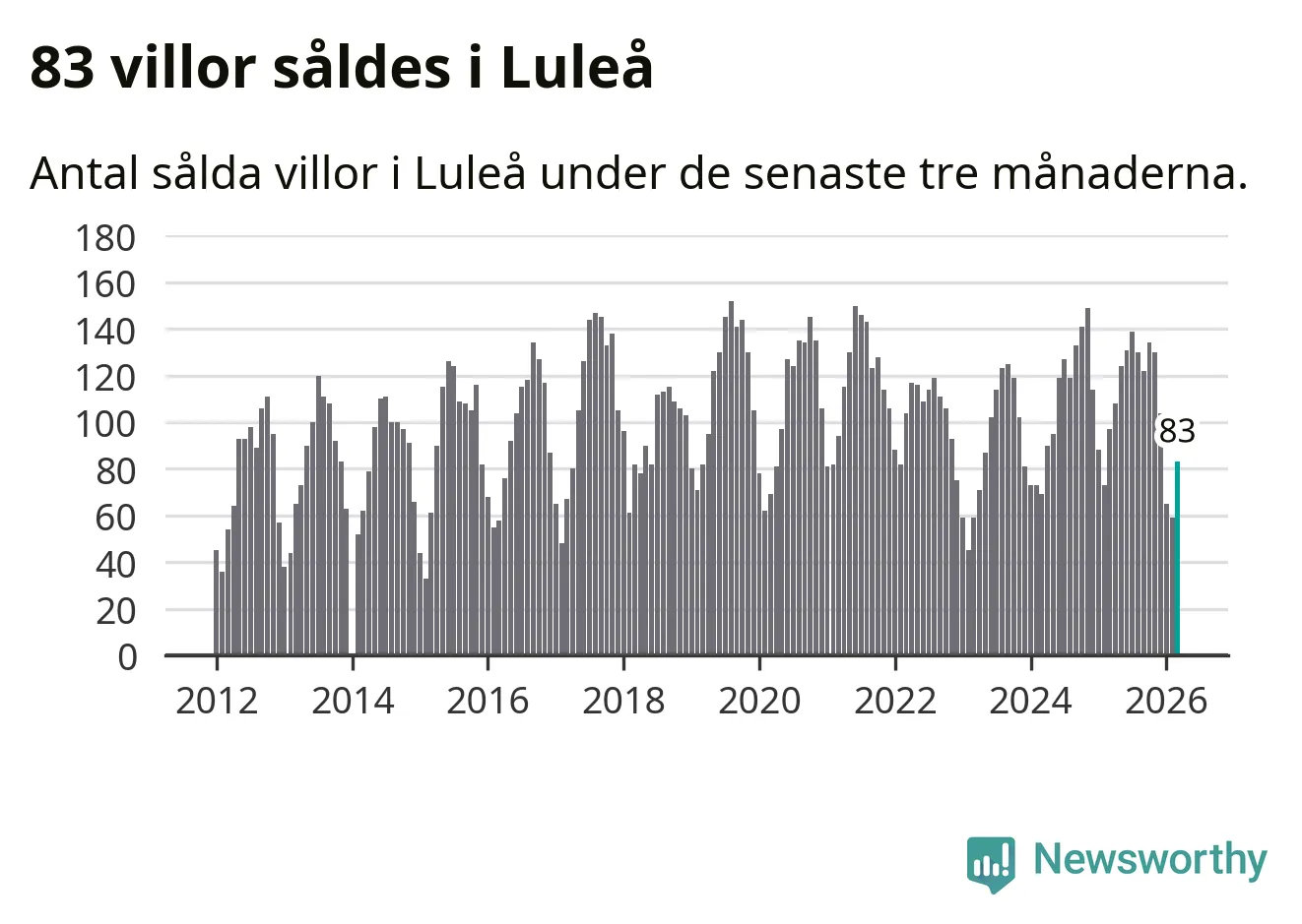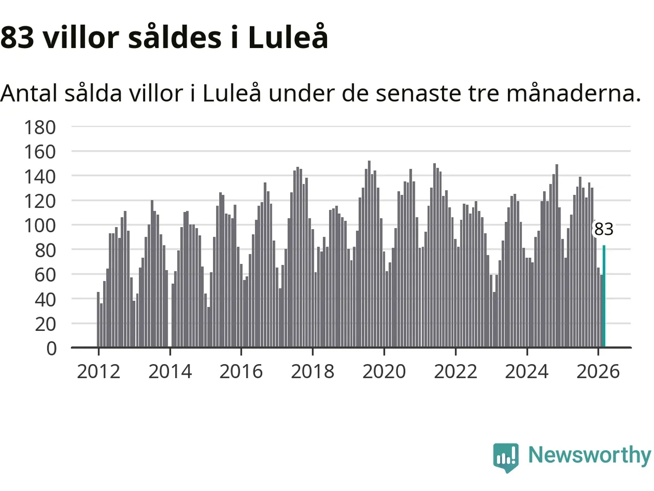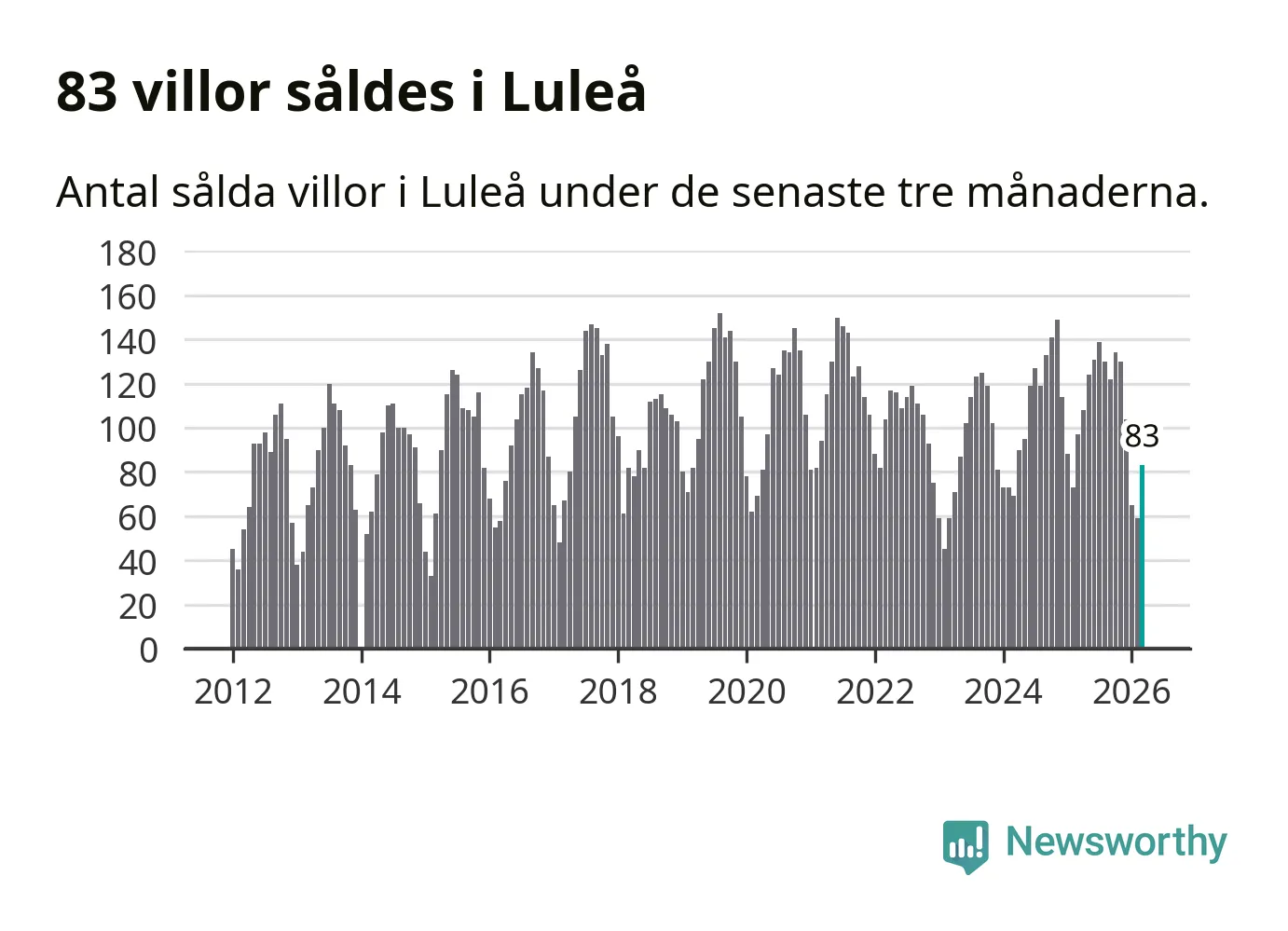 Sammanlagt såldes 83 villor i Luleå kommun mellan januari och mars till ett genomsnittligt pris på 3,7 miljoner kronor. I fjol gjordes 97 affärer vid den här tiden på året.