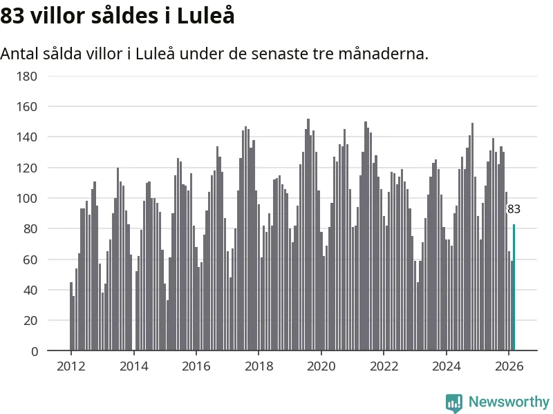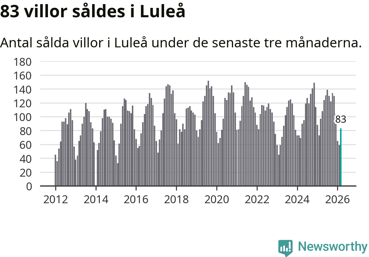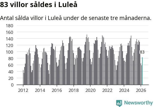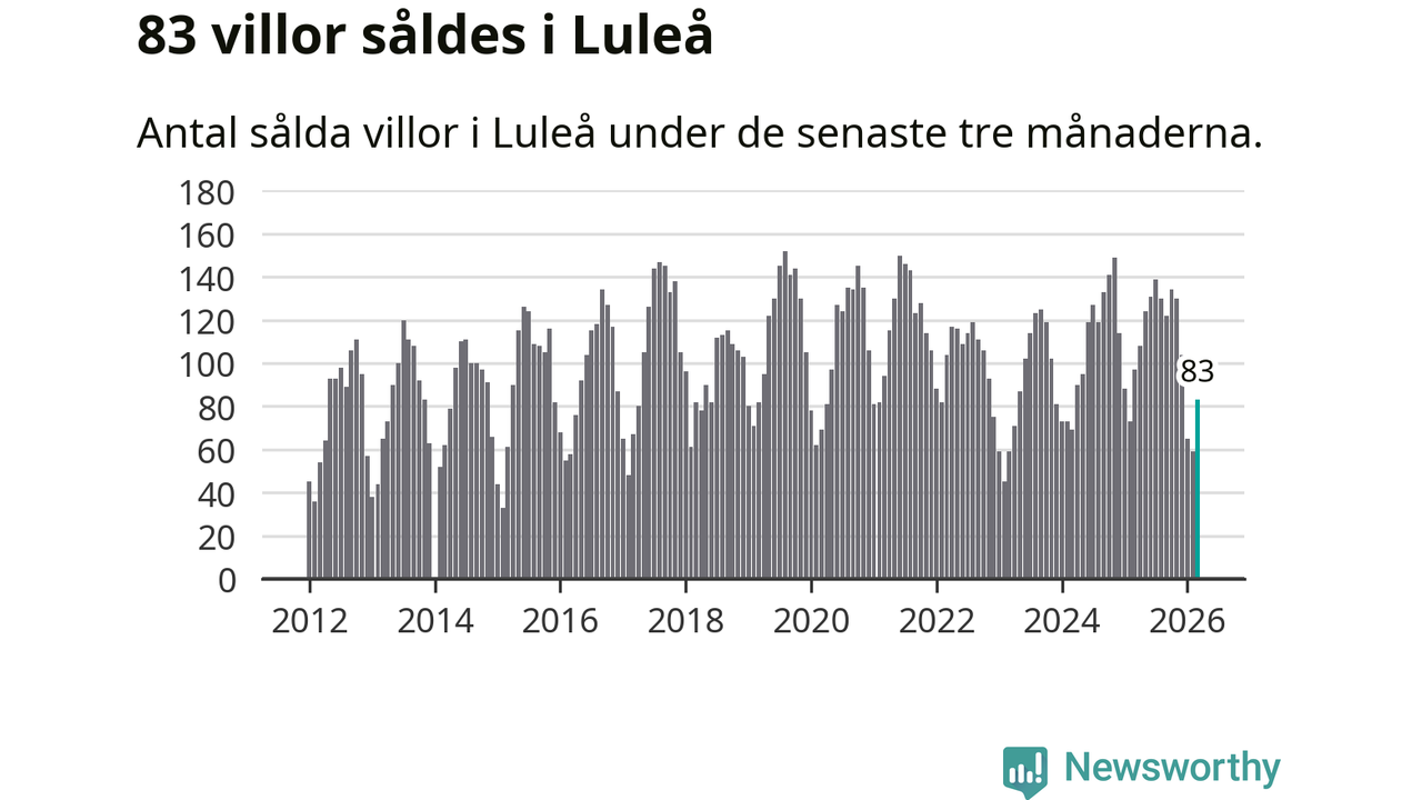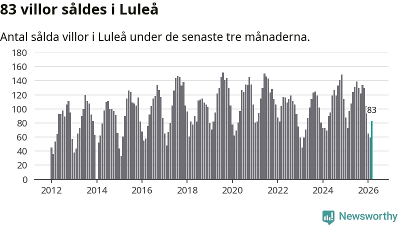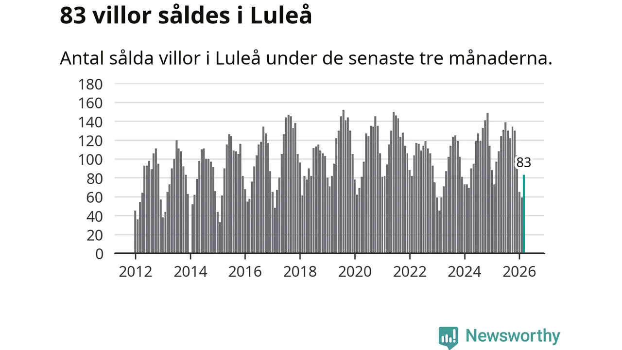 Sammanlagt såldes 83 villor i Luleå kommun mellan januari och mars till ett genomsnittligt pris på 3,7 miljoner kronor. I fjol gjordes 97 affärer vid den här tiden på året.