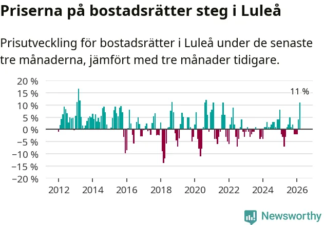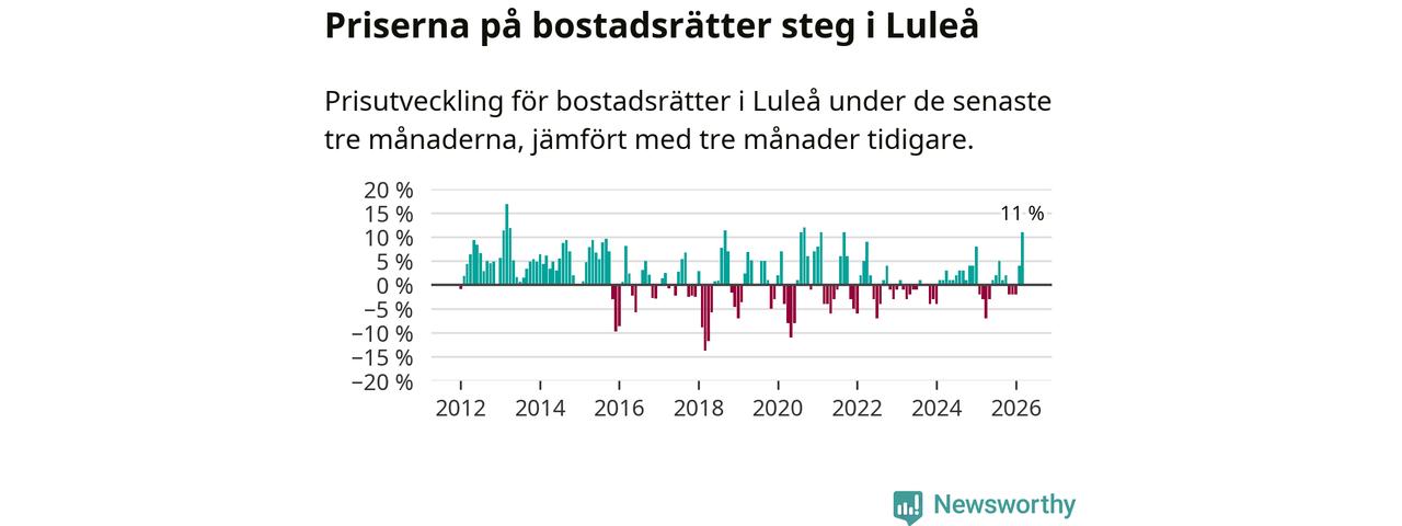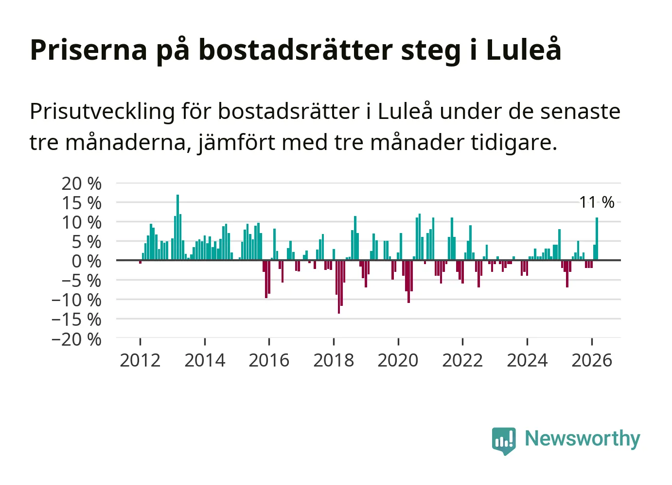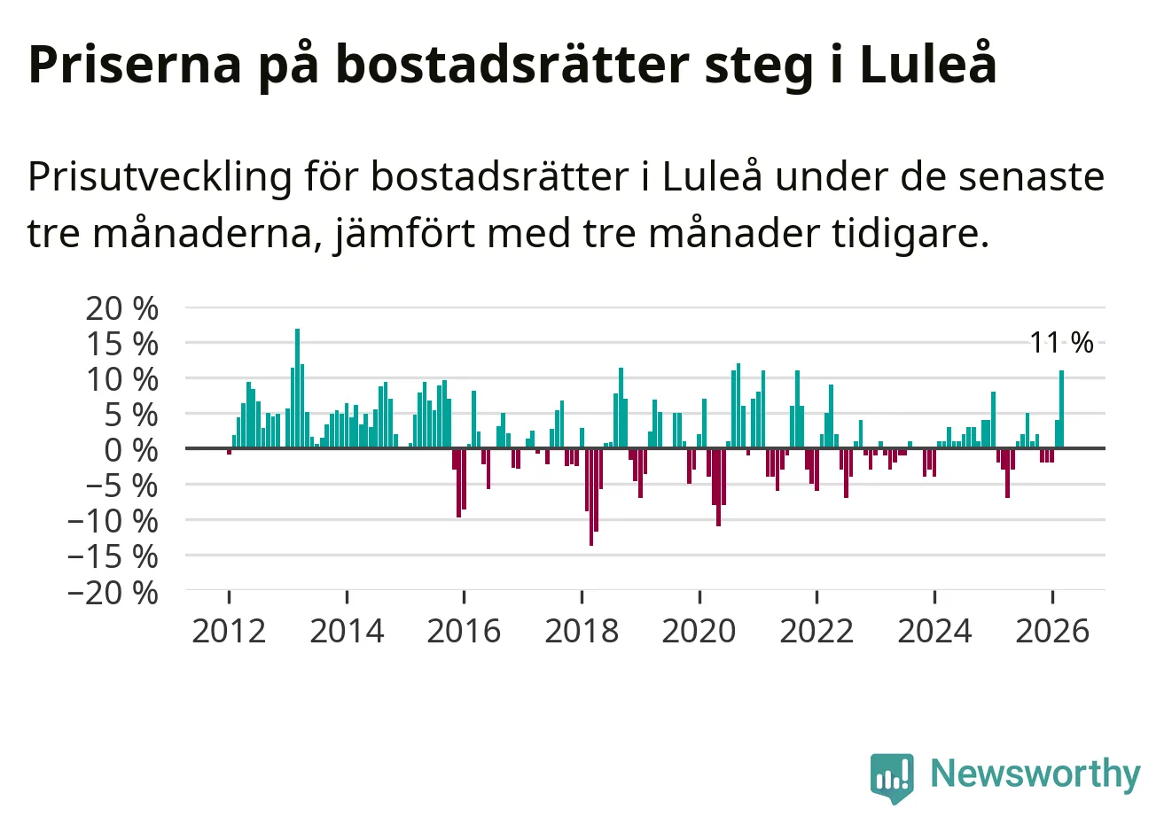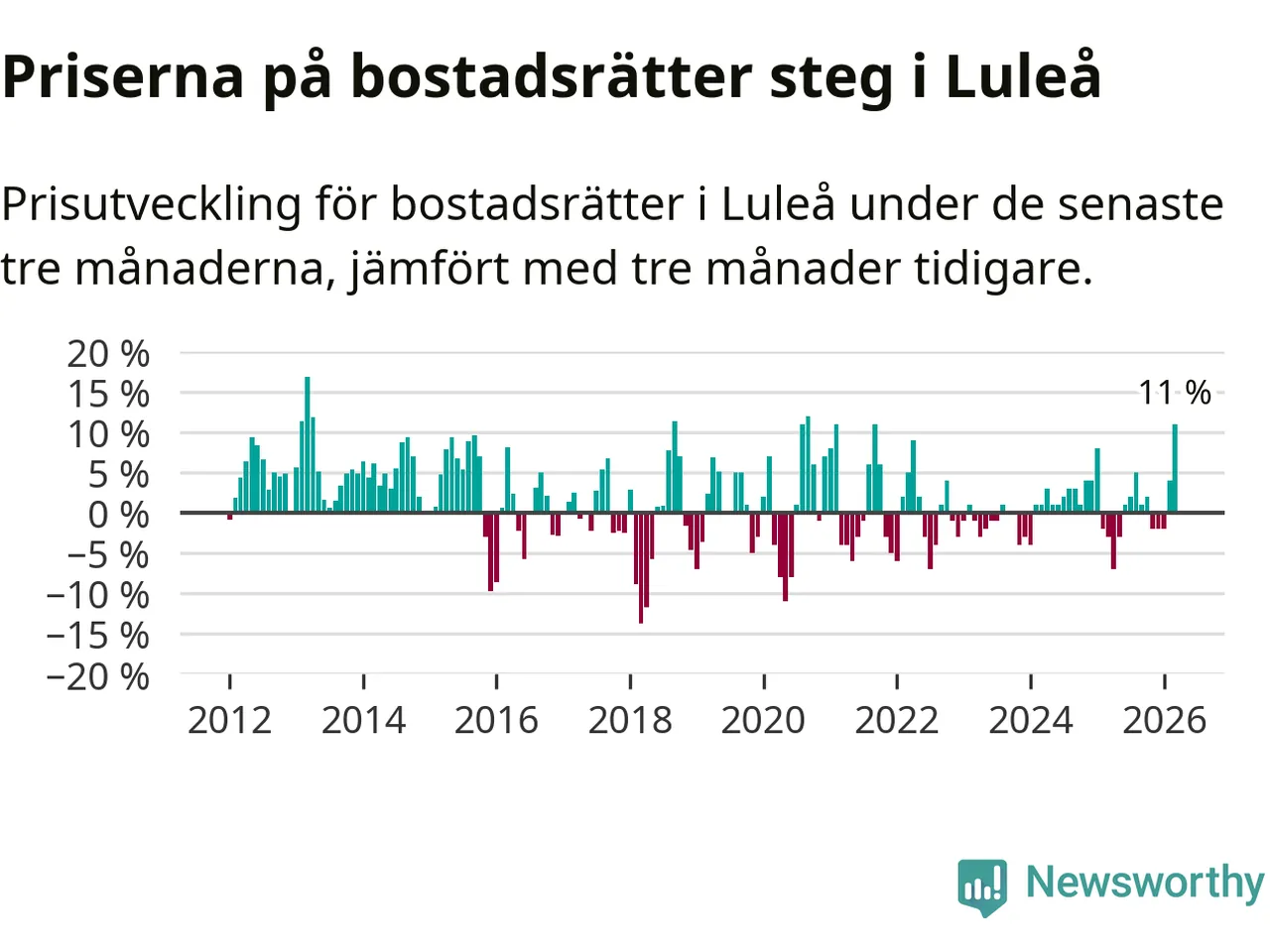 Priserna på bostadsrätter steg med elva procent i Luleå kommun under de senaste tre månaderna. Det är den starkaste prisutvecklingen sedan 2021.