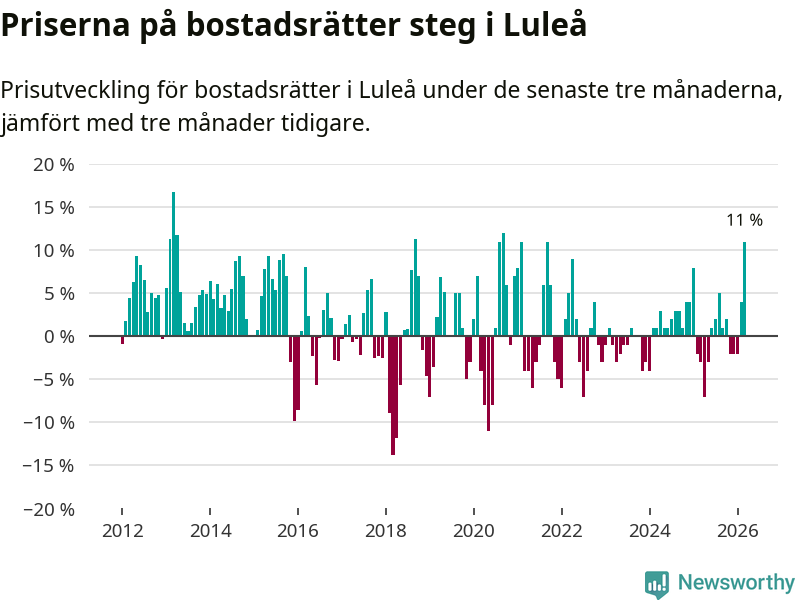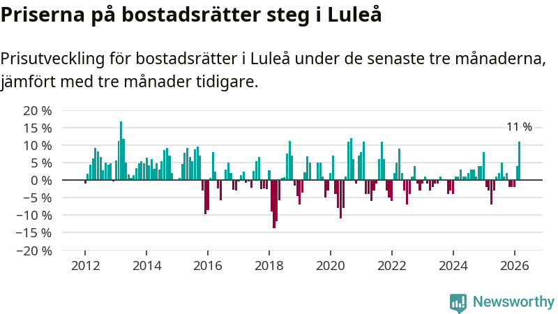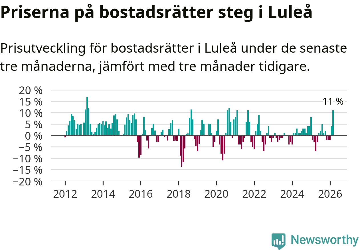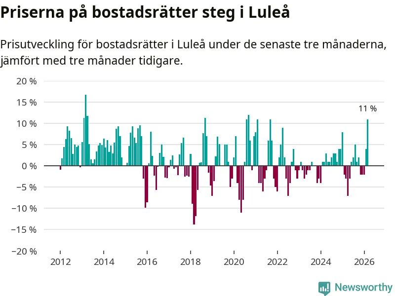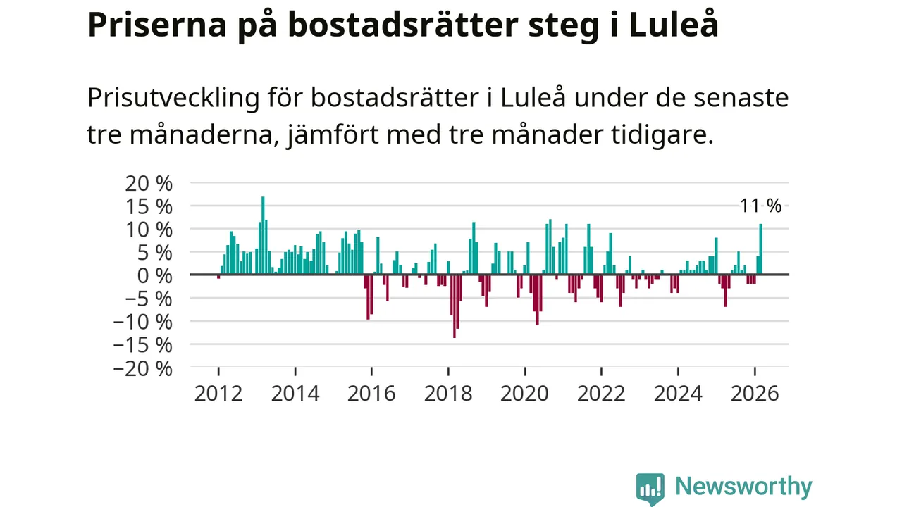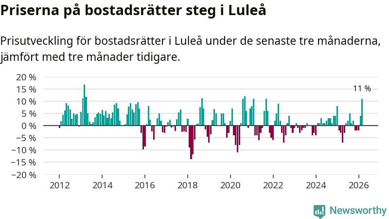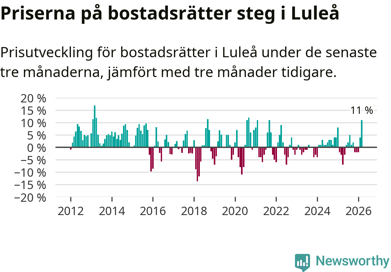 Priserna på bostadsrätter steg med elva procent i Luleå kommun under de senaste tre månaderna. Det är den starkaste prisutvecklingen sedan 2021.