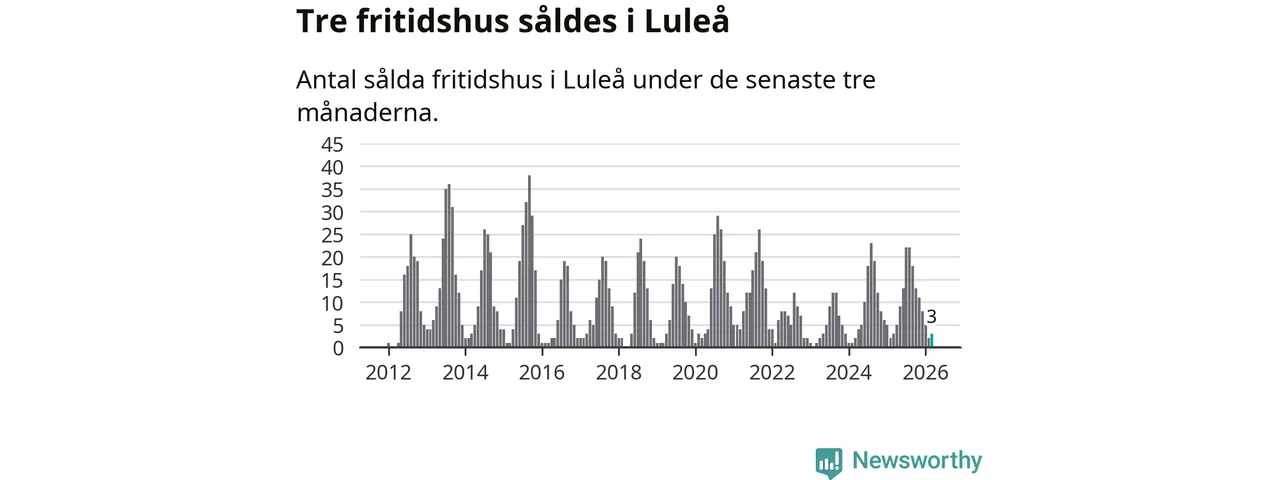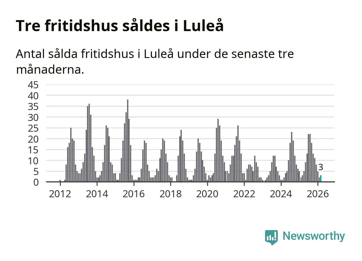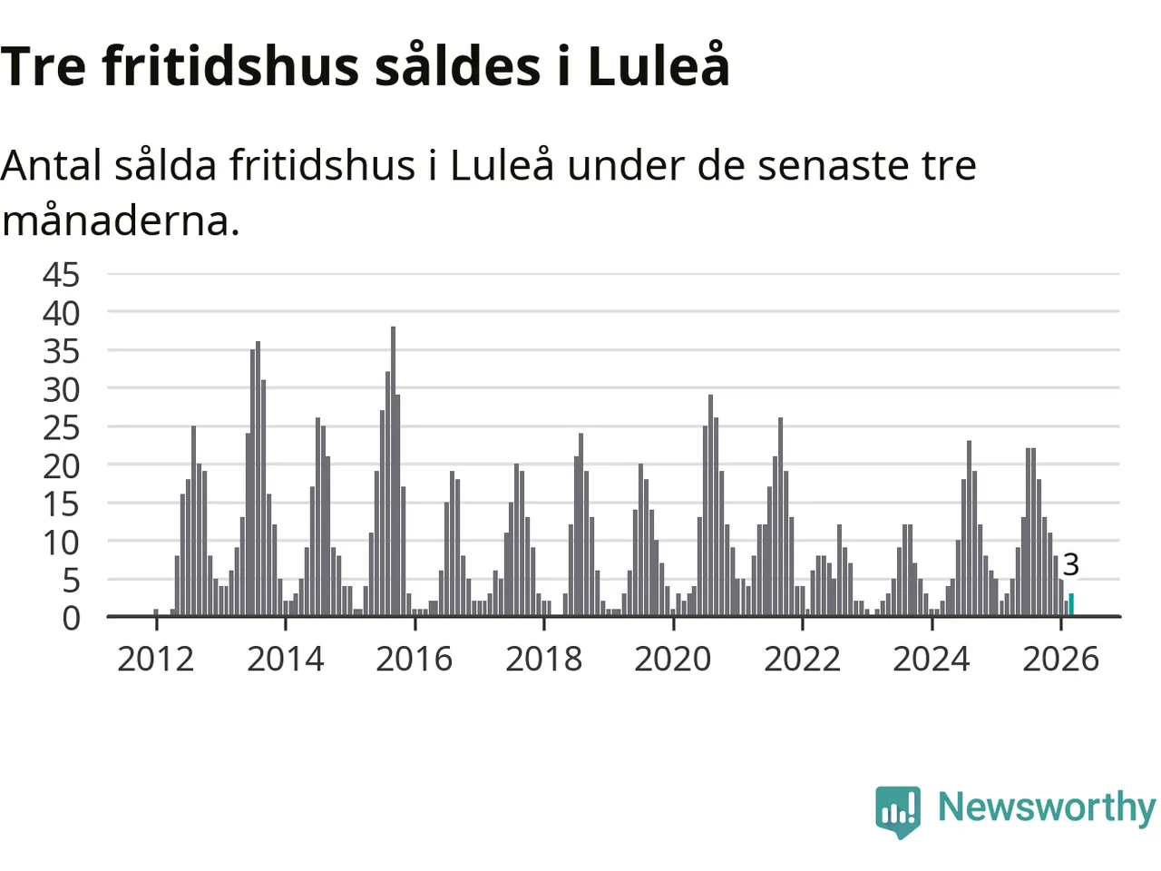Sammanlagt såldes tre fritidshus i Luleå kommun mellan januari och mars till ett genomsnittligt pris på 1,8 miljoner kronor. I fjol gjordes tre affärer vid den här tiden på året.