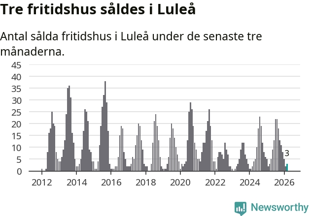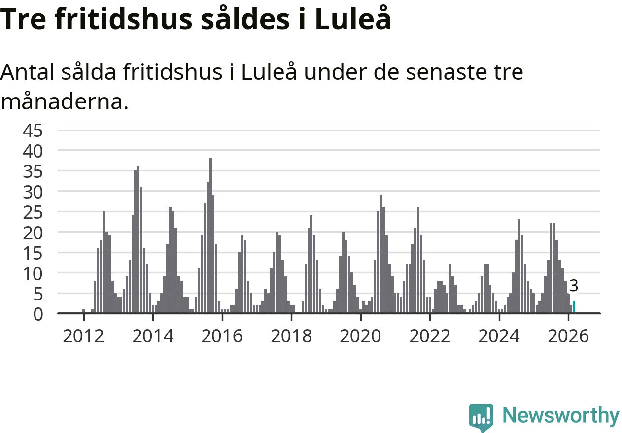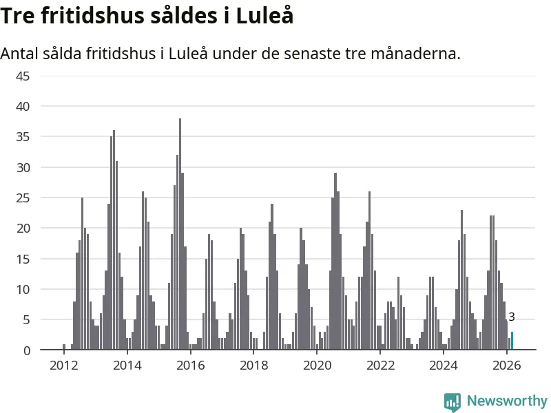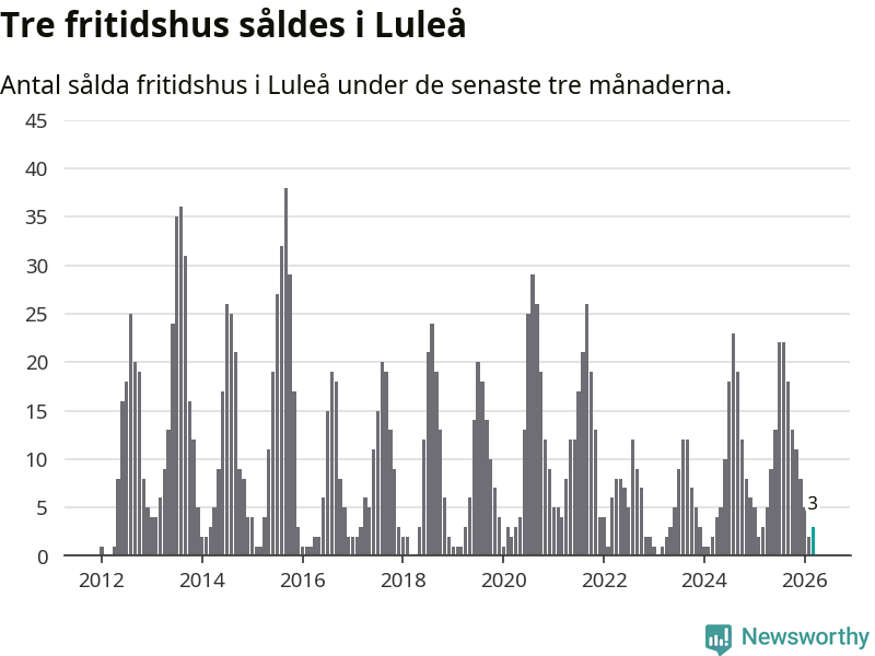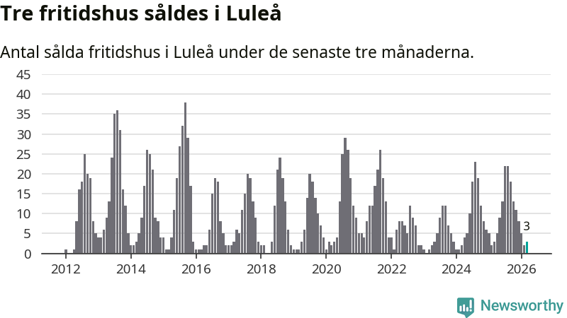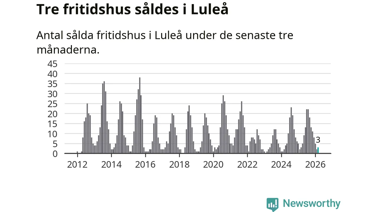 Sammanlagt såldes tre fritidshus i Luleå kommun mellan januari och mars till ett genomsnittligt pris på 1,8 miljoner kronor. I fjol gjordes tre affärer vid den här tiden på året.