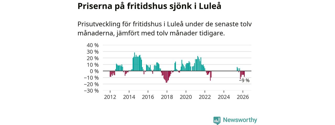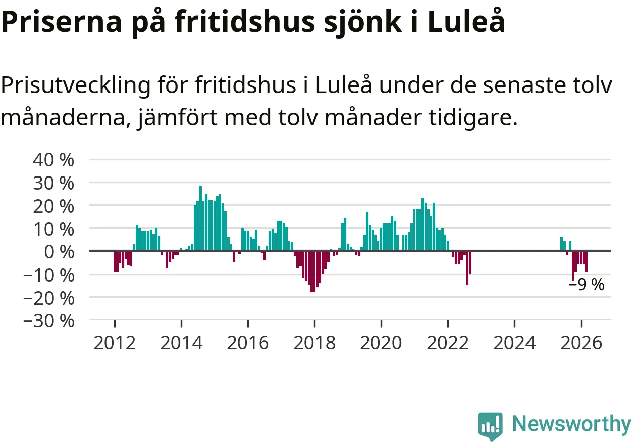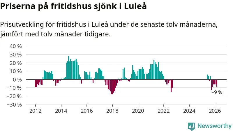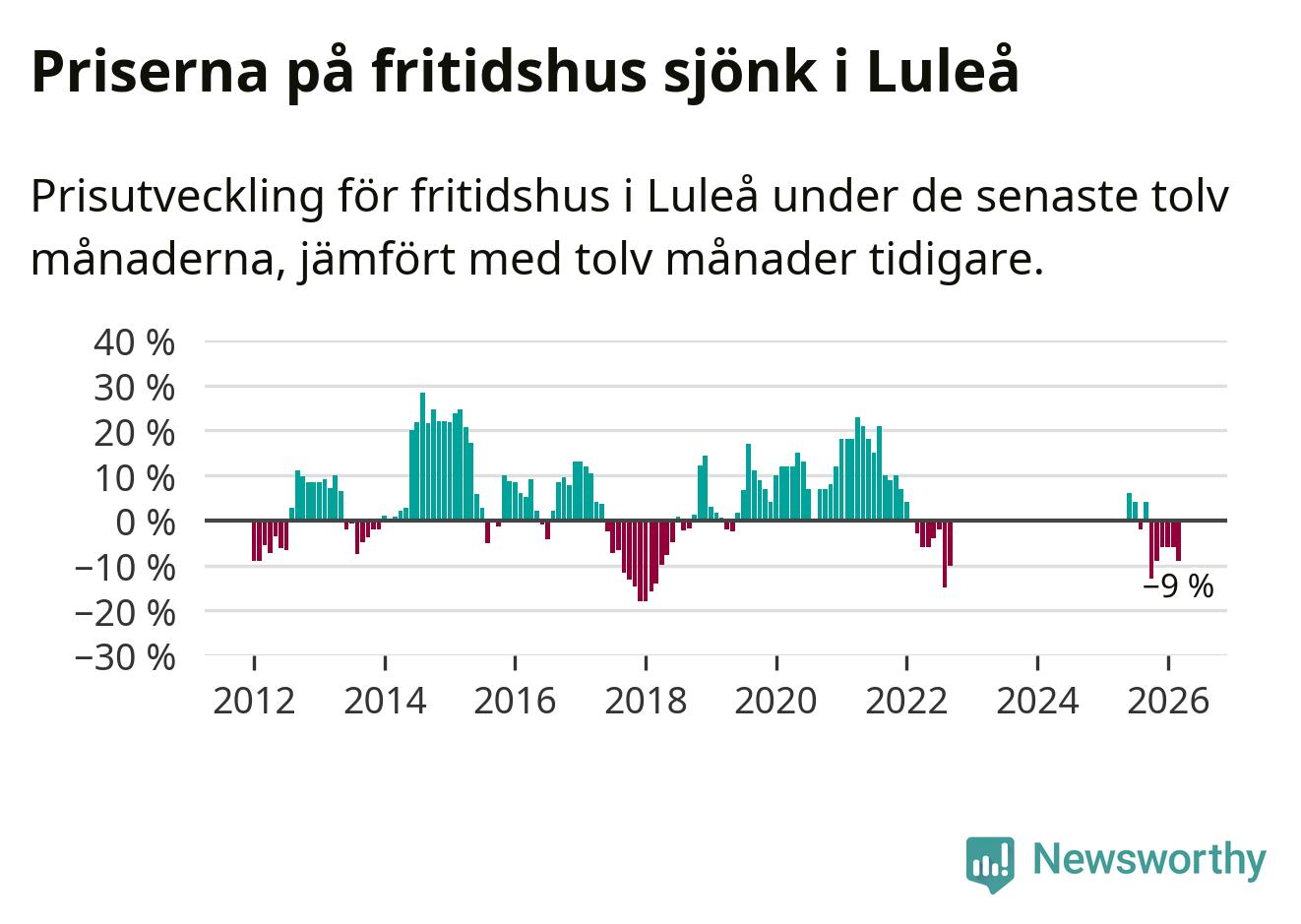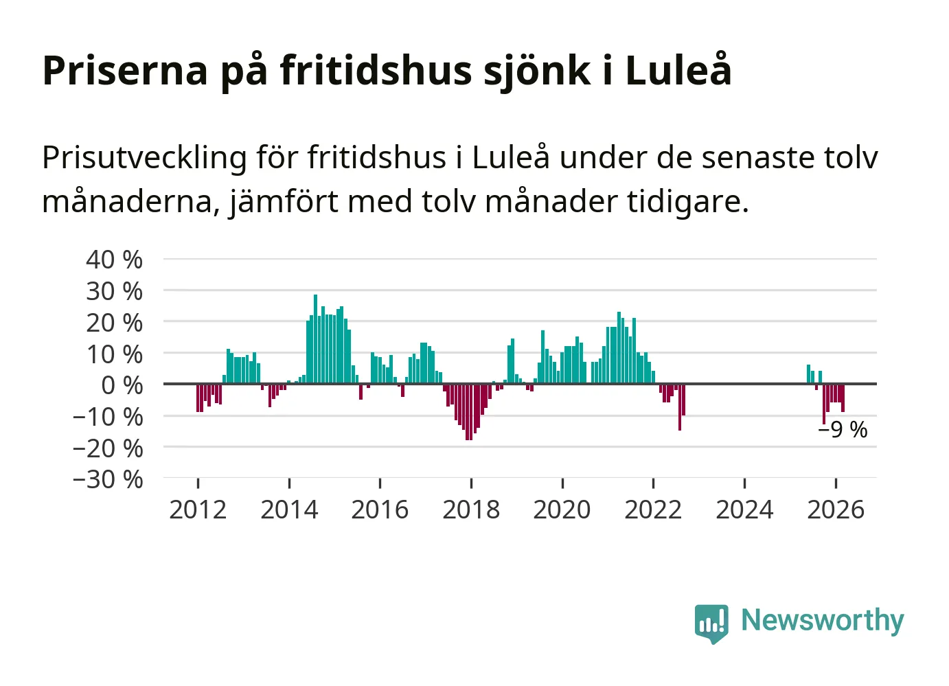 Priserna på fritidshus har gått ner i Luleå kommun. Medelpriset på försäljningarna under de senaste tolv månaderna visar på en nedgång med 9 procent.