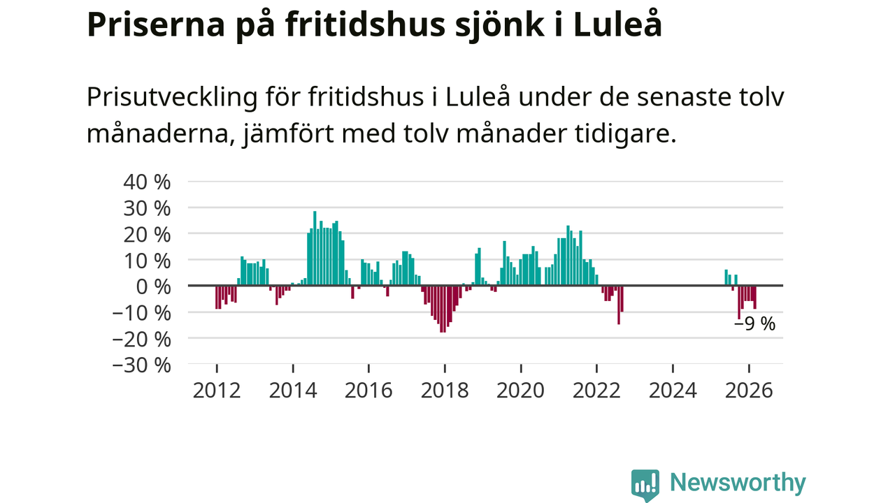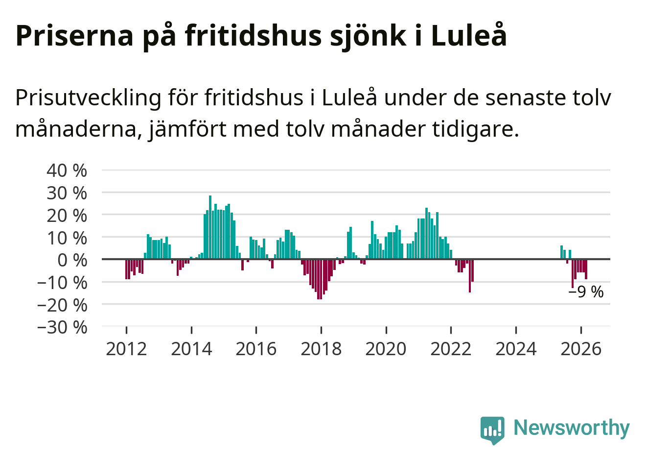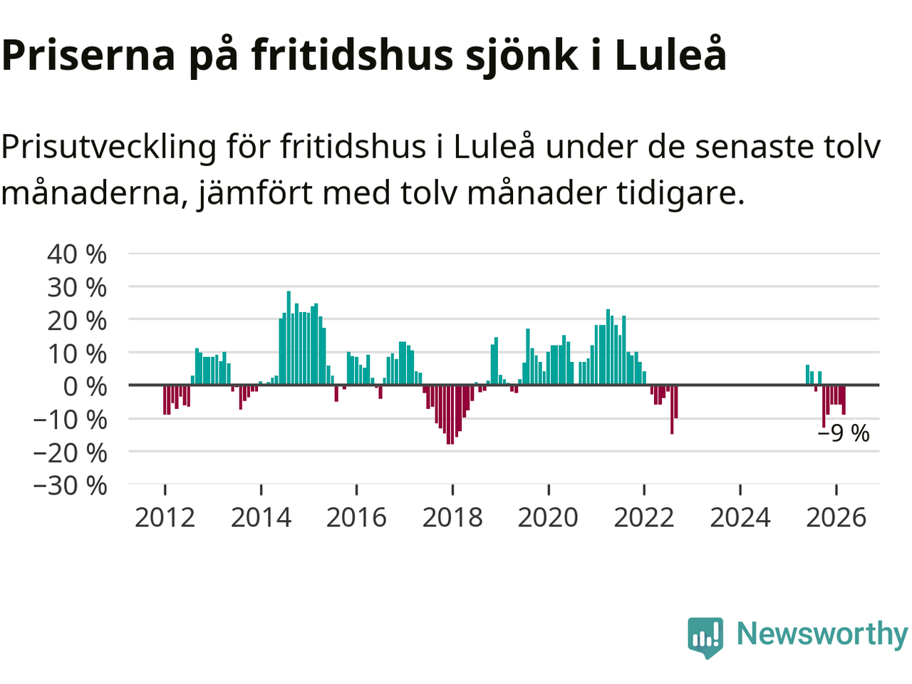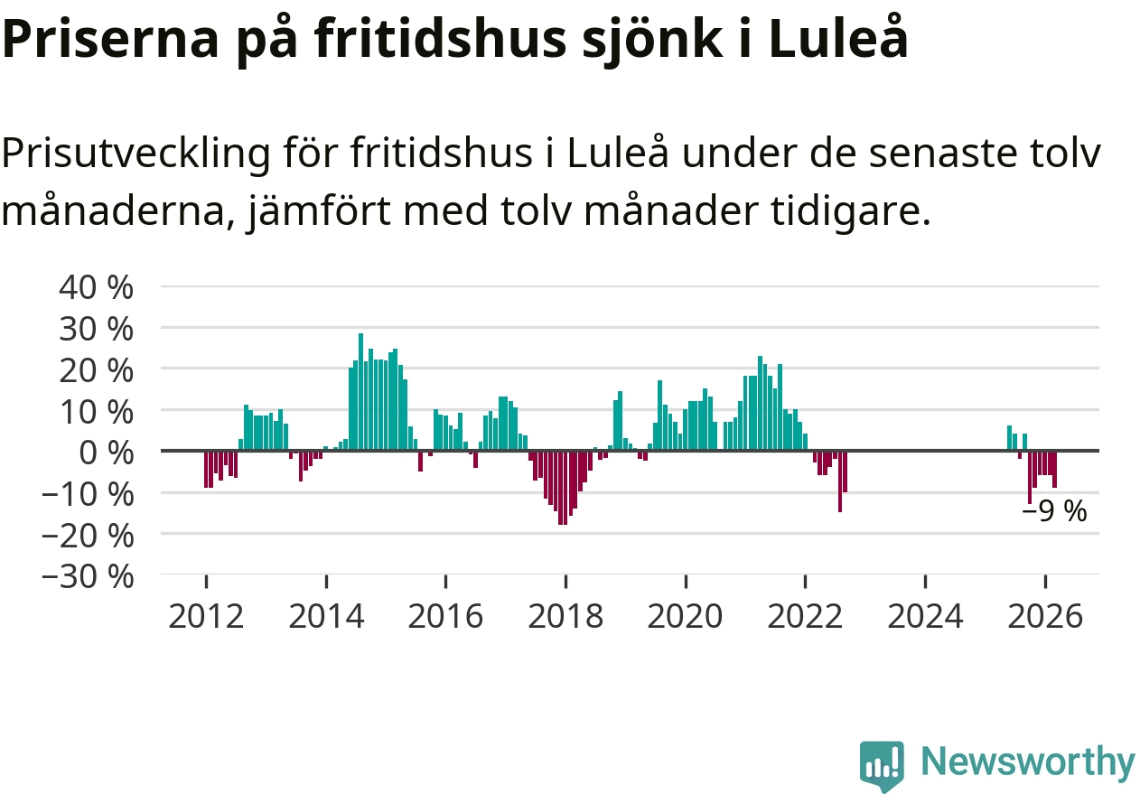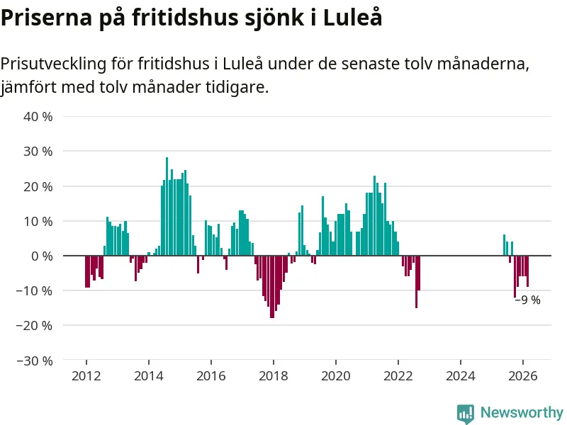 Priserna på fritidshus har gått ner i Luleå kommun. Medelpriset på försäljningarna under de senaste tolv månaderna visar på en nedgång med 9 procent.