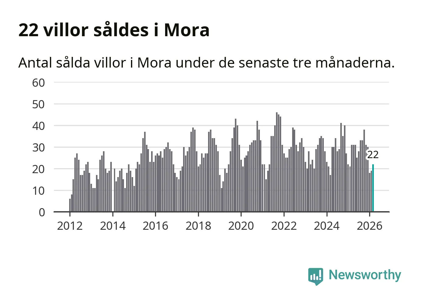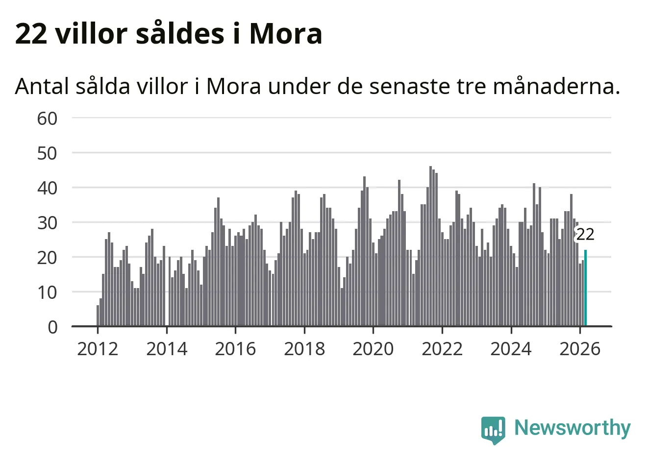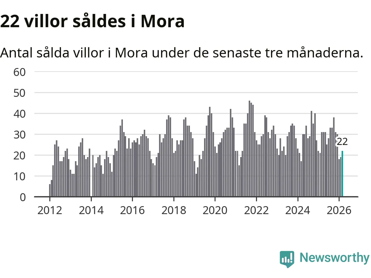 Mellan januari och mars gjordes sammanlagt 22 affärer med villor i Mora kommun. Det kan jämföras med 31 vid motsvarande tid i fjol.