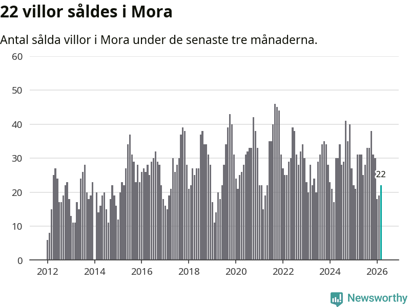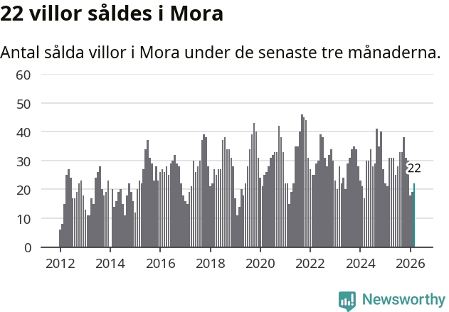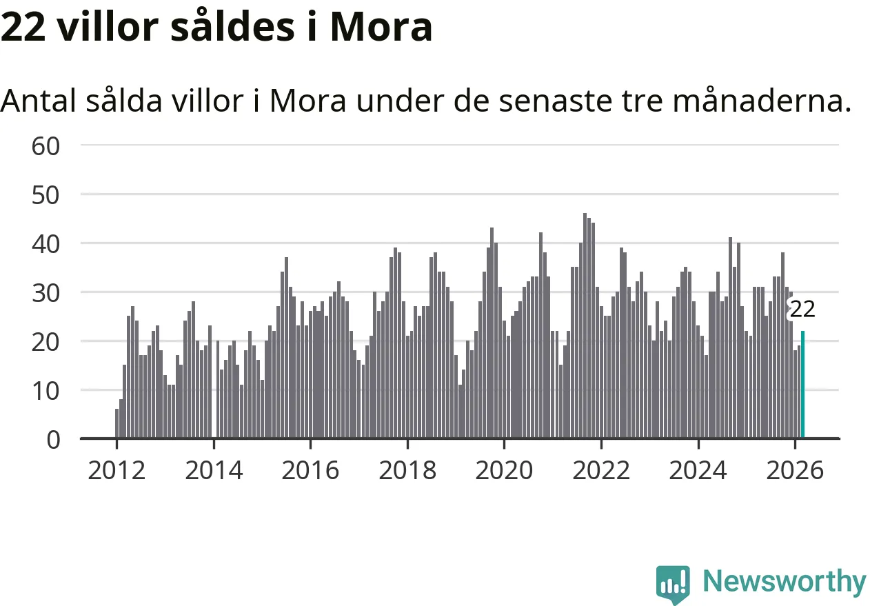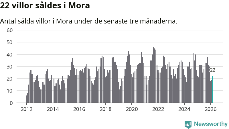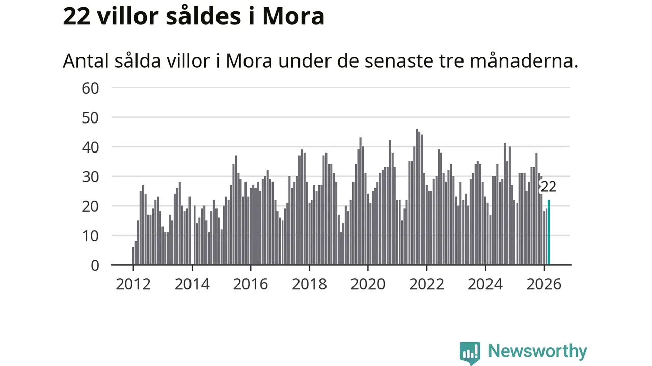 Mellan januari och mars gjordes sammanlagt 22 affärer med villor i Mora kommun. Det kan jämföras med 31 vid motsvarande tid i fjol.