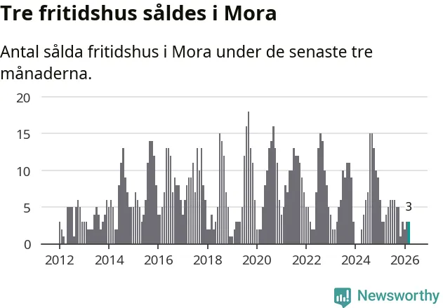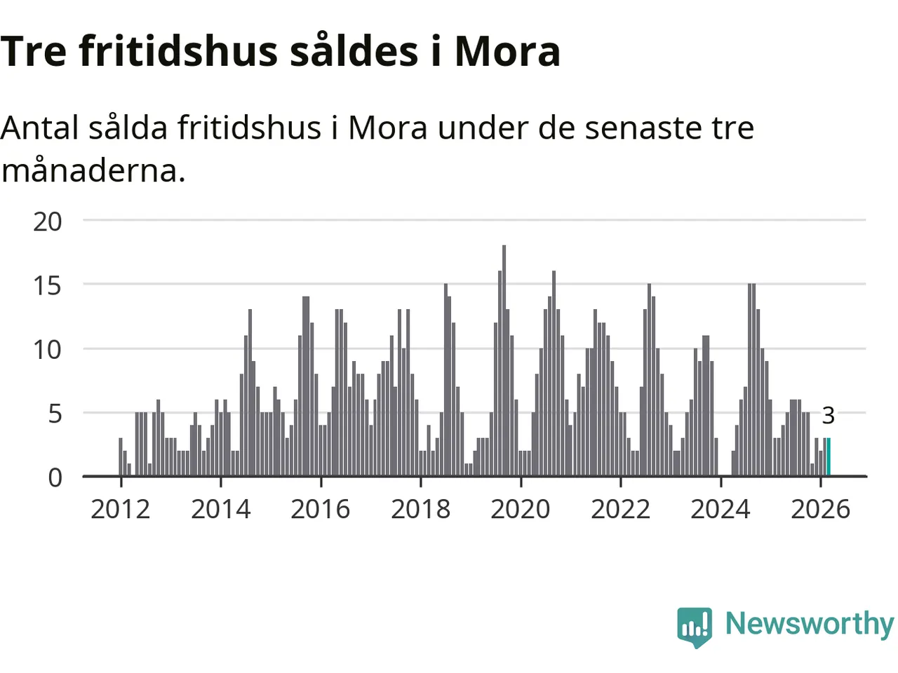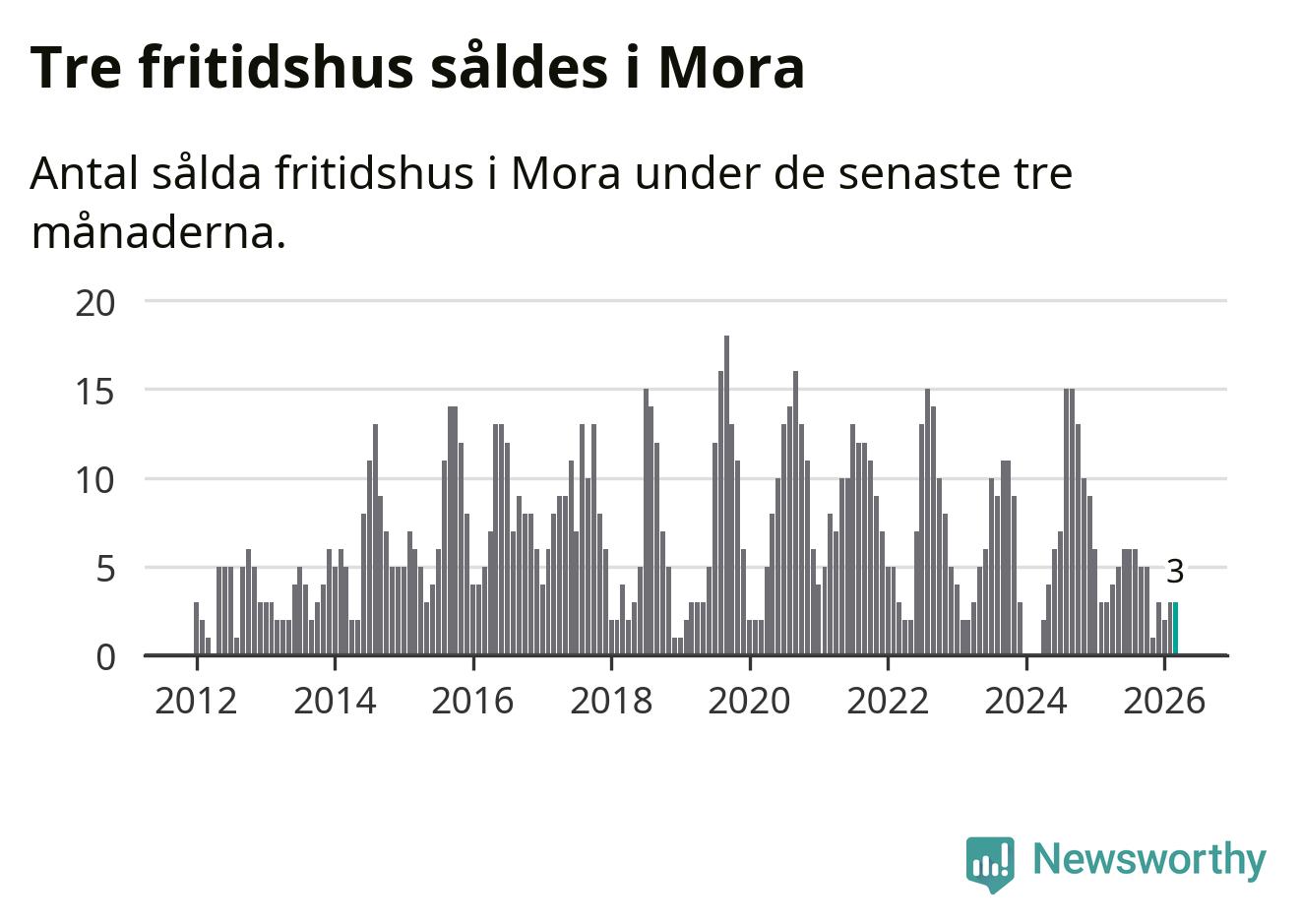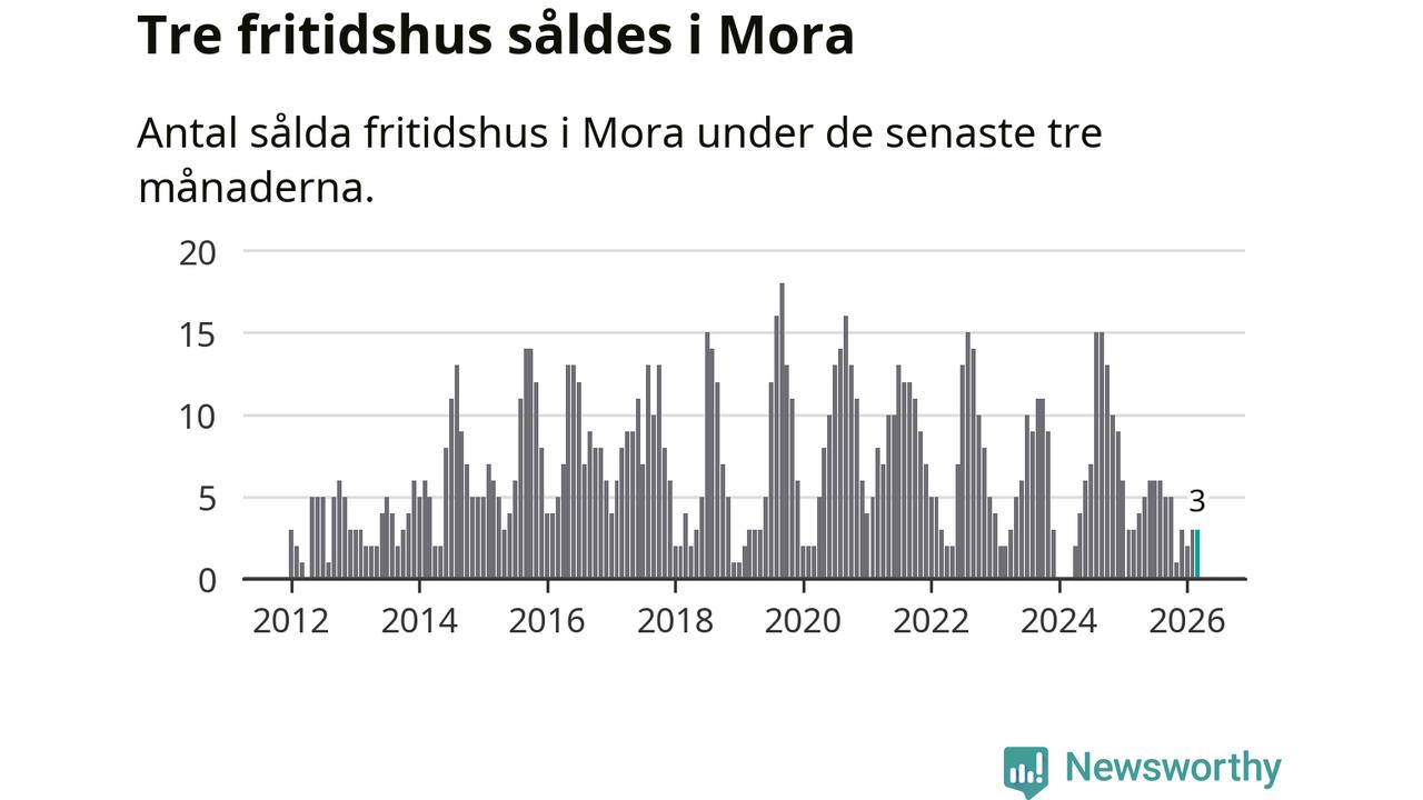 Mellan januari och mars gjordes sammanlagt tre affärer med fritidshus i Mora kommun. Det är lika många affärer som vid motsvarande tid i fjol.
