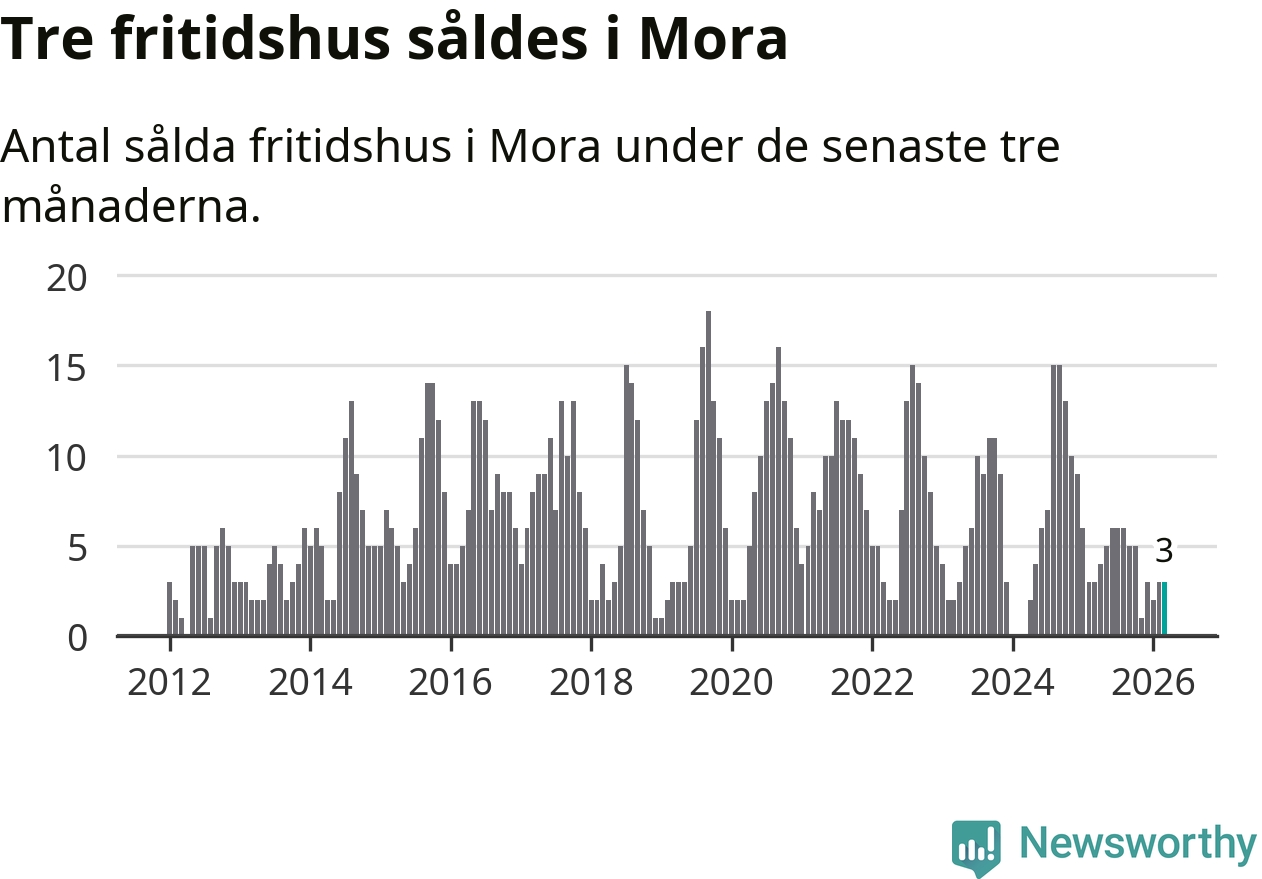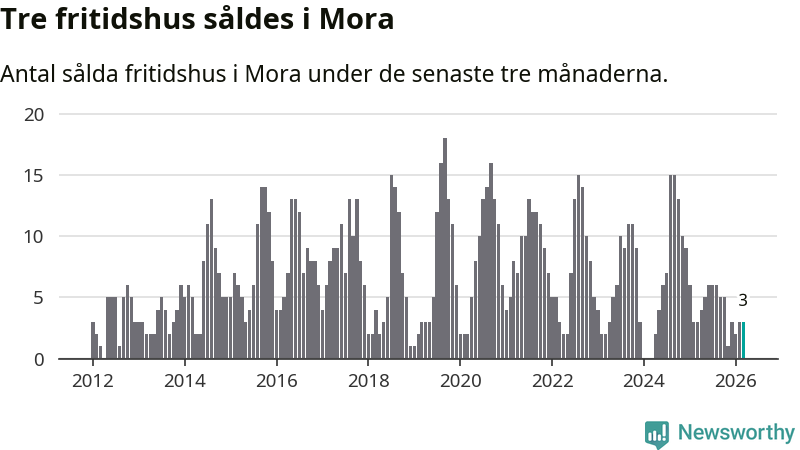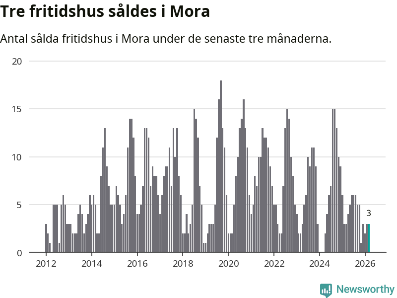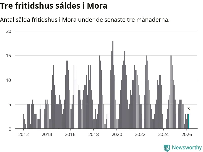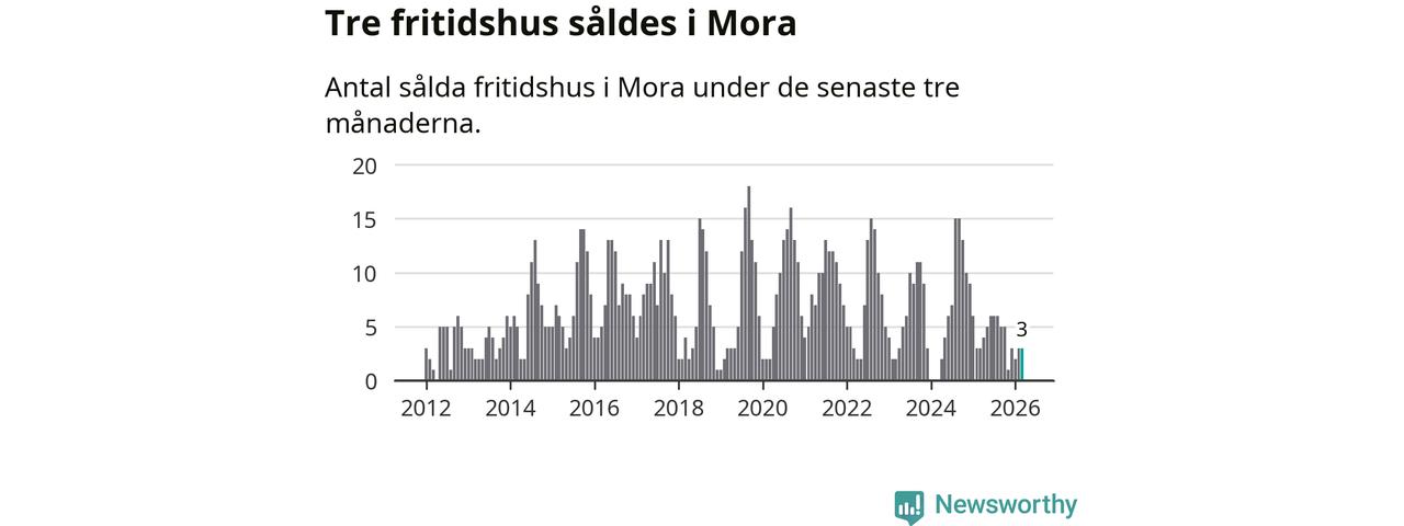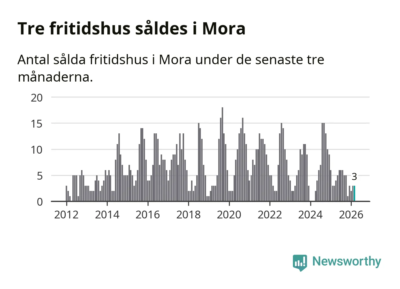 Mellan januari och mars gjordes sammanlagt tre affärer med fritidshus i Mora kommun. Det är lika många affärer som vid motsvarande tid i fjol.