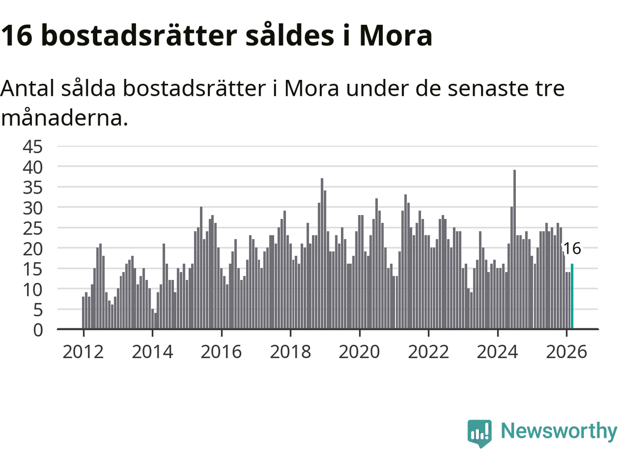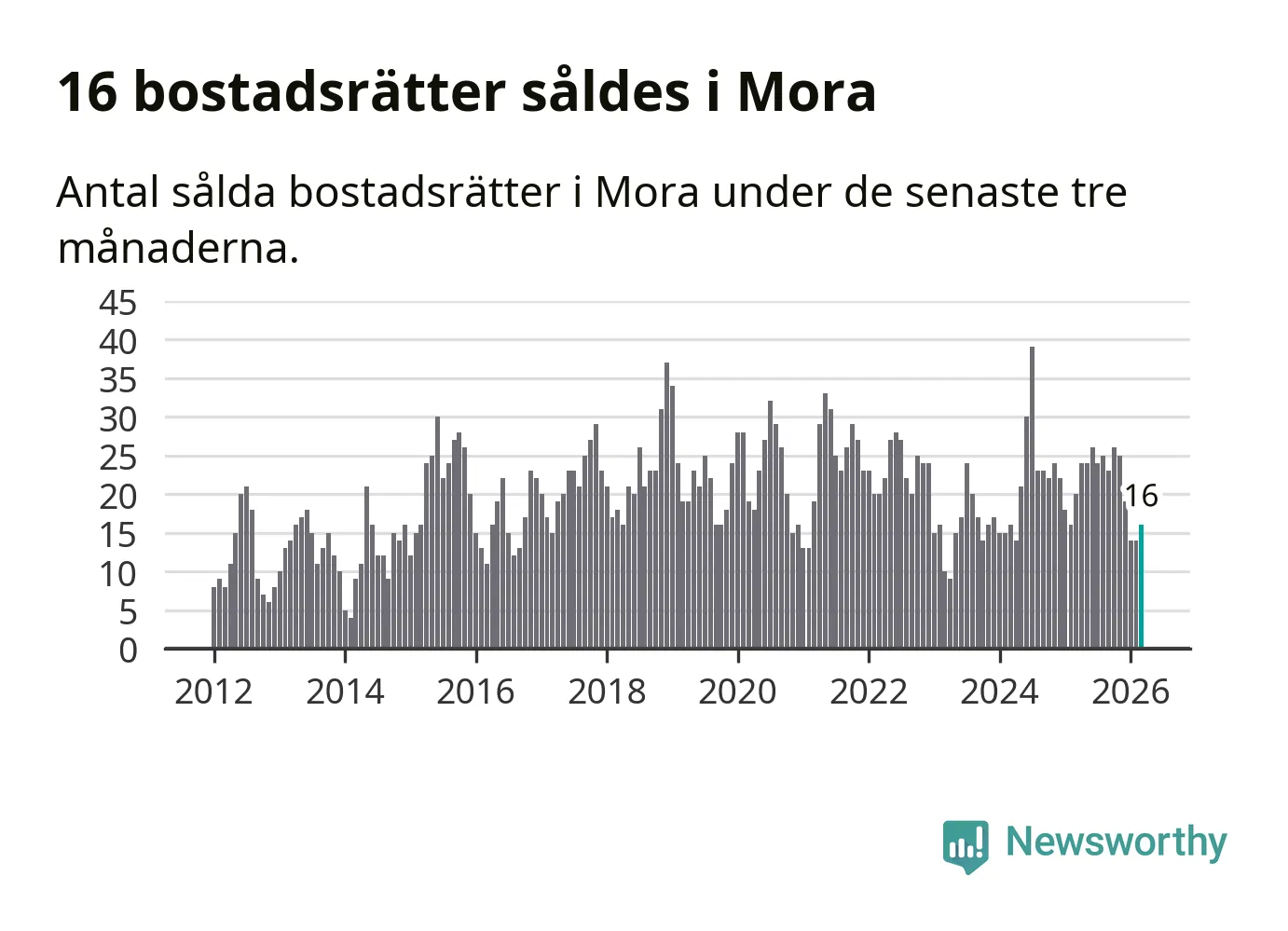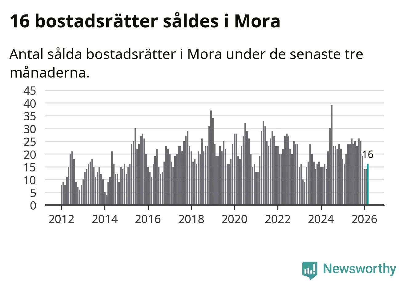 Mellan januari och mars gjordes sammanlagt 16 affärer med bostadsrätter i Mora kommun. Det kan jämföras med 20 vid motsvarande tid i fjol.
