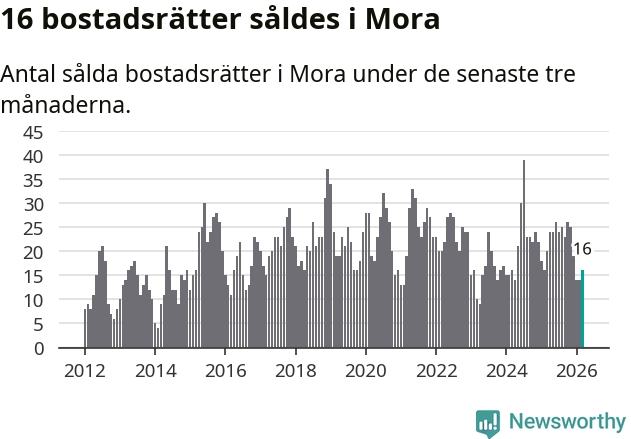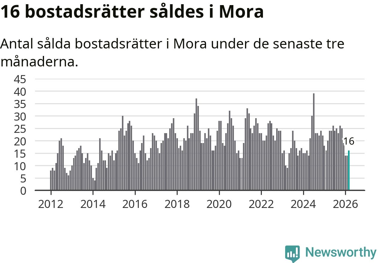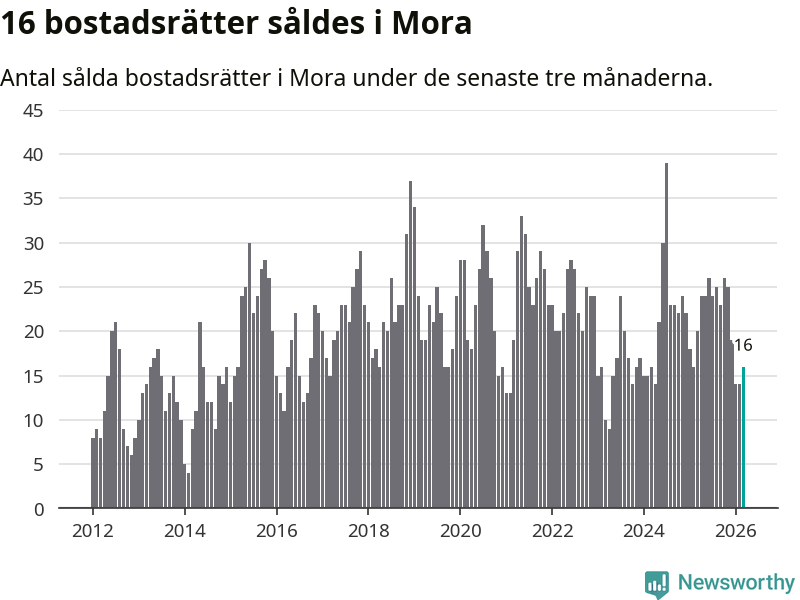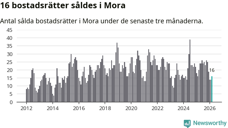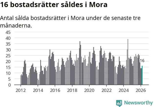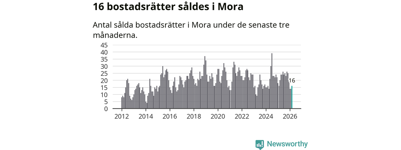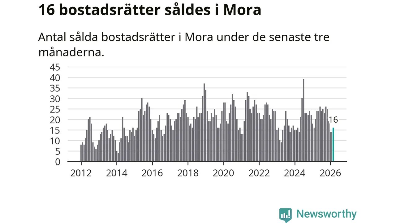 Mellan januari och mars gjordes sammanlagt 16 affärer med bostadsrätter i Mora kommun. Det kan jämföras med 20 vid motsvarande tid i fjol.