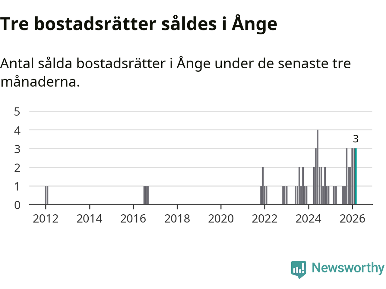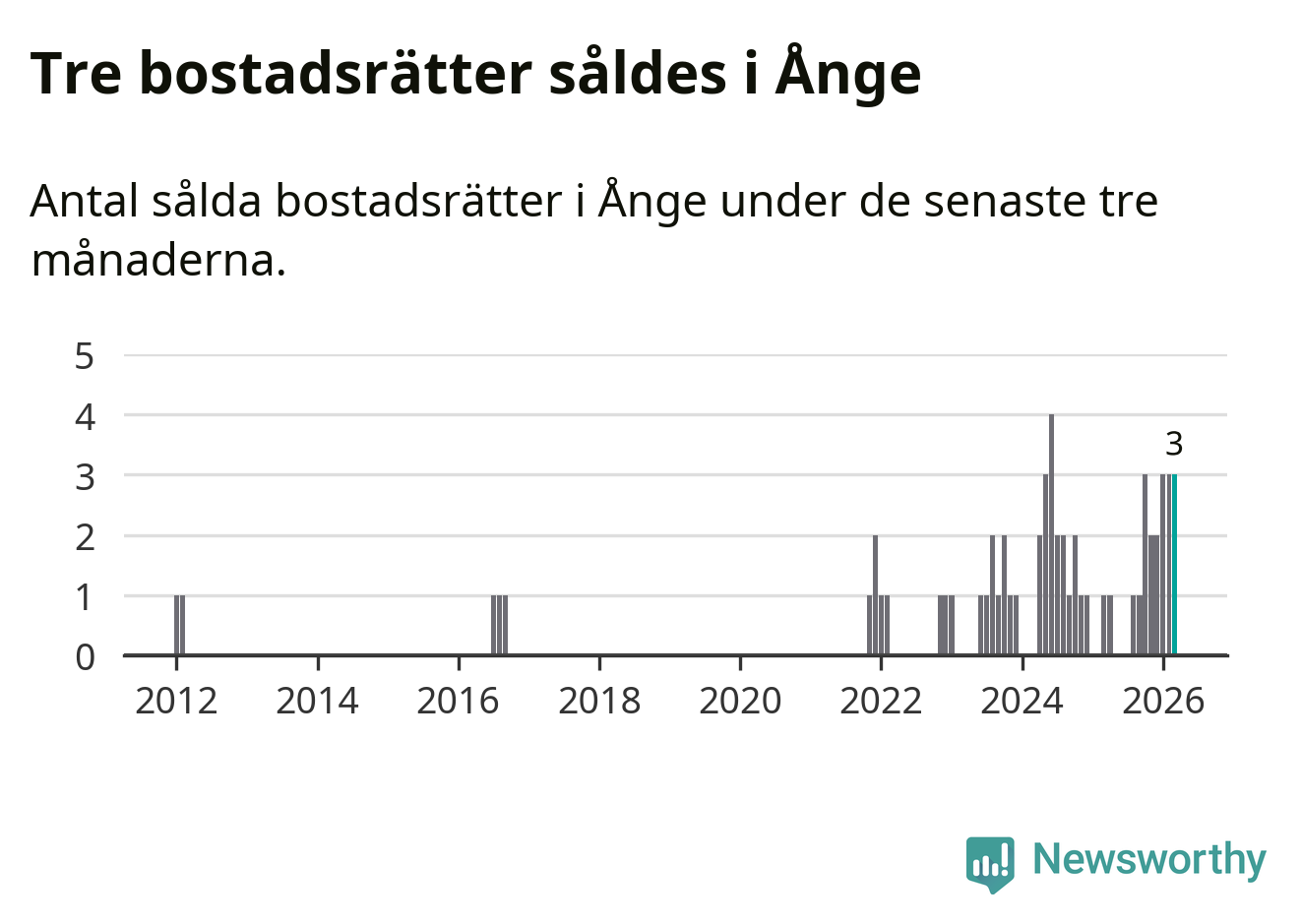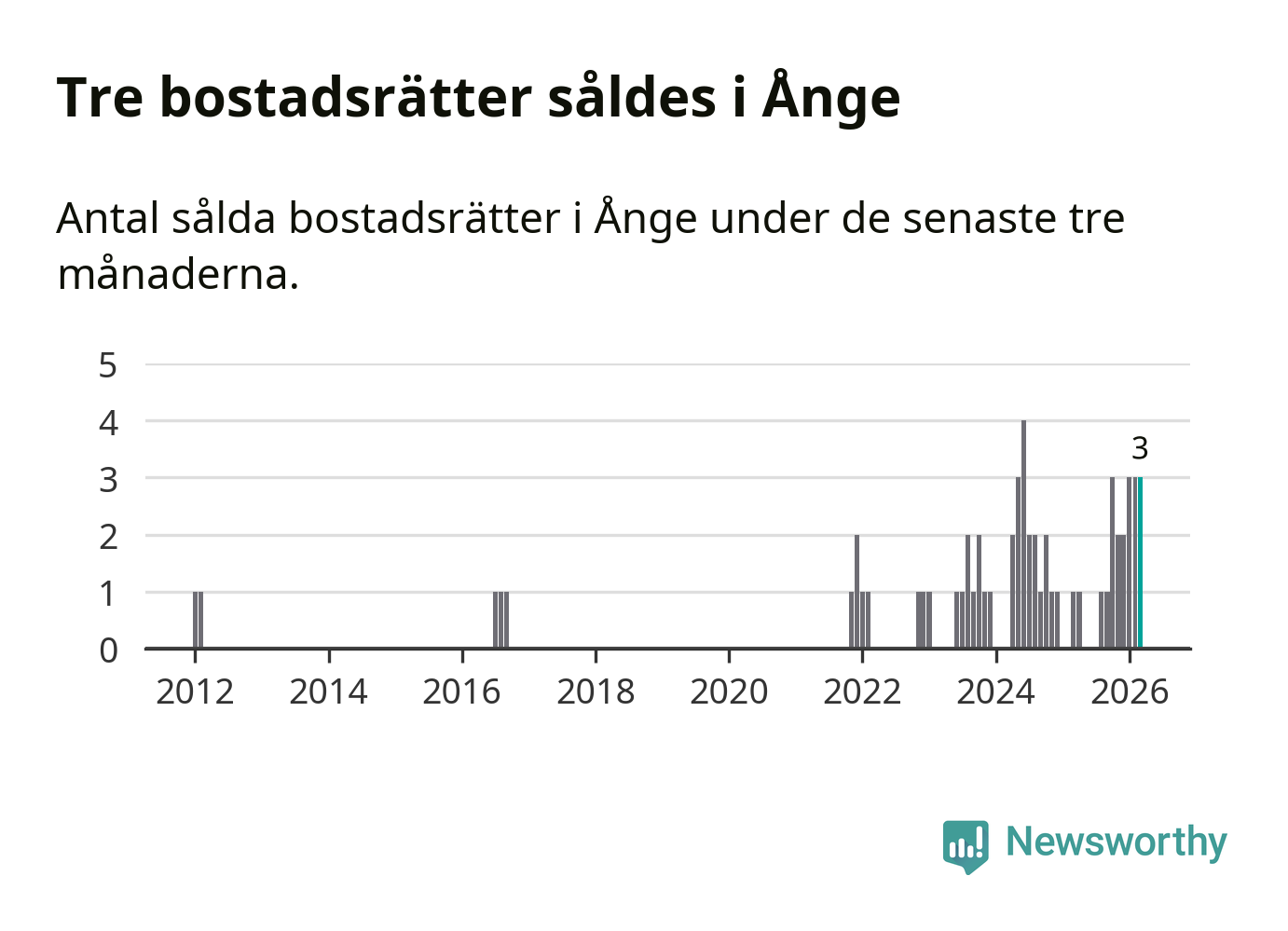 Mellan januari och mars gjordes sammanlagt tre affärer med bostadsrätter i Ånge kommun. Det kan jämföras med ett vid motsvarande tid i fjol.