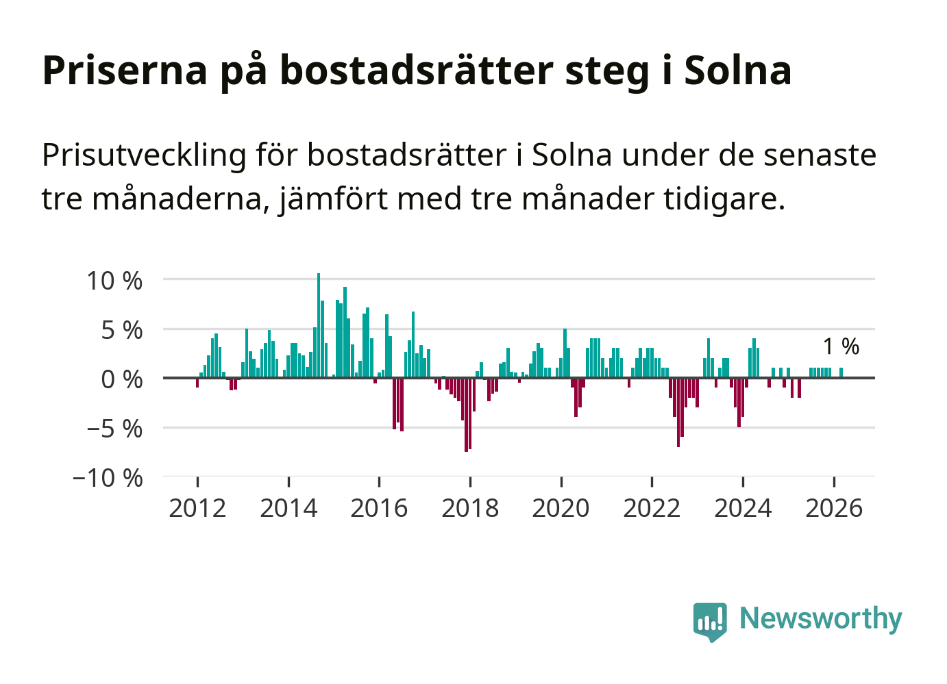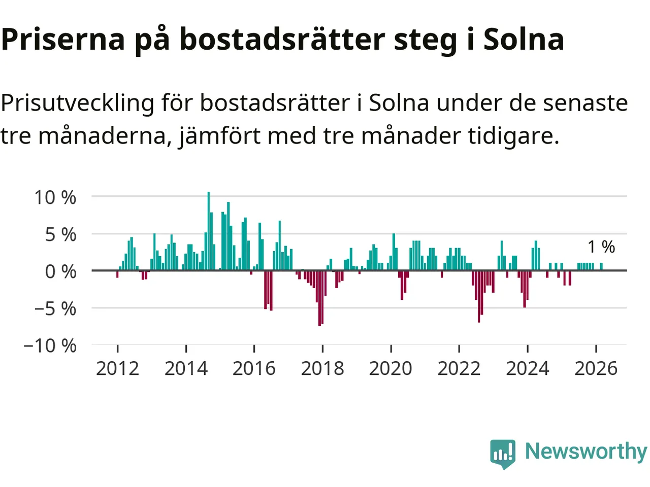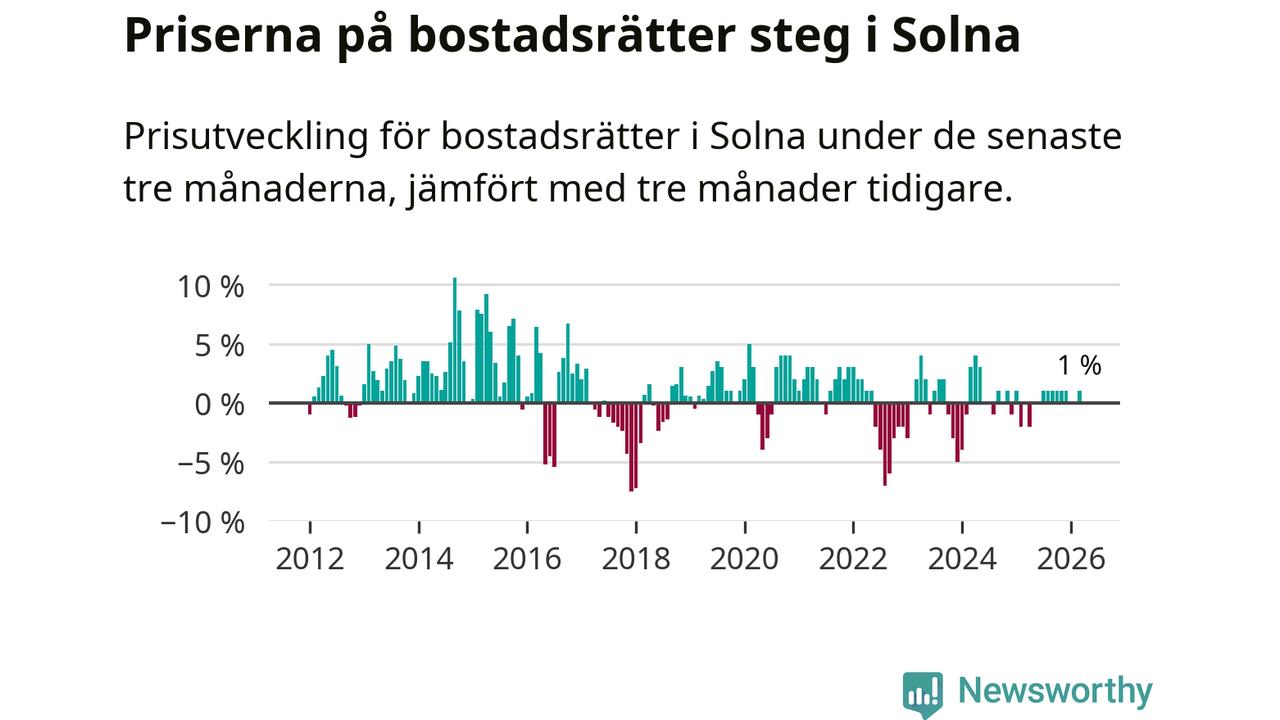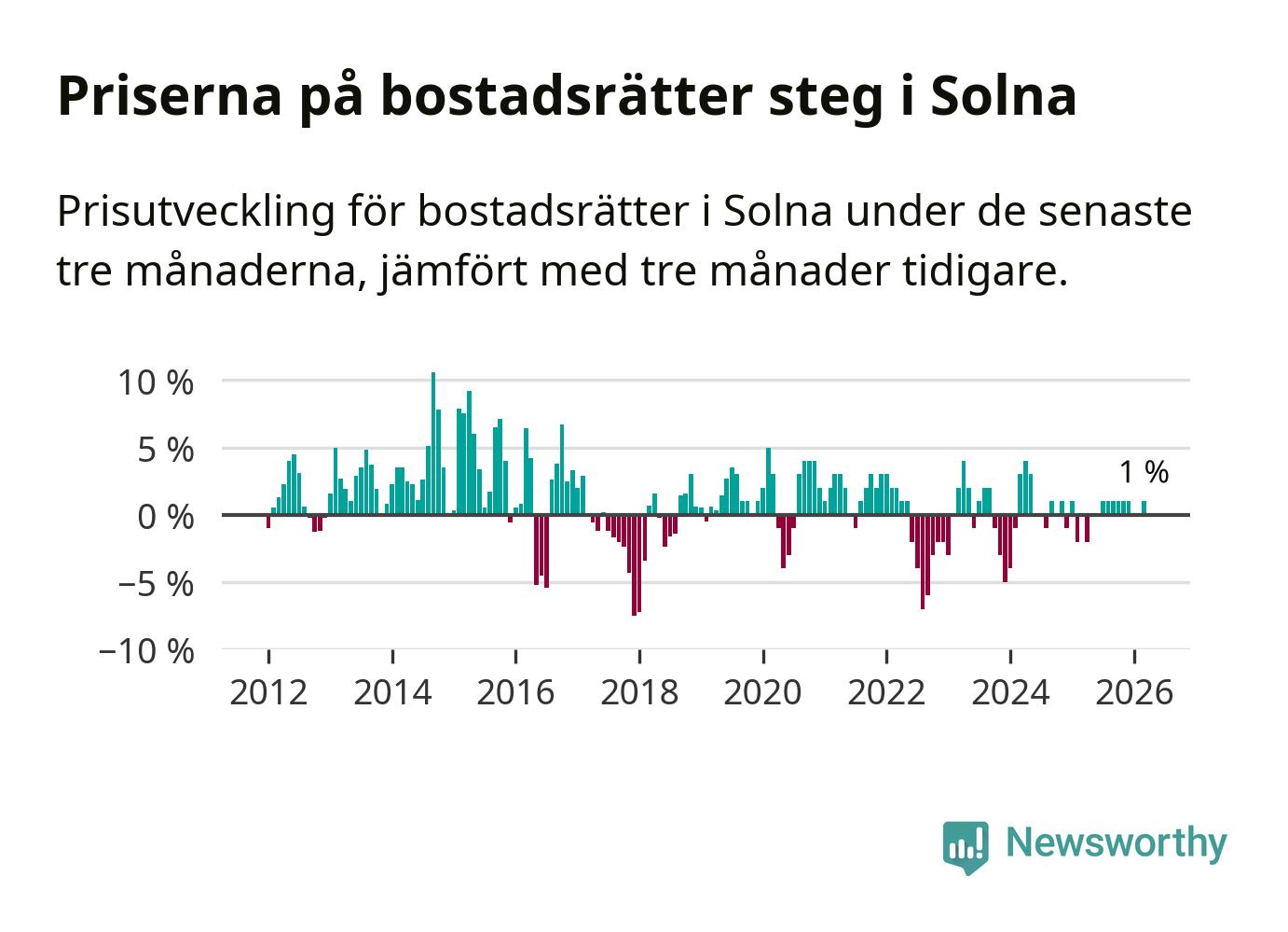 Priserna på bostadsrätter har gått upp i Solna kommun. Medelpriset på försäljningarna under de senaste tre månaderna visar på en uppgång med 1 procent.