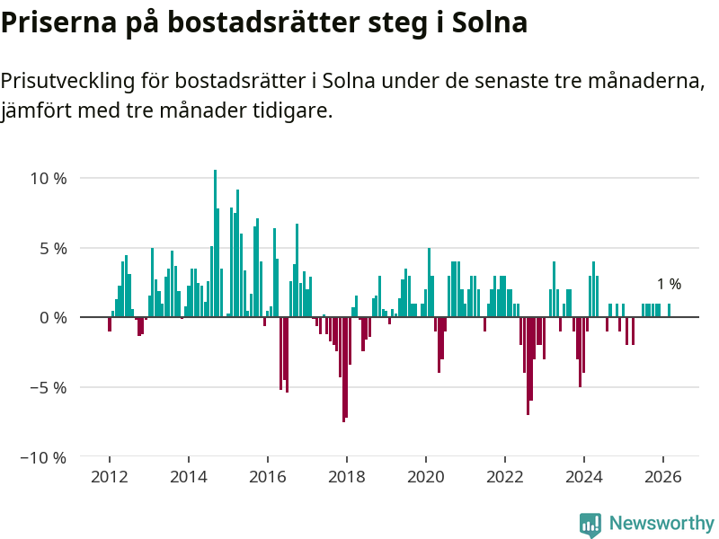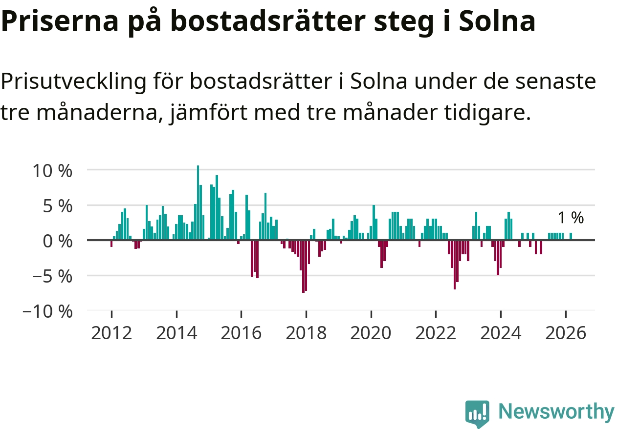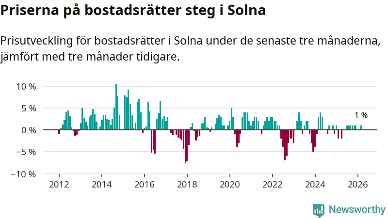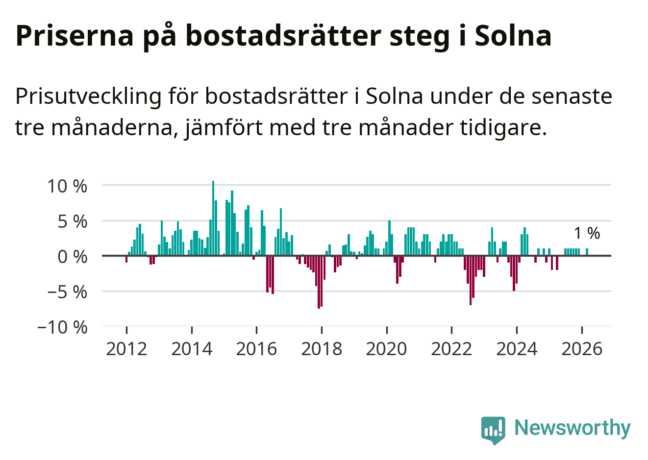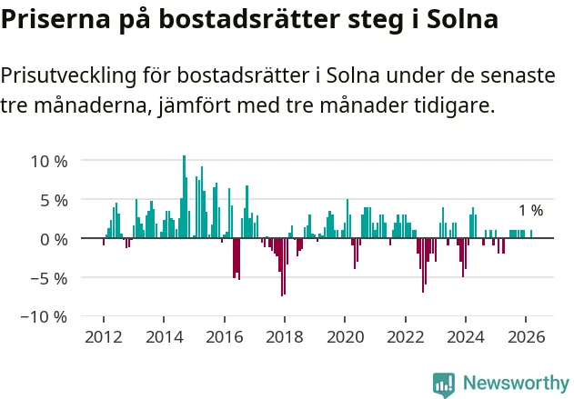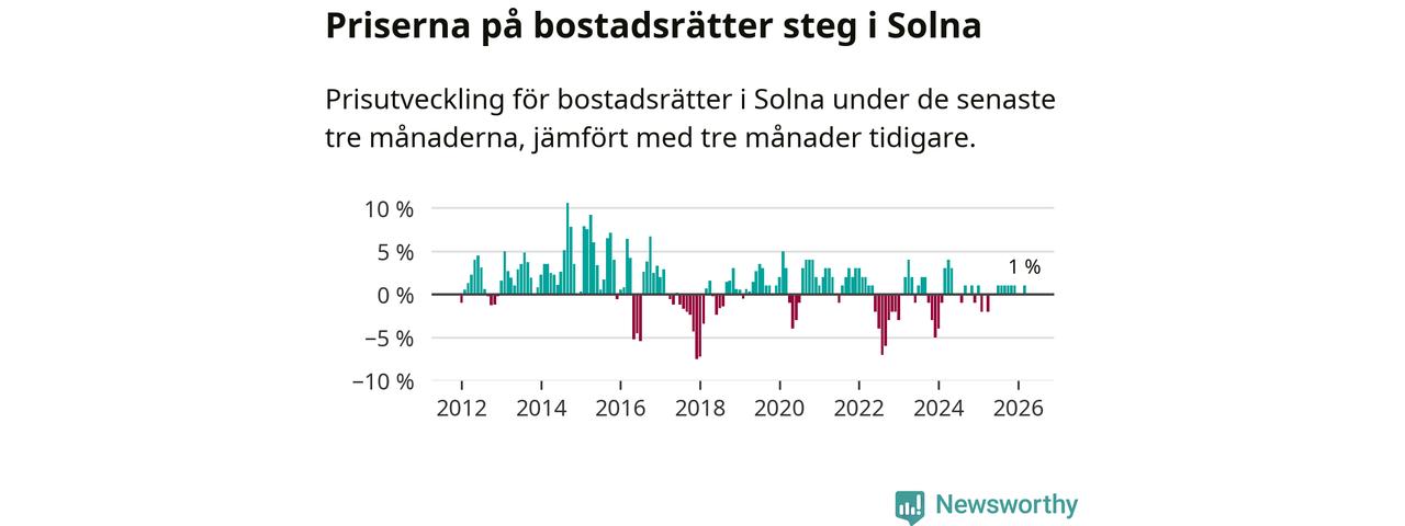 Priserna på bostadsrätter har gått upp i Solna kommun. Medelpriset på försäljningarna under de senaste tre månaderna visar på en uppgång med 1 procent.