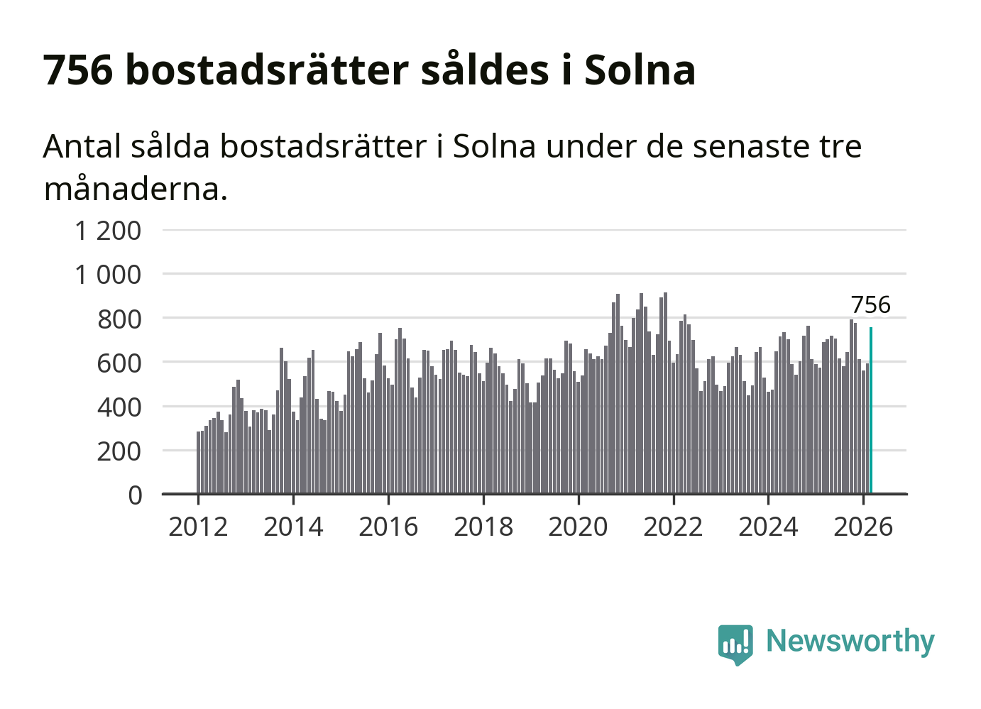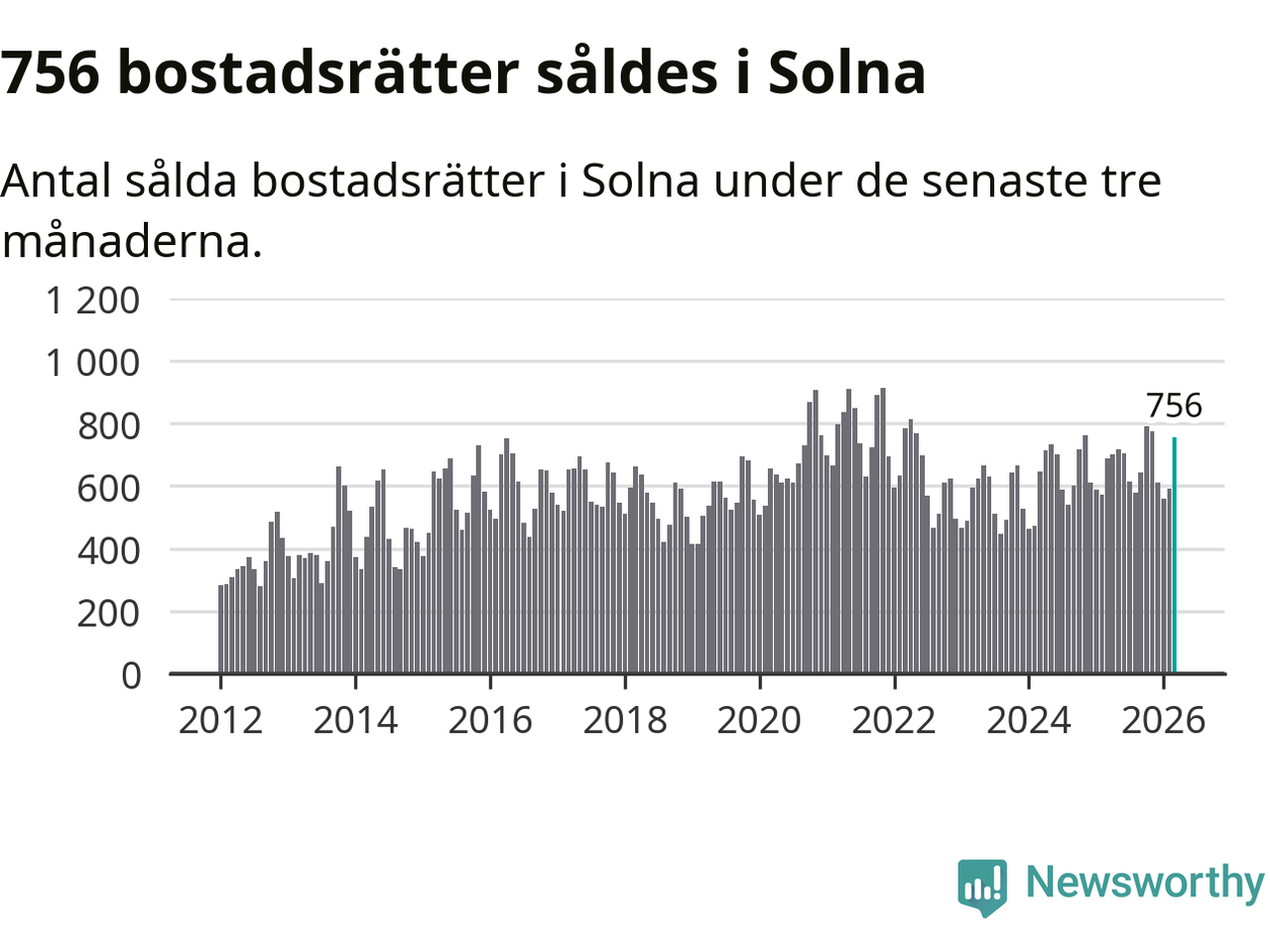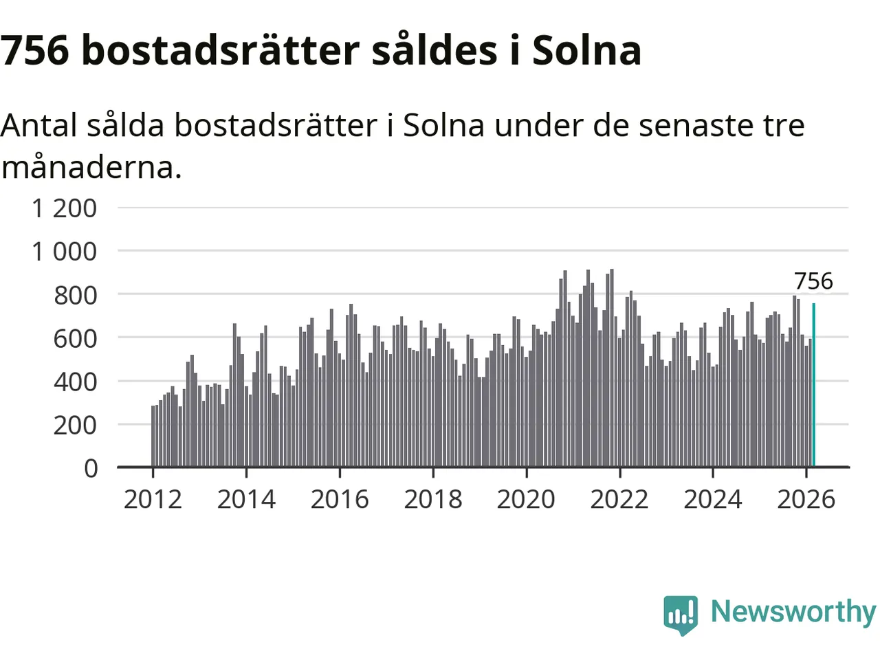 Sammanlagt såldes 756 bostadsrätter i Solna kommun mellan januari och mars till ett genomsnittligt pris på 4,0 miljoner kronor. I fjol gjordes 688 affärer vid den här tiden på året.