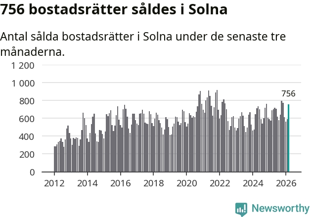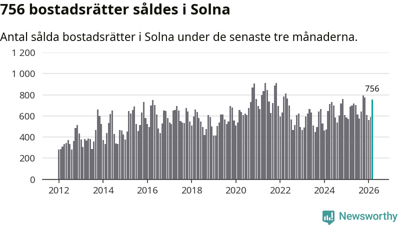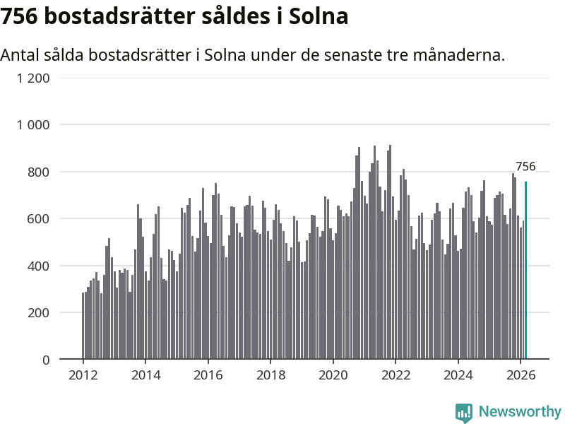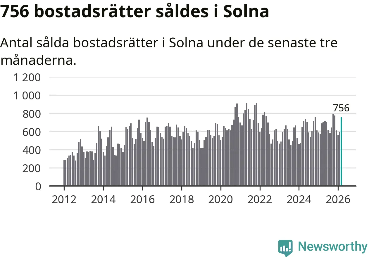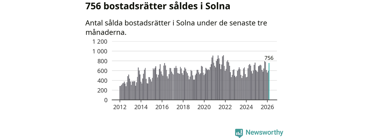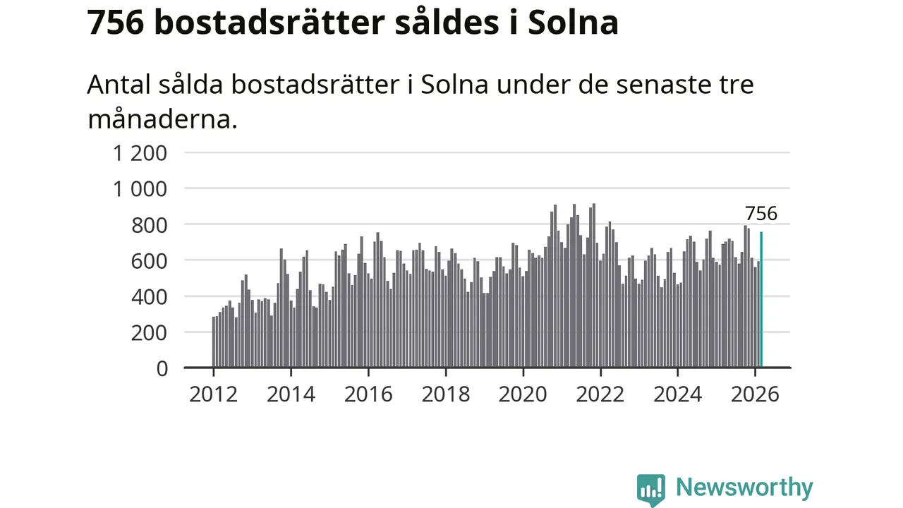 Sammanlagt såldes 756 bostadsrätter i Solna kommun mellan januari och mars till ett genomsnittligt pris på 4,0 miljoner kronor. I fjol gjordes 688 affärer vid den här tiden på året.