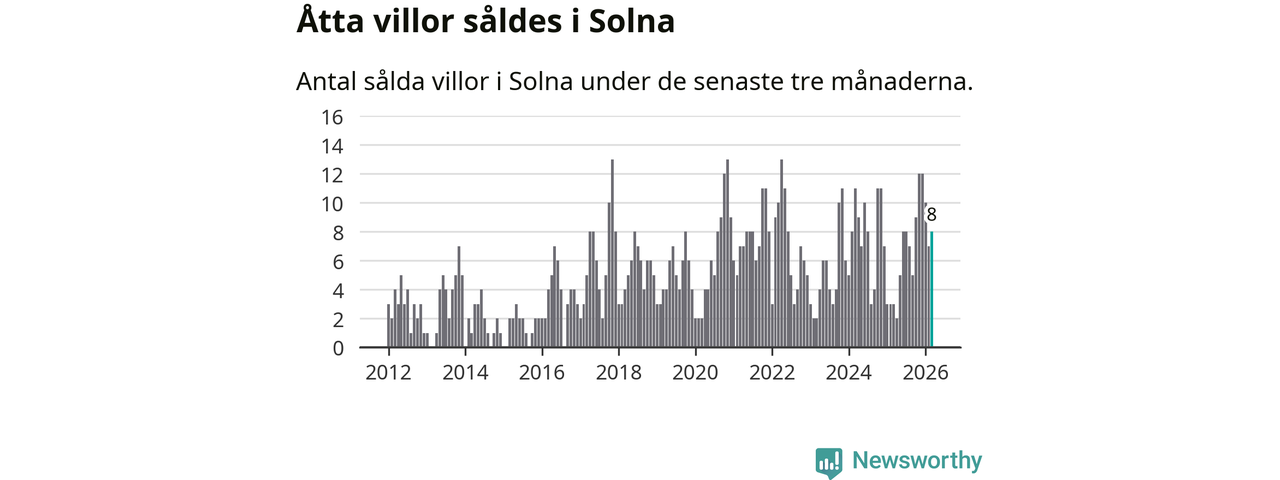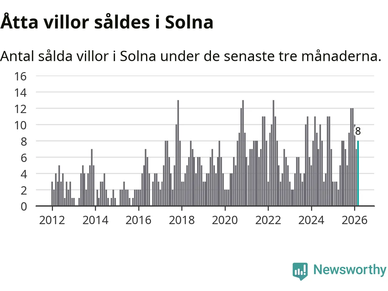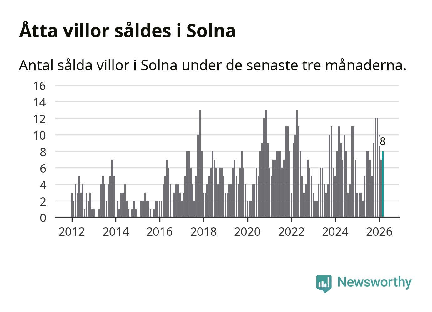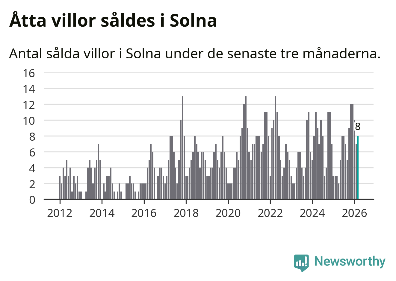 Mellan januari och mars gjordes sammanlagt åtta affärer med villor i Solna kommun. Det kan jämföras med tre vid motsvarande tid i fjol.