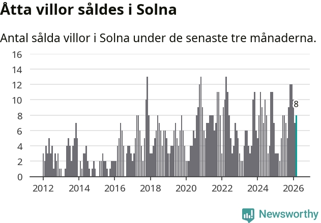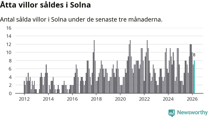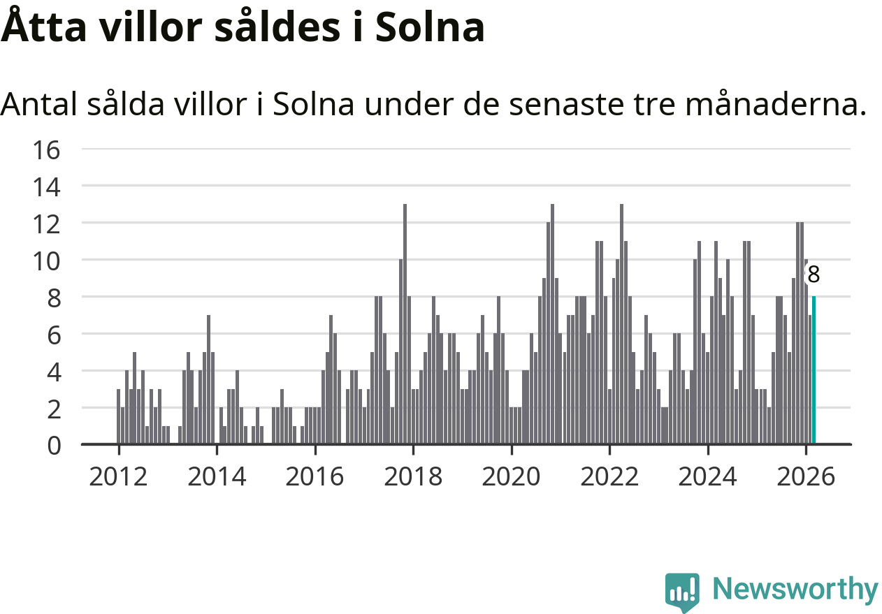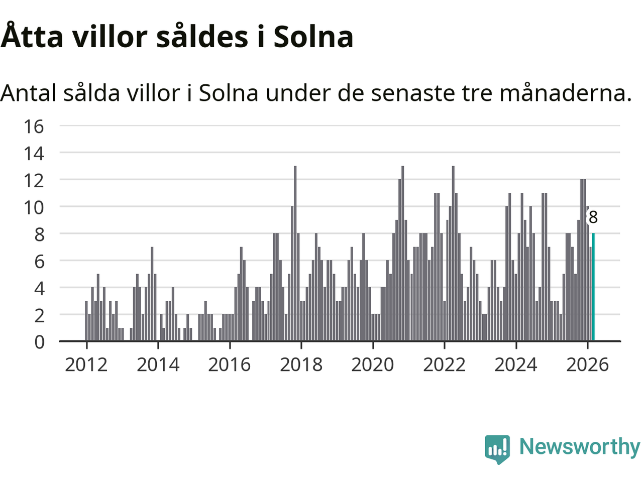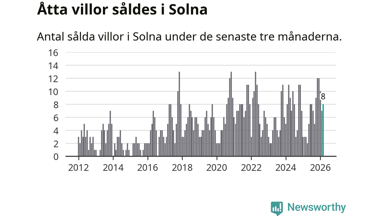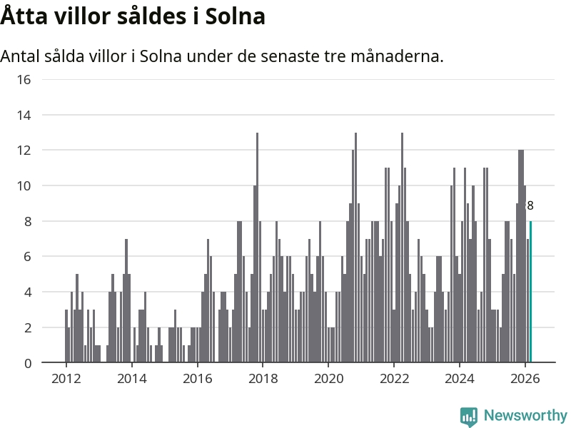 Mellan januari och mars gjordes sammanlagt åtta affärer med villor i Solna kommun. Det kan jämföras med tre vid motsvarande tid i fjol.