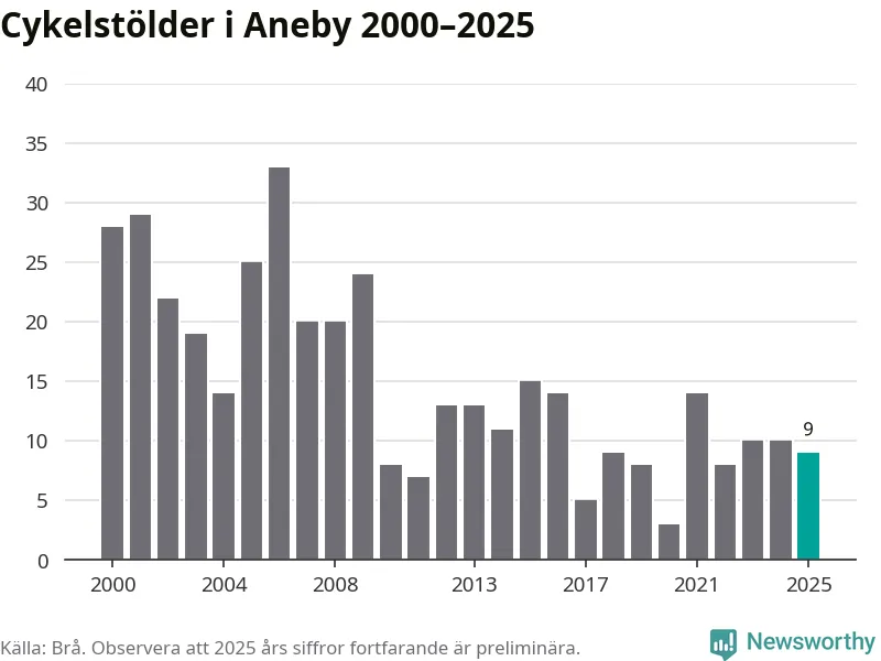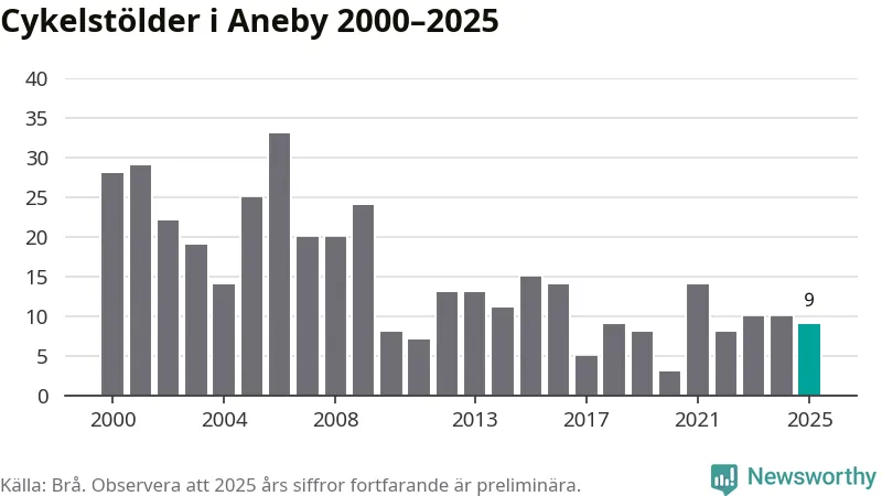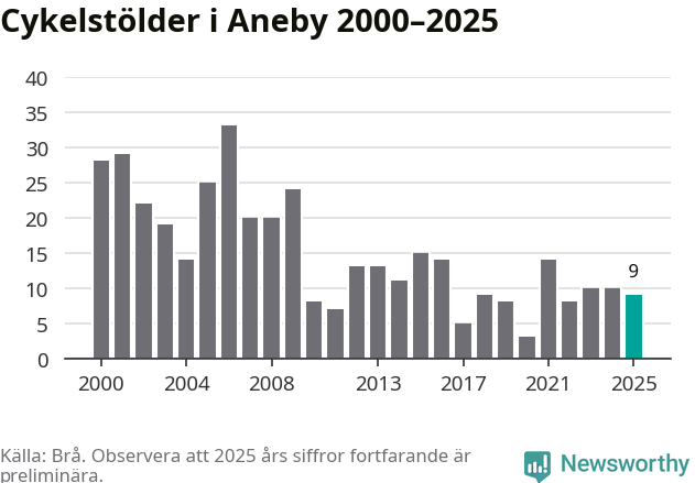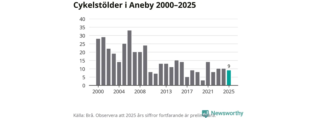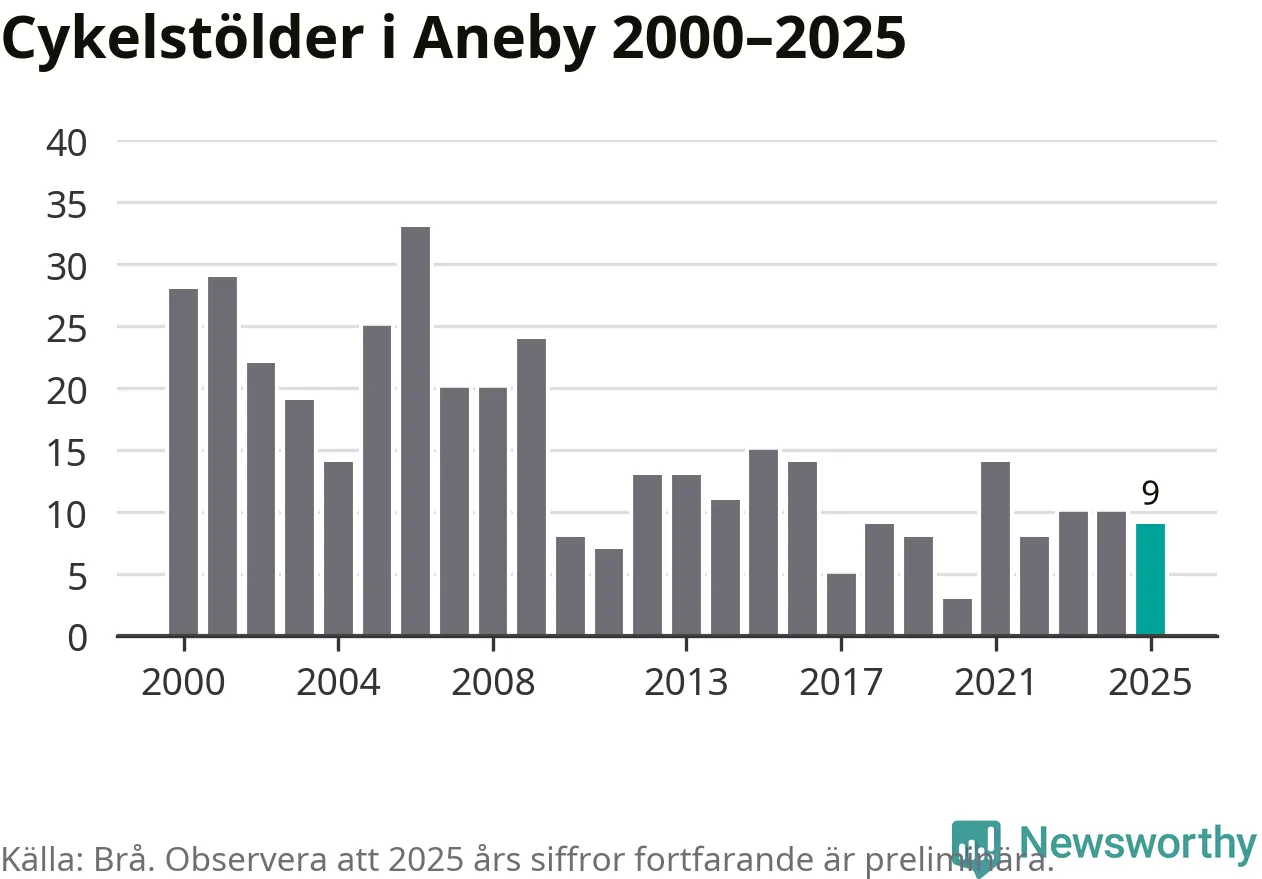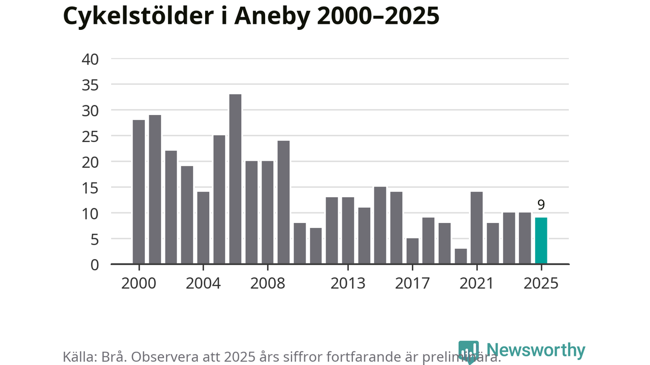 I Aneby kommun sticker antalet cykelstölder 2025 inte ut i en historisk kontext. Under de senaste 25 åren har det som mest anmälts 33 cykelstölder på ett år (2006), som minst 3 stycken (2020).