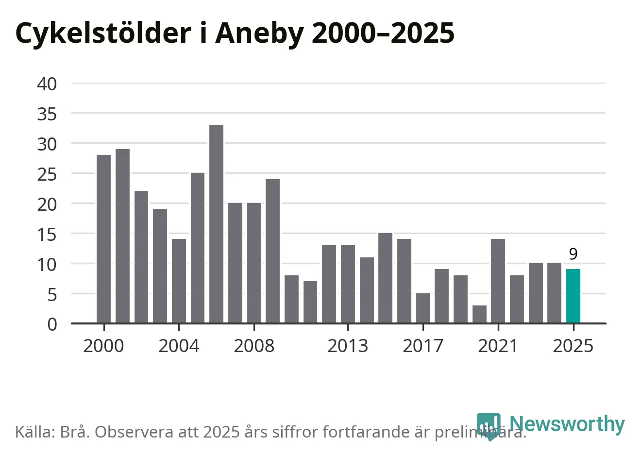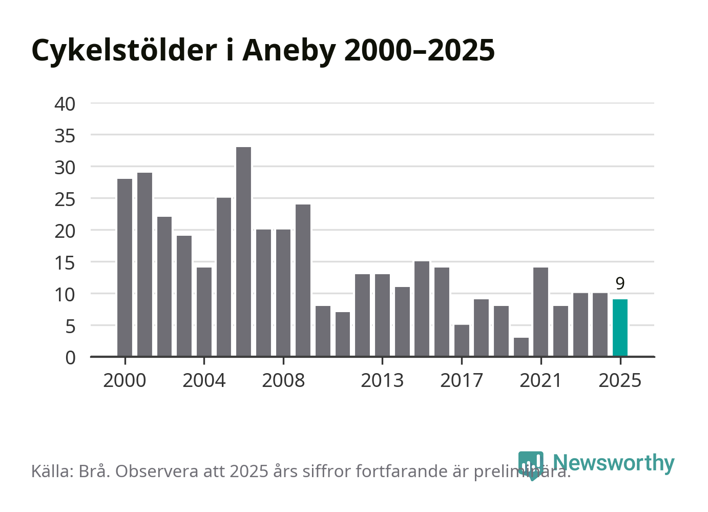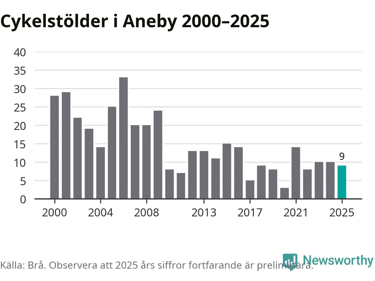 I Aneby kommun sticker antalet cykelstölder 2025 inte ut i en historisk kontext. Under de senaste 25 åren har det som mest anmälts 33 cykelstölder på ett år (2006), som minst 3 stycken (2020).