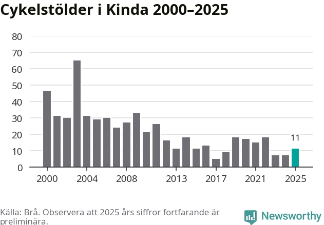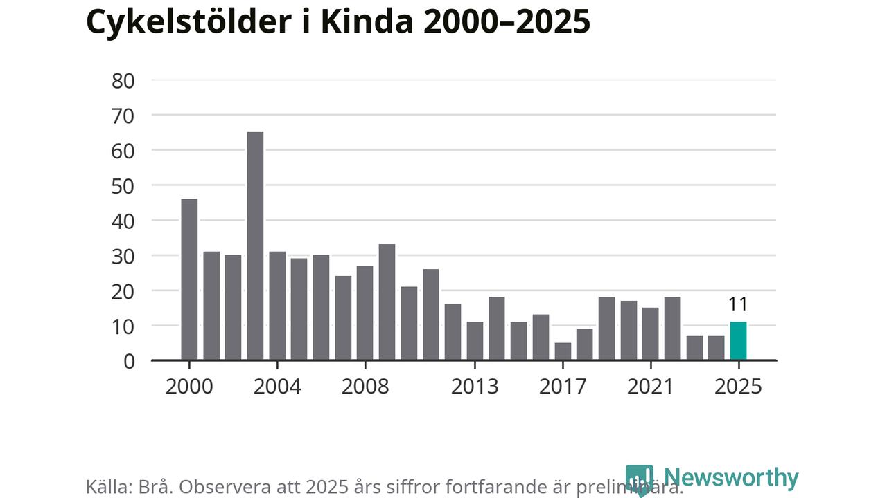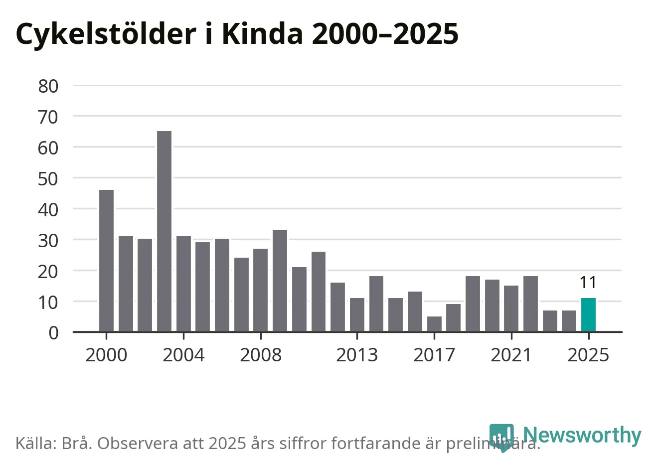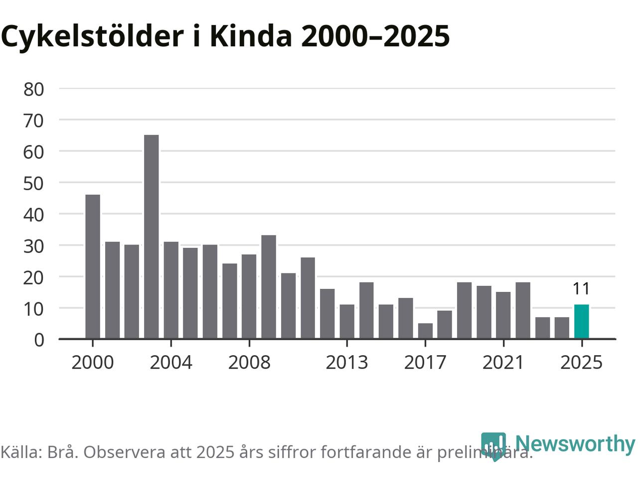 Av de elva stöldanmälningar i Kinda 2025 gällde sex elcyklar, det motsvarar 55 procent. Brå särredovisar elcyklar sedan 2020 och i riket som helhet ökade anmälningarna om stulna elcyklar kraftigt de första åren, för att de senaste tre åren ha legat relativt stilla. Eftersom antalet cykelstölder totalt har minskat under samma tid har andelen elcyklar ökat. I fjol stod elcyklar för 28 procent av alla anmälda cykelstölder i landet.