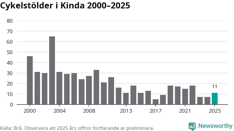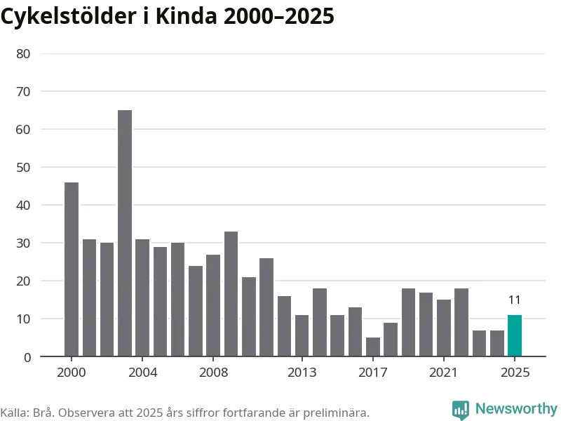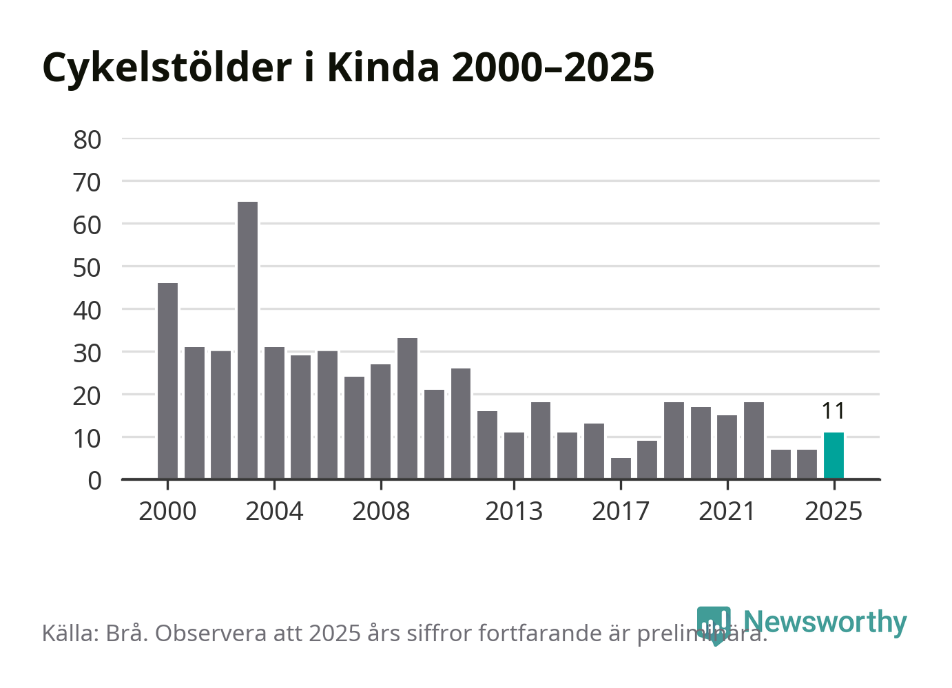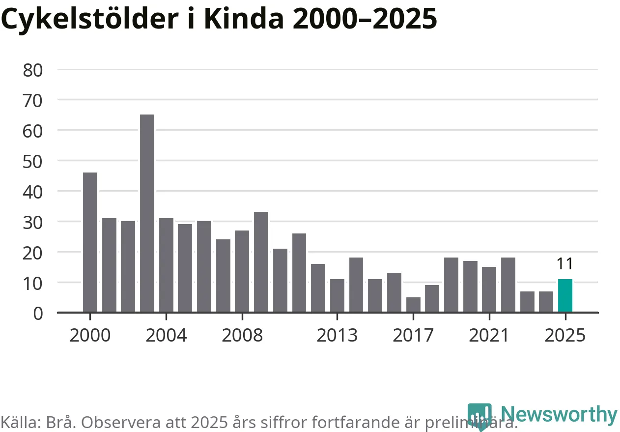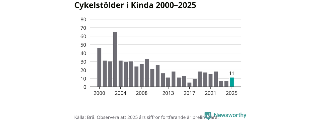 Av de elva stöldanmälningar i Kinda 2025 gällde sex elcyklar, det motsvarar 55 procent. Brå särredovisar elcyklar sedan 2020 och i riket som helhet ökade anmälningarna om stulna elcyklar kraftigt de första åren, för att de senaste tre åren ha legat relativt stilla. Eftersom antalet cykelstölder totalt har minskat under samma tid har andelen elcyklar ökat. I fjol stod elcyklar för 28 procent av alla anmälda cykelstölder i landet.