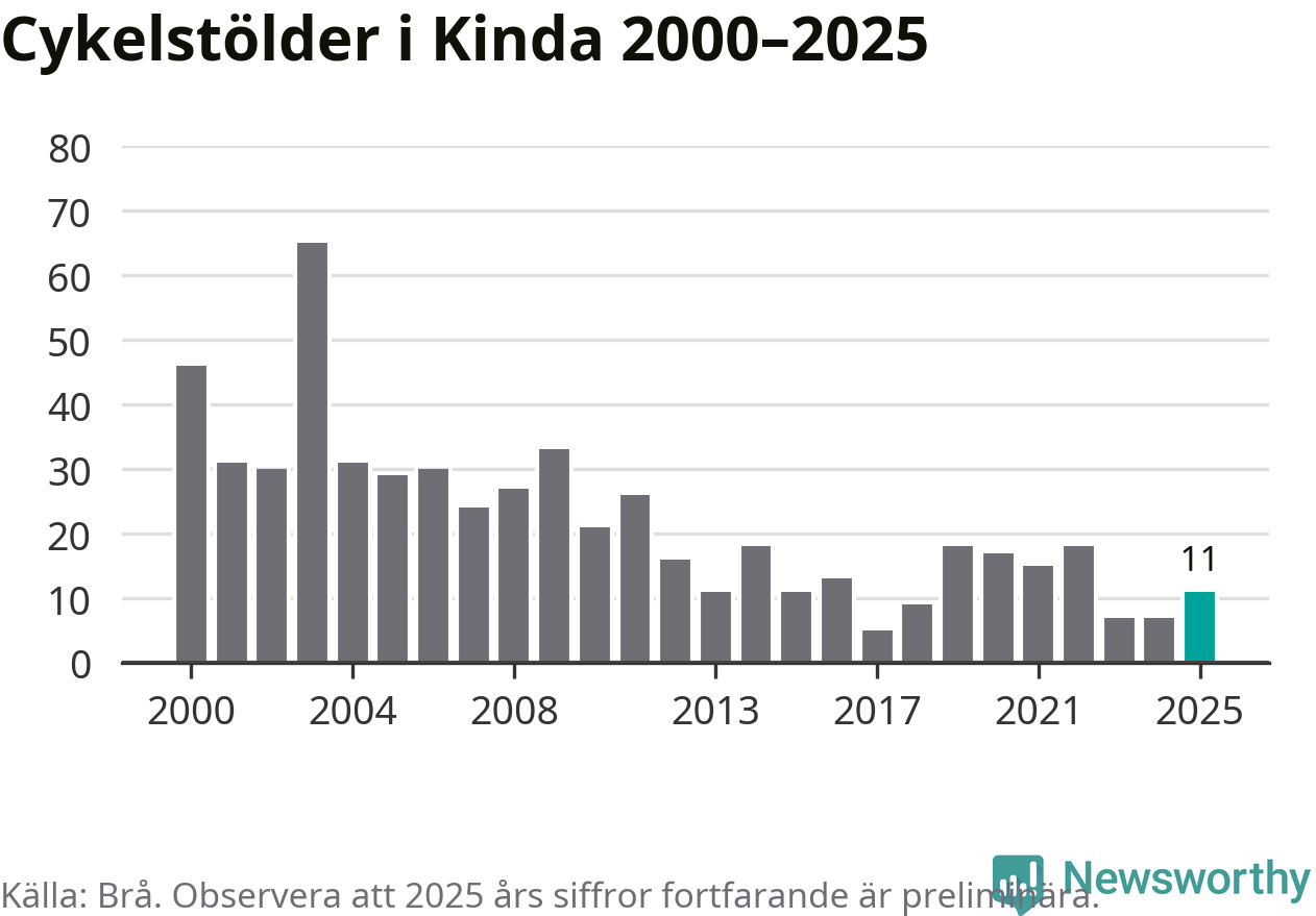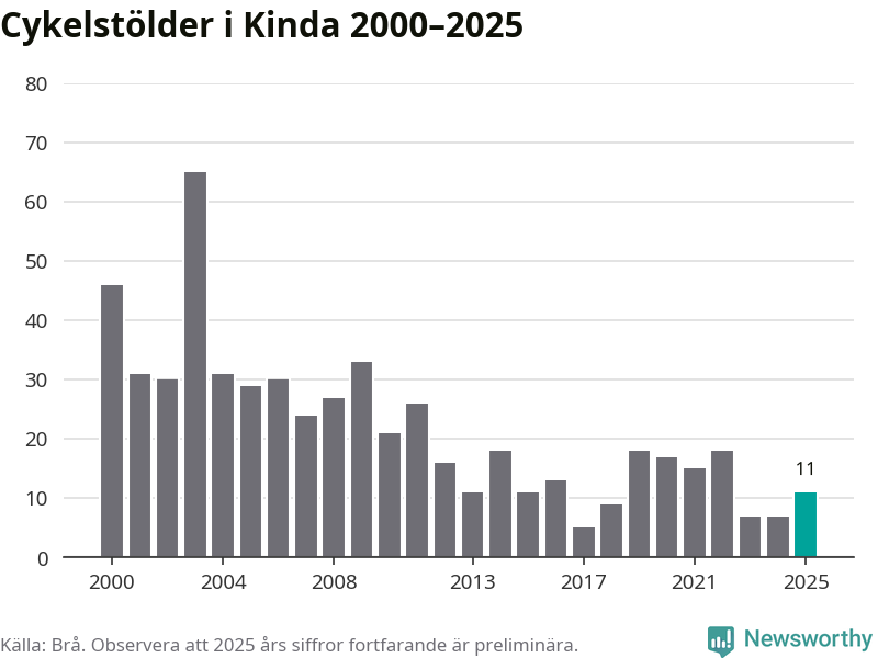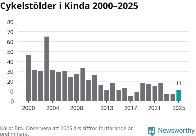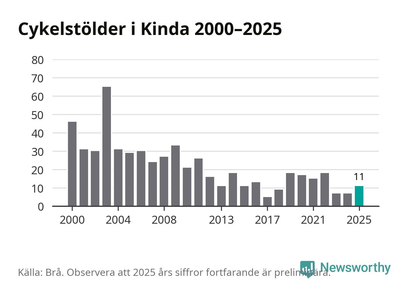 I Kinda kommun var antalet cykelstölder relativt få i en historisk kontext år 2025, även om det fortfarande är preliminära siffror. Under de senaste 25 åren har det som mest anmälts 65 cykelstölder på ett år (2003), som minst 5 stycken (2017).