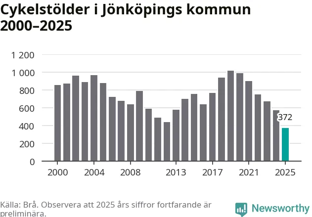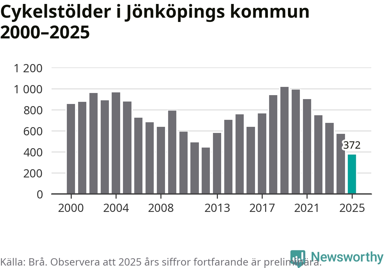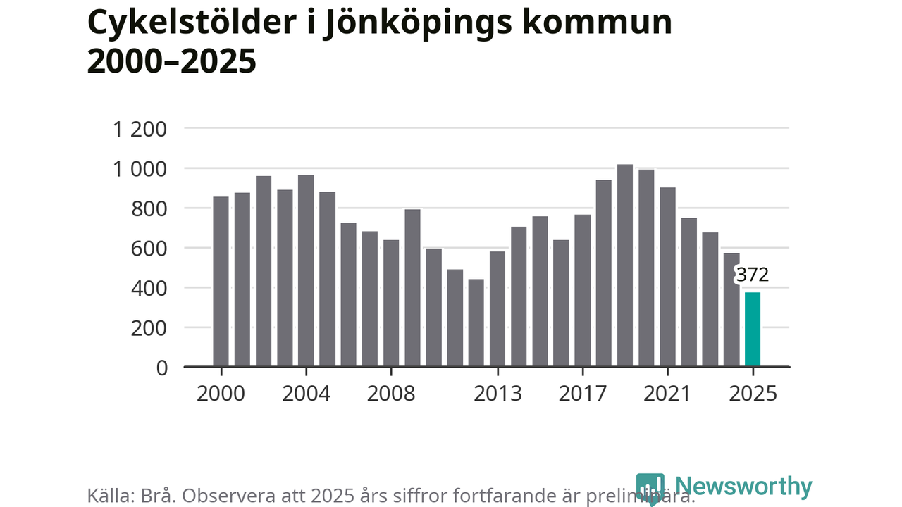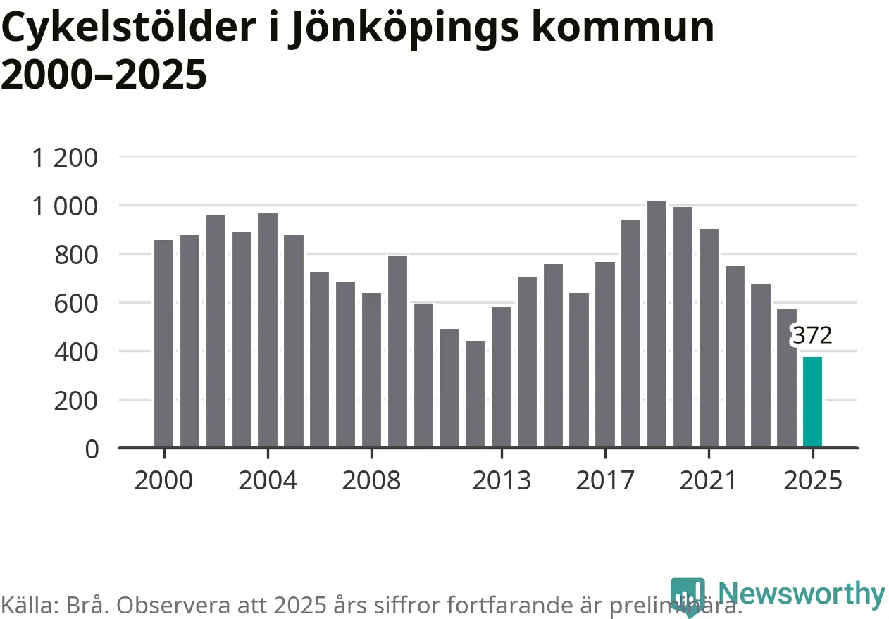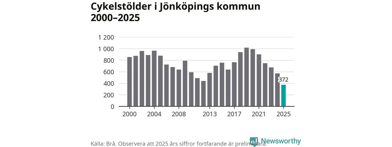 I Jönköpings kommun noterades det lägsta antalet cykelstölder under hela 2000-talet år 2025, även om det fortfarande är preliminära siffror. Under de senaste 25 åren har det som mest anmälts 1 017 cykelstölder på ett år (2019).
