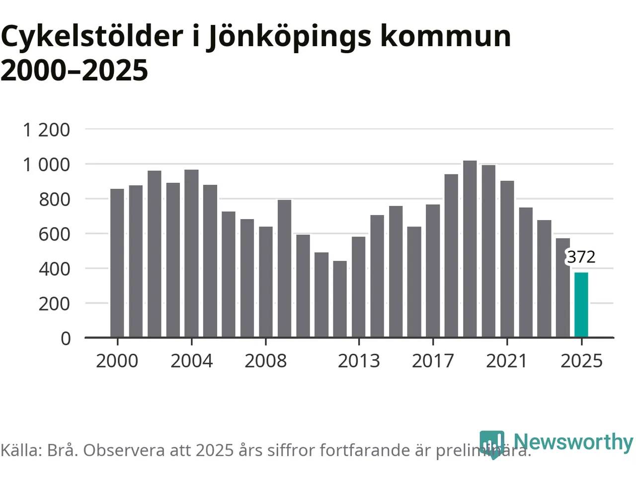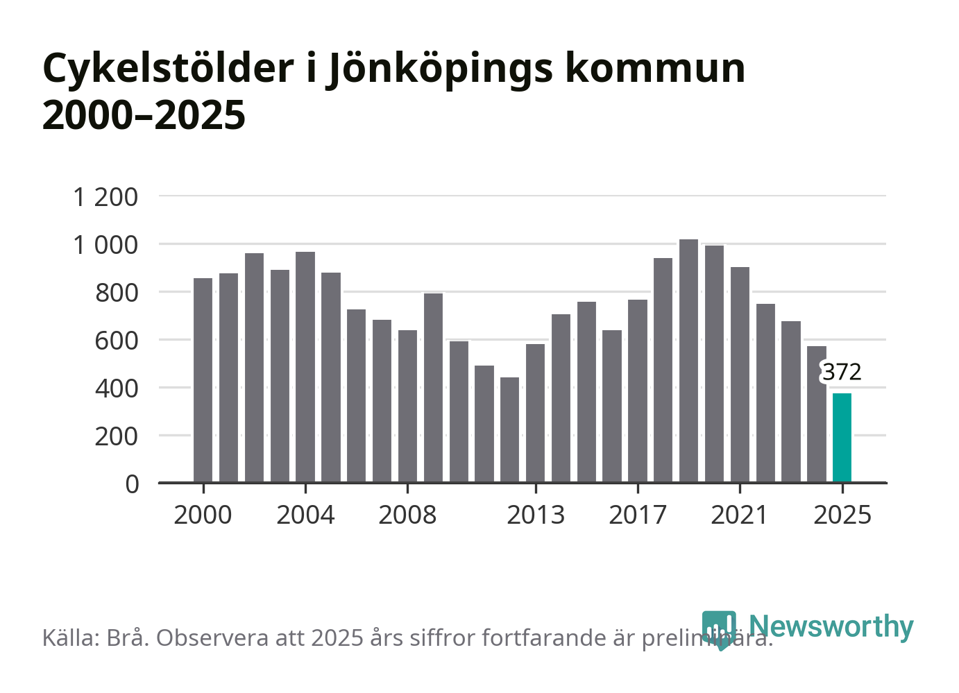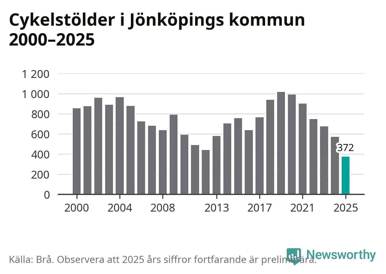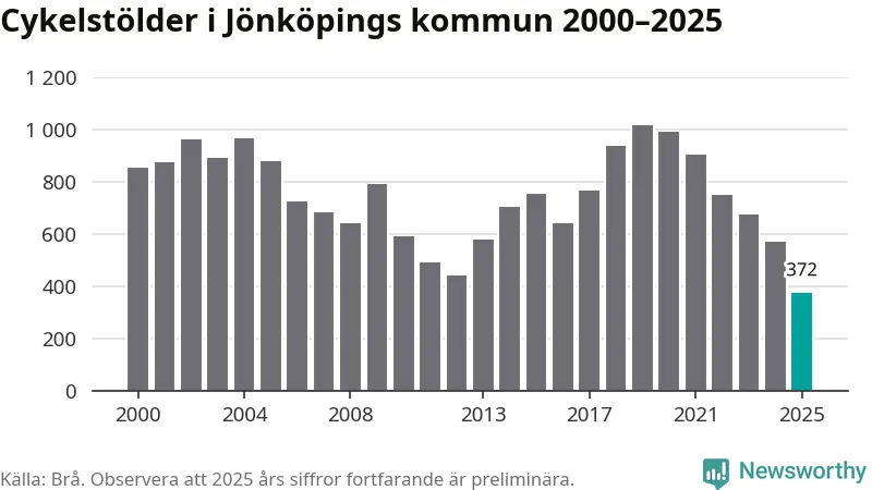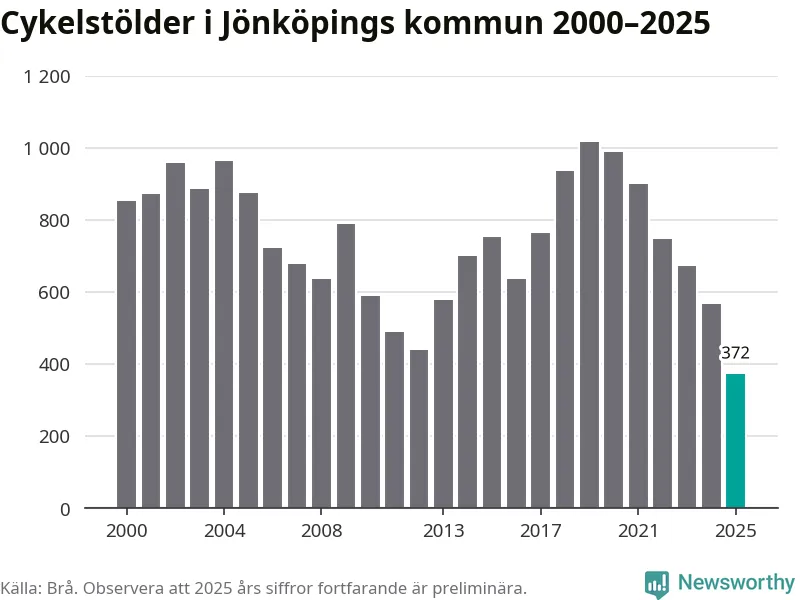 I Jönköpings kommun noterades det lägsta antalet cykelstölder under hela 2000-talet år 2025, även om det fortfarande är preliminära siffror. Under de senaste 25 åren har det som mest anmälts 1 017 cykelstölder på ett år (2019).