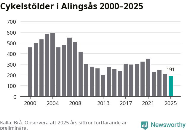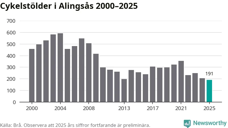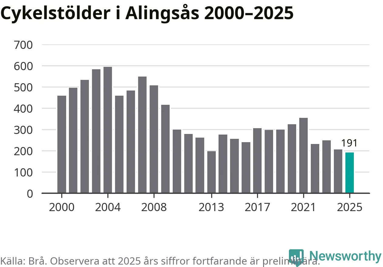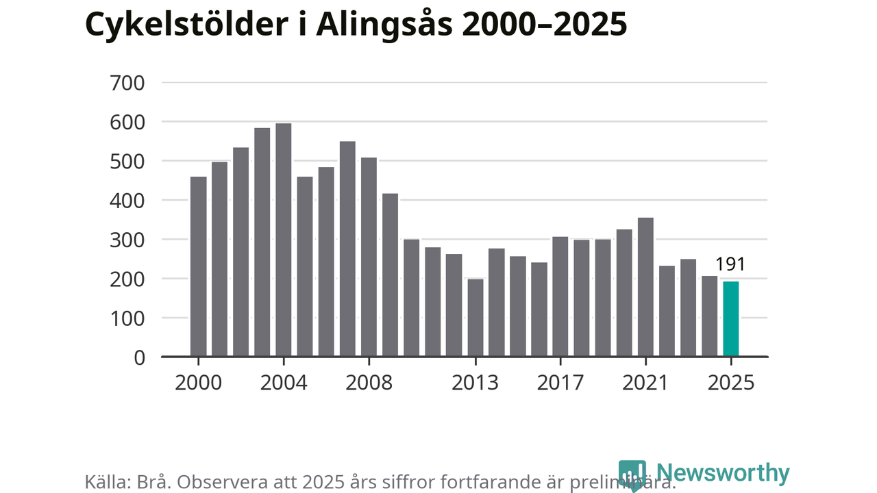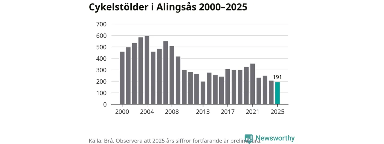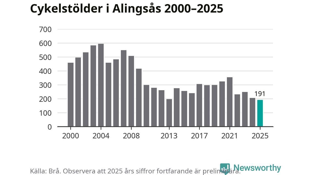 I Alingsås kommun noterades det lägsta antalet cykelstölder under hela 2000-talet år 2025, även om det fortfarande är preliminära siffror. Under de senaste 25 åren har det som mest anmälts 594 cykelstölder på ett år (2004).