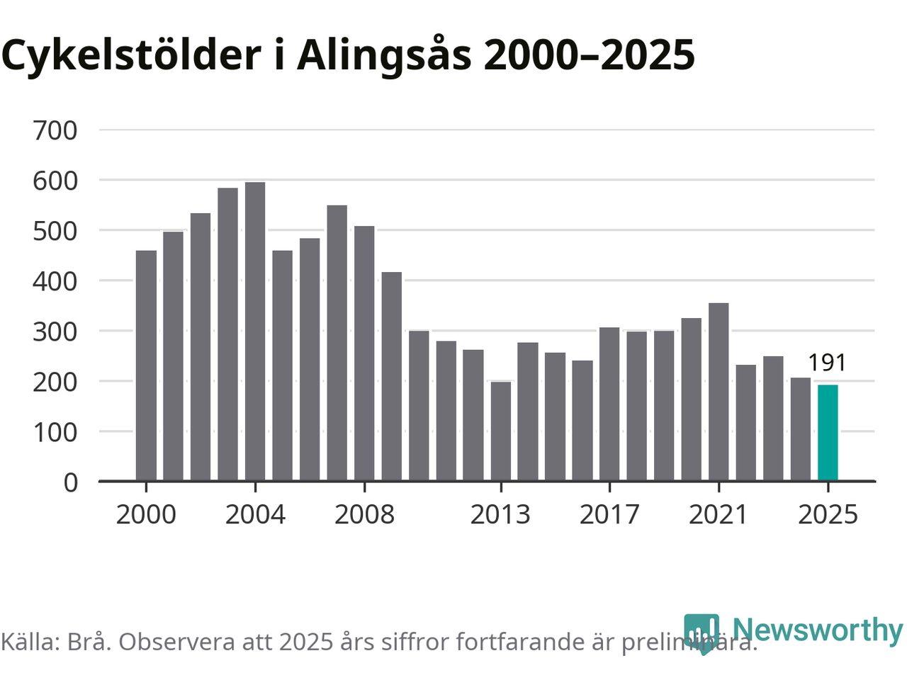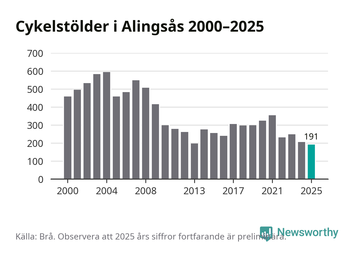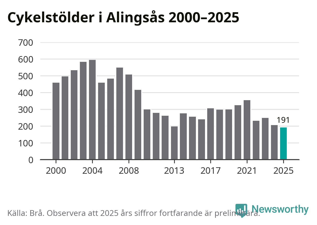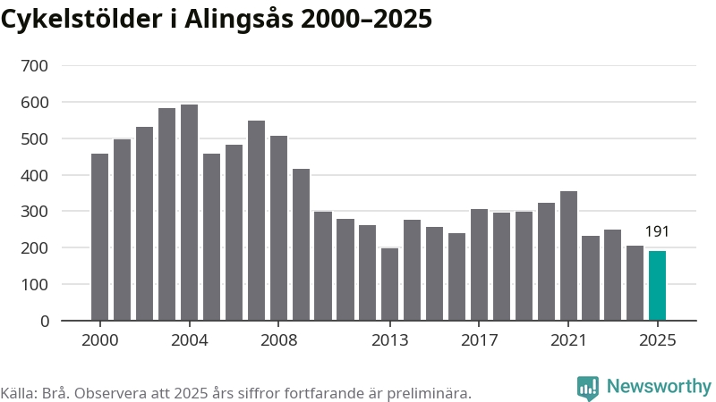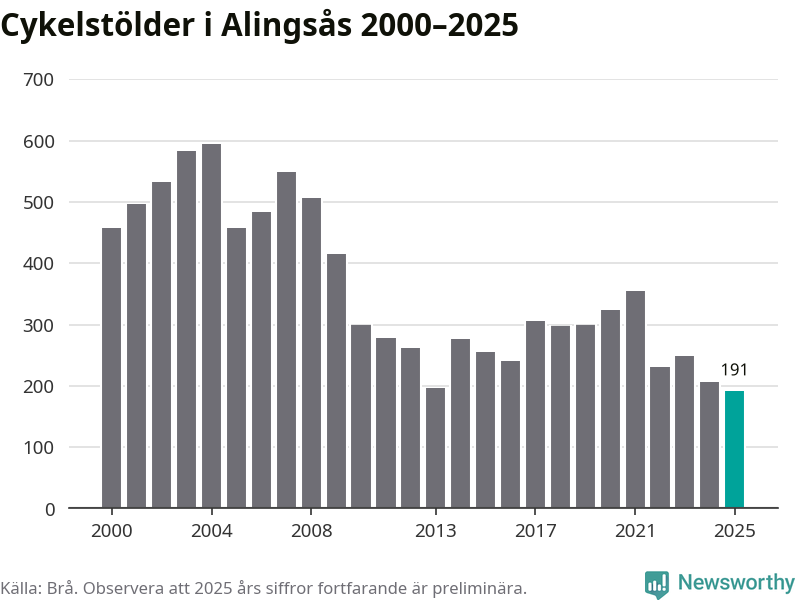 I Alingsås kommun noterades det lägsta antalet cykelstölder under hela 2000-talet år 2025, även om det fortfarande är preliminära siffror. Under de senaste 25 åren har det som mest anmälts 594 cykelstölder på ett år (2004).