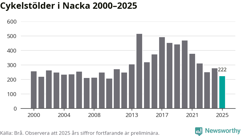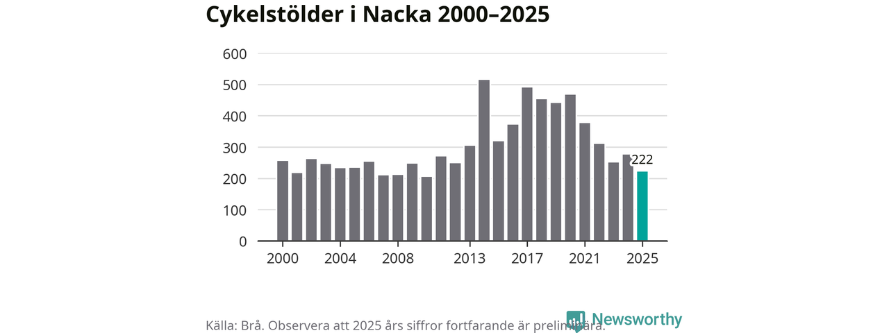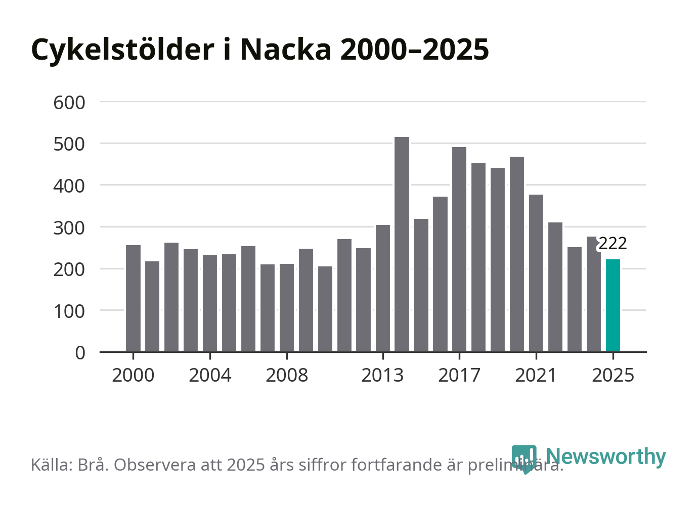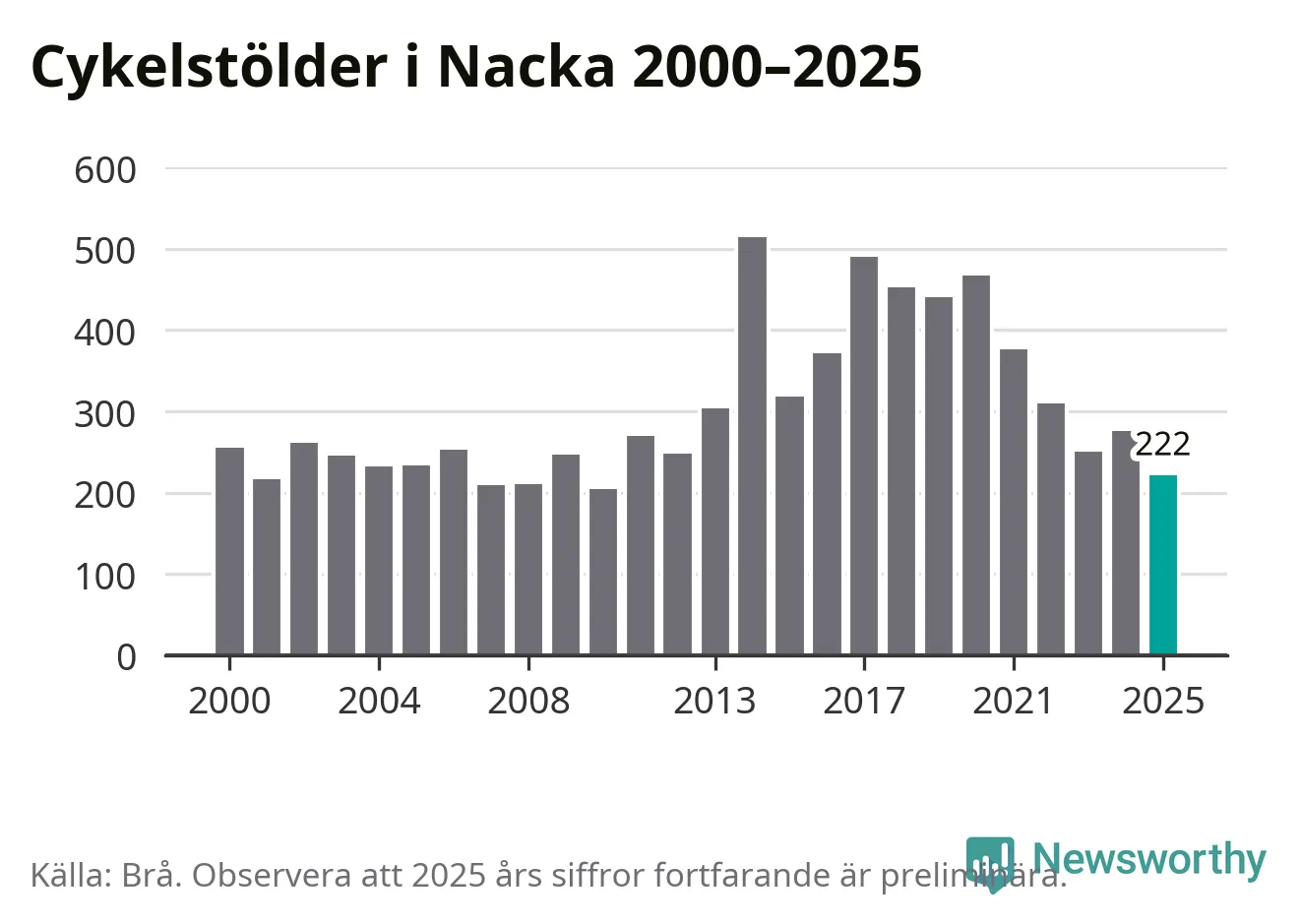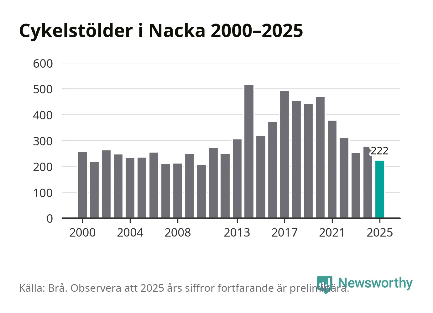 I Nacka kommun var antalet cykelstölder relativt få i en historisk kontext år 2025, även om det fortfarande är preliminära siffror. Under de senaste 25 åren har det som mest anmälts 514 cykelstölder på ett år (2014), som minst 205 stycken (2010).