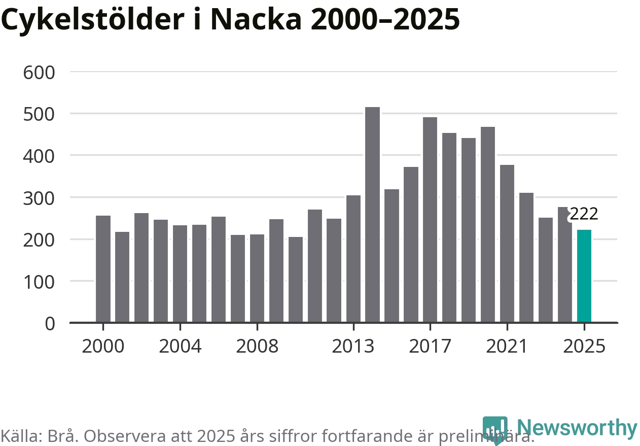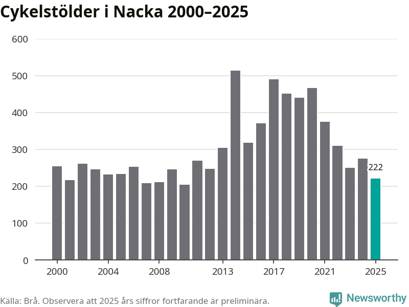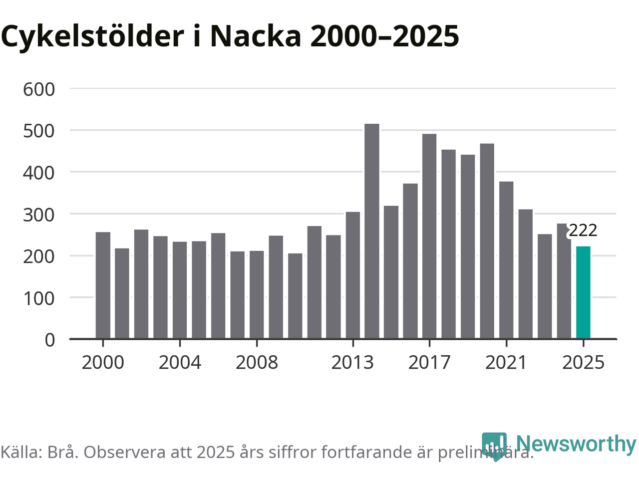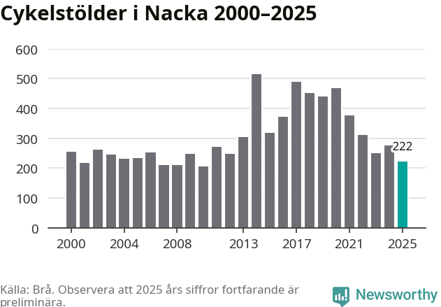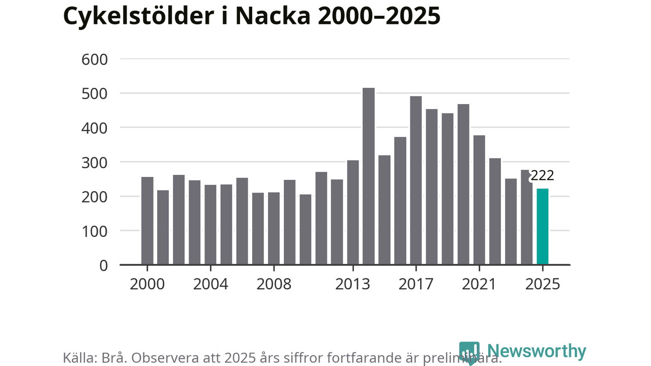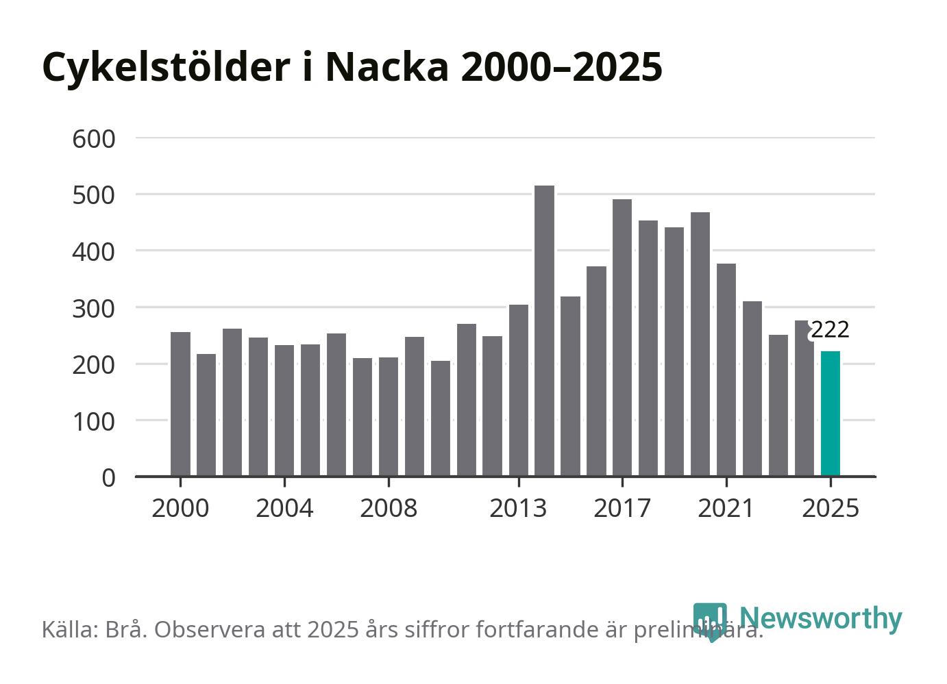 I Nacka kommun var antalet cykelstölder relativt få i en historisk kontext år 2025, även om det fortfarande är preliminära siffror. Under de senaste 25 åren har det som mest anmälts 514 cykelstölder på ett år (2014), som minst 205 stycken (2010).