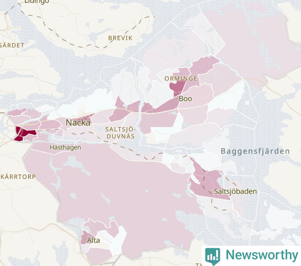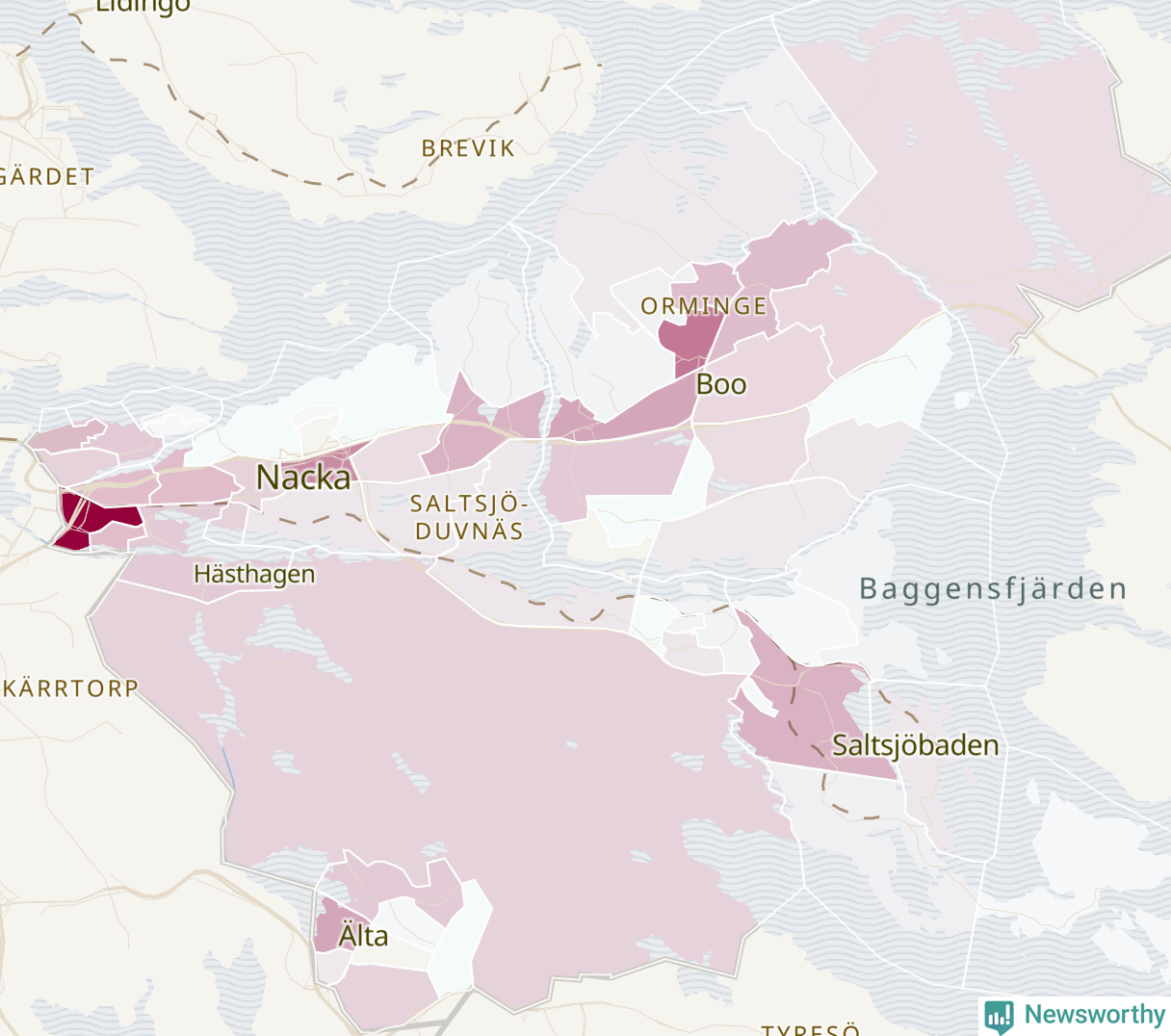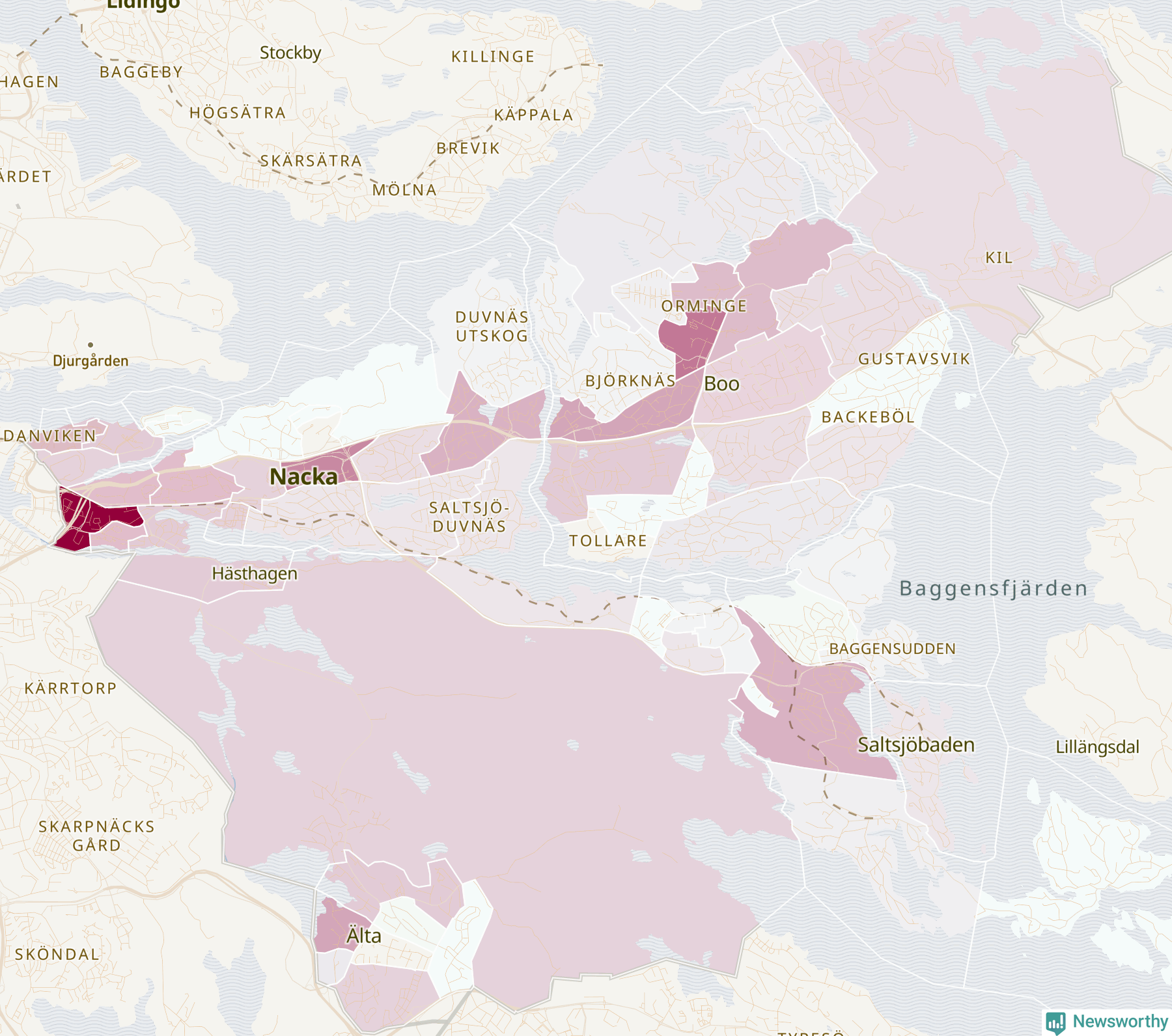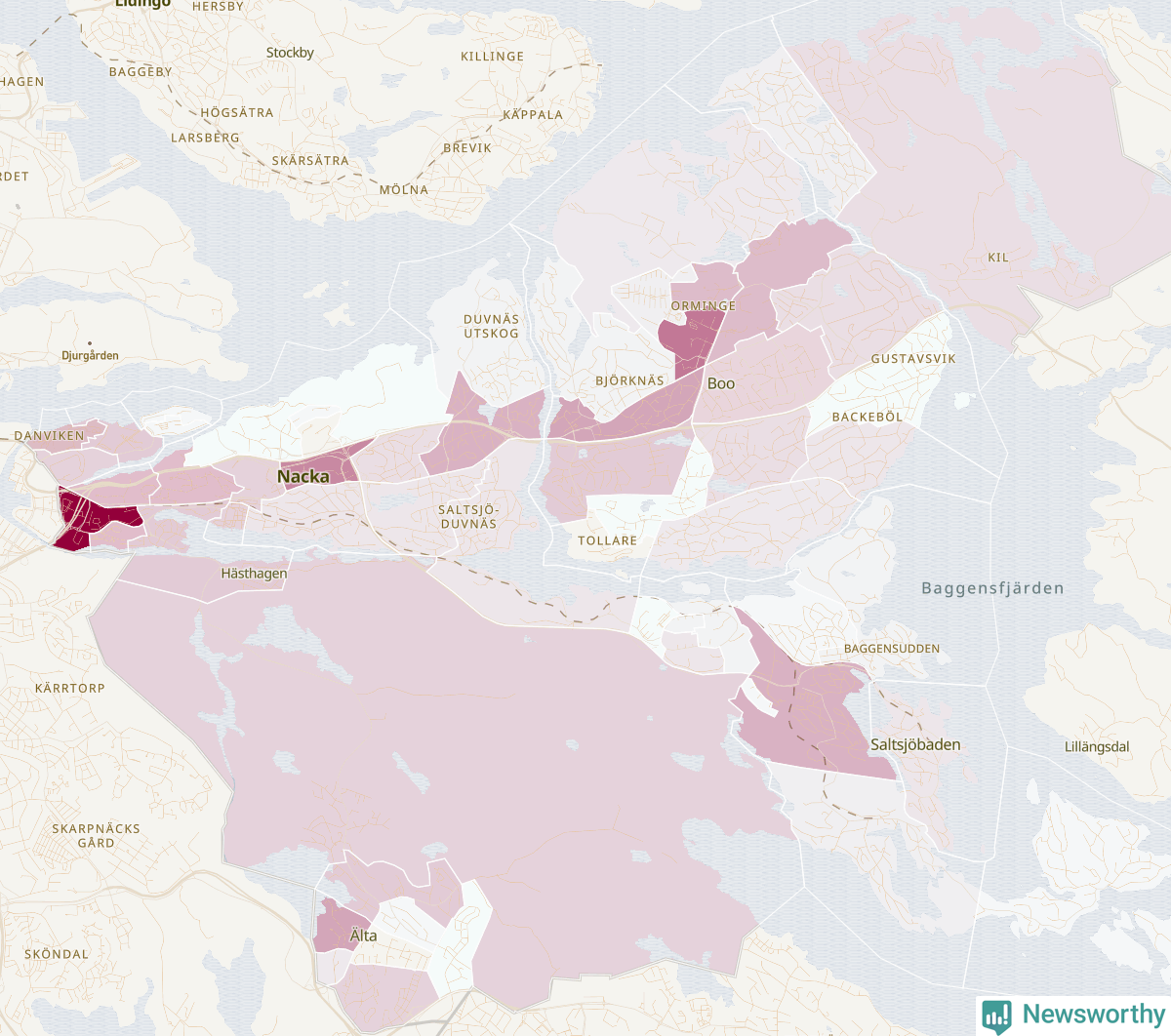 Men alla delar av Nacka är inte lika hårt drabbade. Det visar data för de senaste fem åren, som Newsworthy har begärt ut från polisen. De anmälda stölderna har kopplats till SCB:s 59 statistiska områden i kommunen. I tre områden finns inga cykelstölder registrerade, men i de övriga rör det sig om mellan en handfull och omkring 100 anmälda stölder per område.