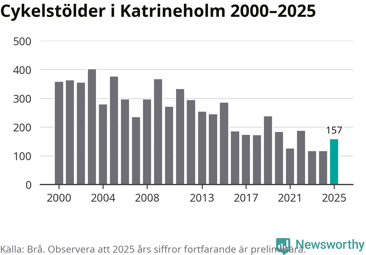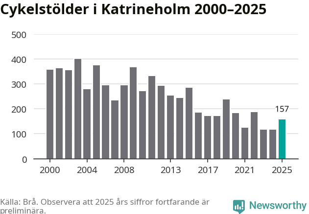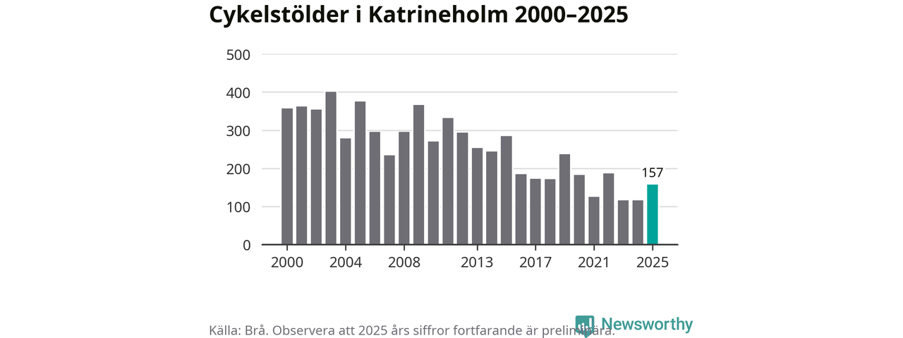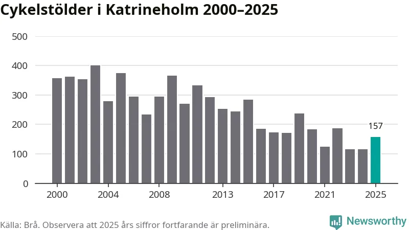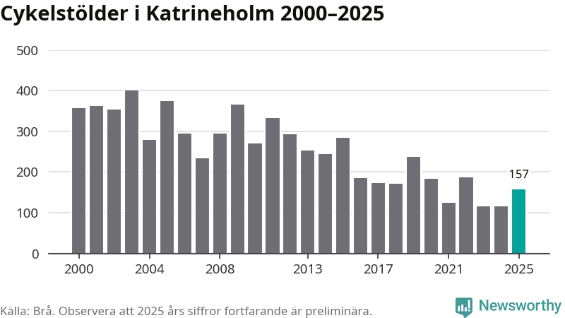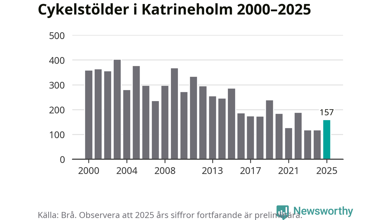 I Katrineholms kommun var antalet cykelstölder relativt få i en historisk kontext år 2025, även om det fortfarande är preliminära siffror. Under de senaste 25 åren har det som mest anmälts 400 cykelstölder på ett år (2003), som minst 116 stycken (2023 och 2024).