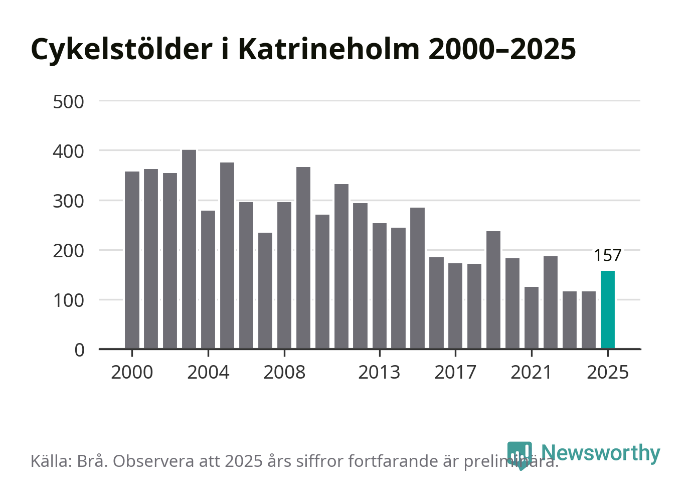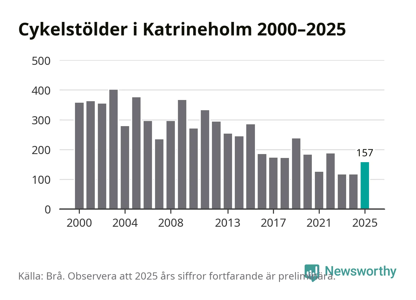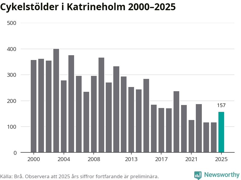 I Katrineholms kommun var antalet cykelstölder relativt få i en historisk kontext år 2025, även om det fortfarande är preliminära siffror. Under de senaste 25 åren har det som mest anmälts 400 cykelstölder på ett år (2003), som minst 116 stycken (2023 och 2024).