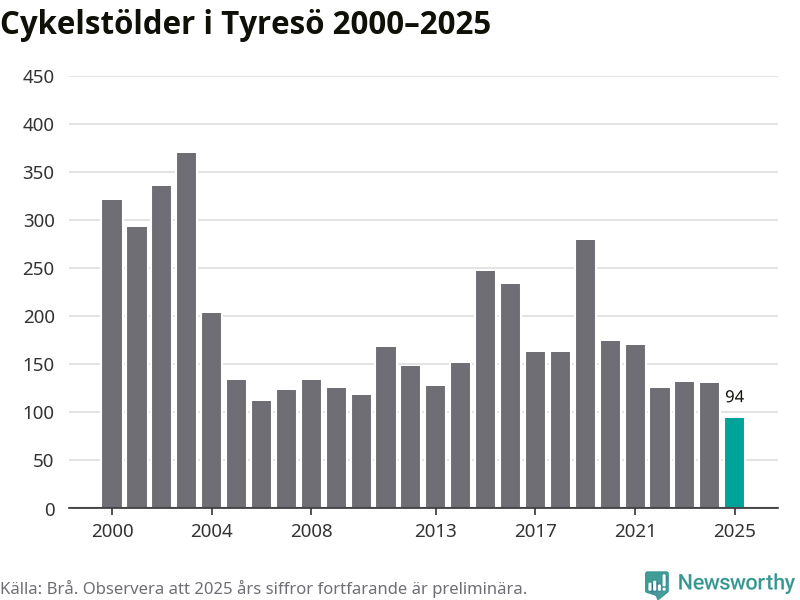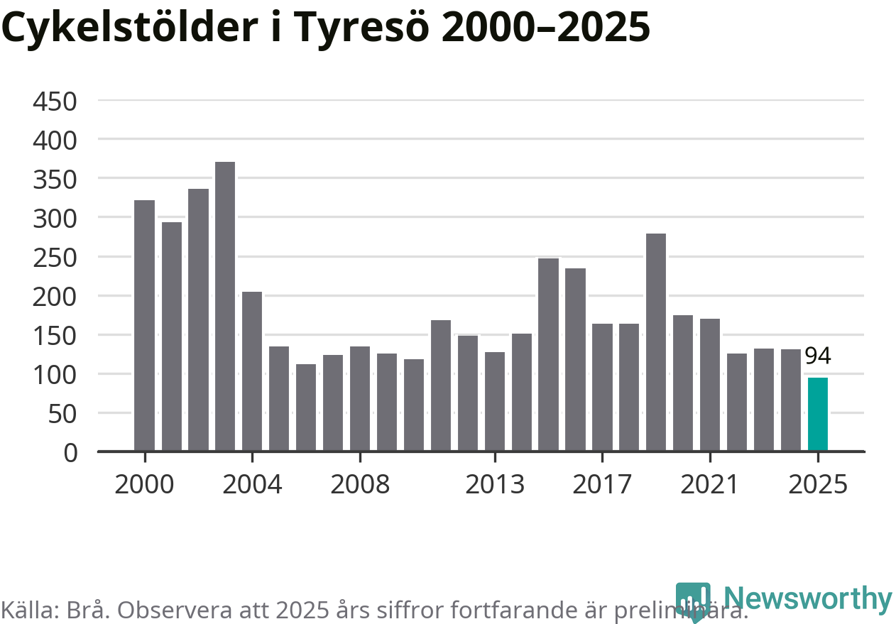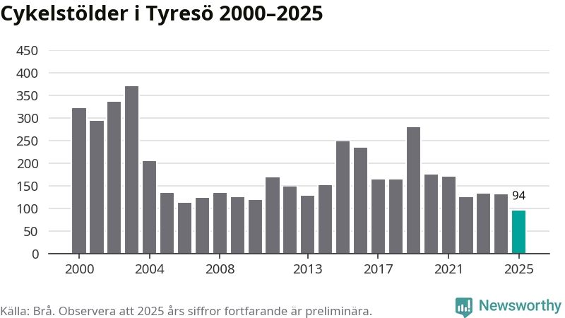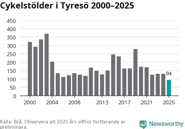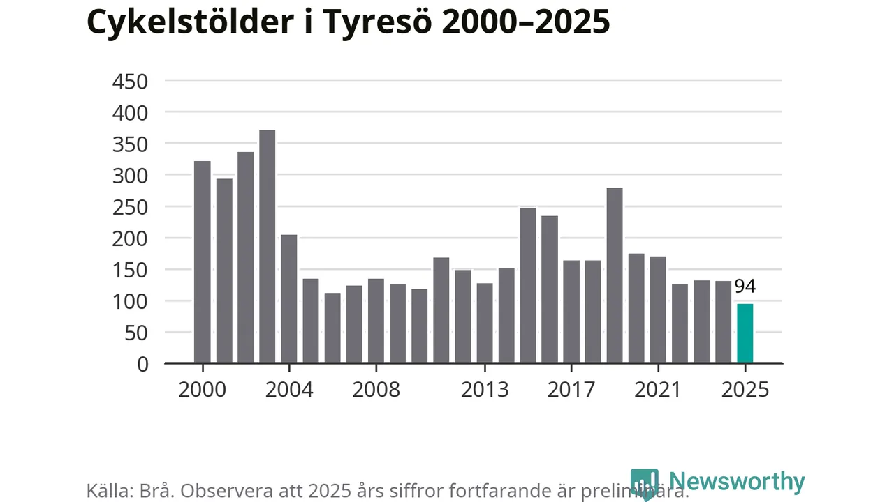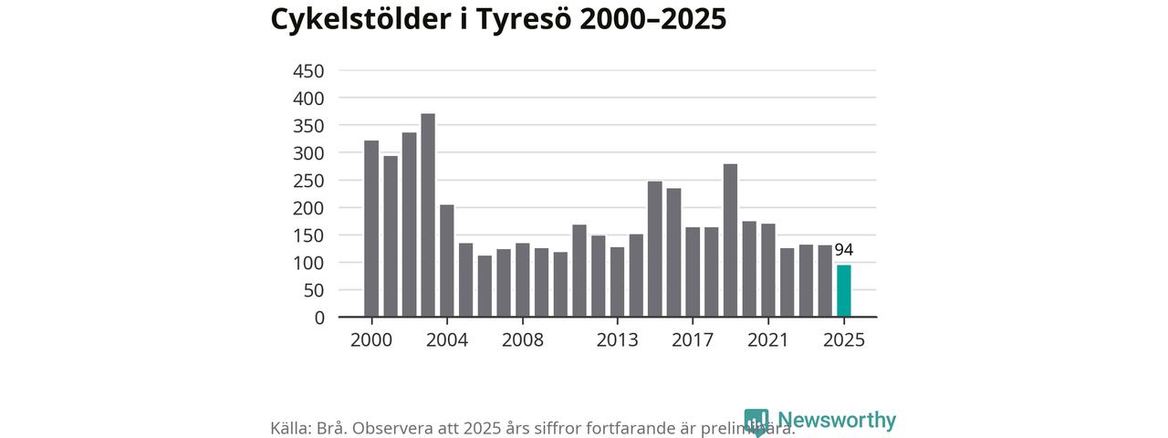 I Tyresö kommun noterades det lägsta antalet cykelstölder under hela 2000-talet år 2025, även om det fortfarande är preliminära siffror. Under de senaste 25 åren har det som mest anmälts 370 cykelstölder på ett år (2003).